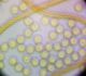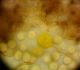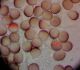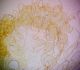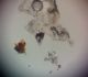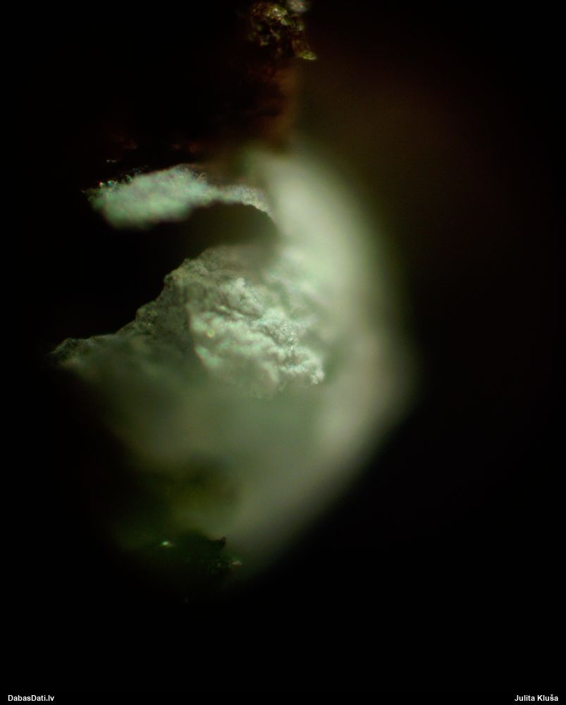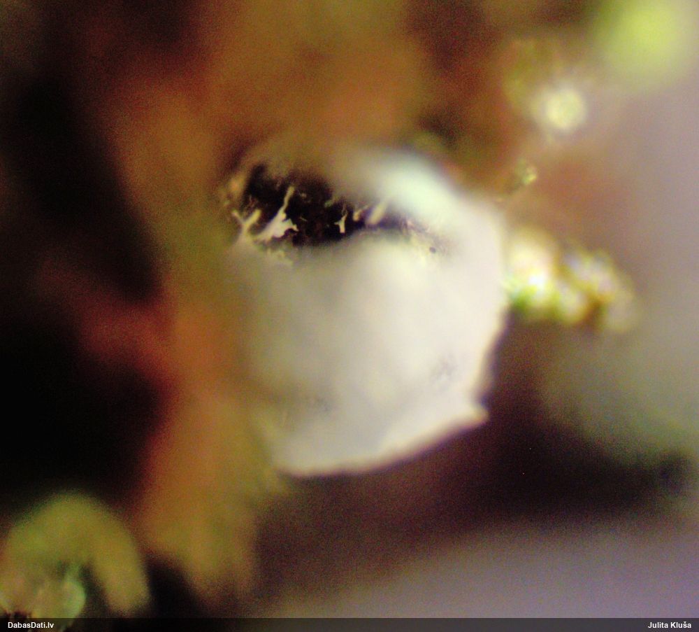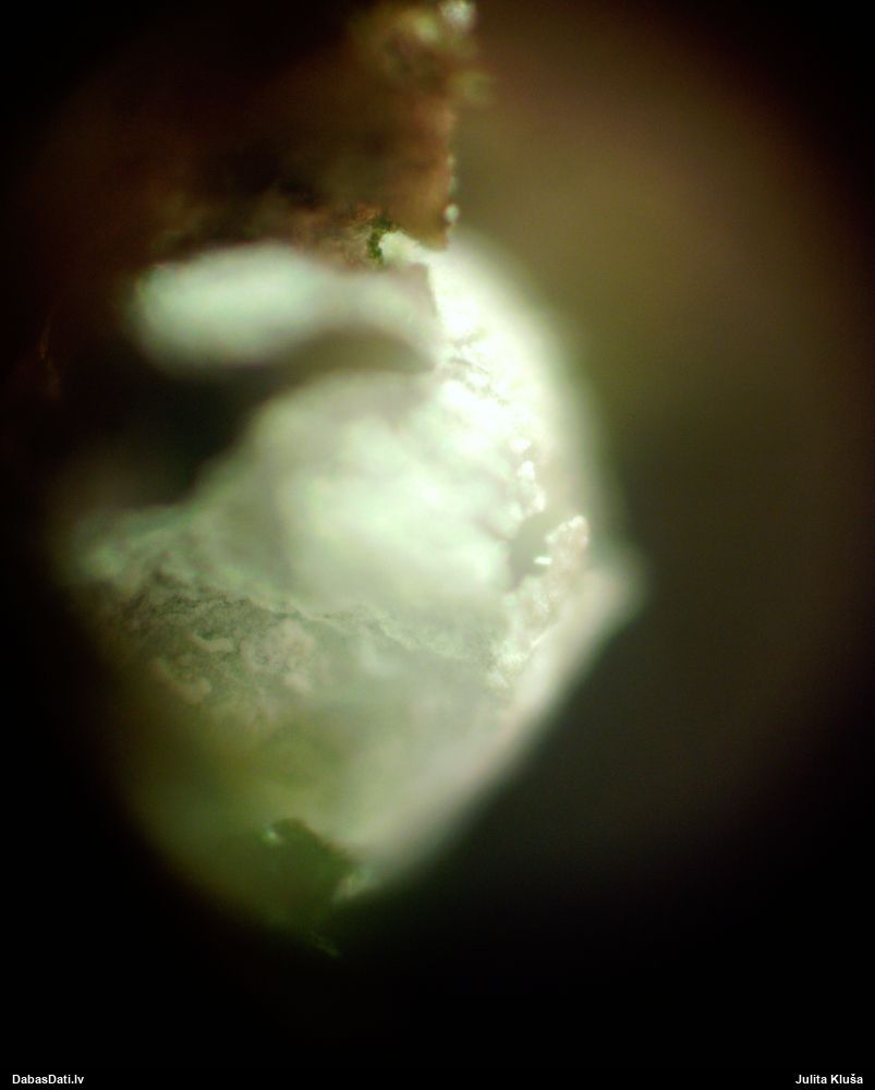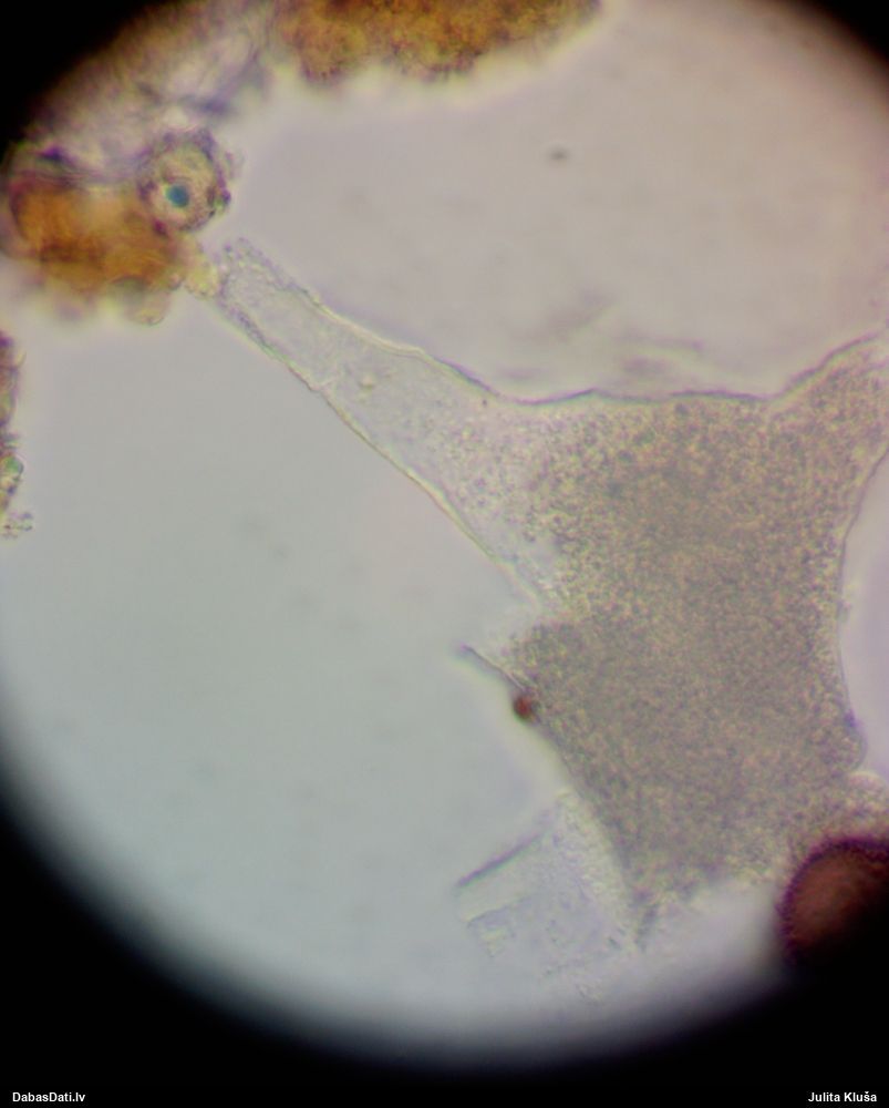 Šis bij pārsteigums. Ievācu bez cerībām, jo sakaltis. Hipotēze par gļotsēni, jo gļotaina apmale. Tā kā balts, sporu nebūs, neko zaudēt nevar, ielēju kastītē ūdeni (pat ne salvetes, vnk "dzīvu ūdeni") un aizmirsu. Krāmējoties pa kastītēm, atveru un - pārsteigums. Plānotā gļotsēne izaugusi 100x lielāka :D un izrādās sēne, kas mitrumā beidzot uzbriedusi. Kā tādu mikroskopēt, gan nezinu, jo tur tak receklis.. Tā ka vai pēdējie 2 mikro-foto par tēmu - nezinu.