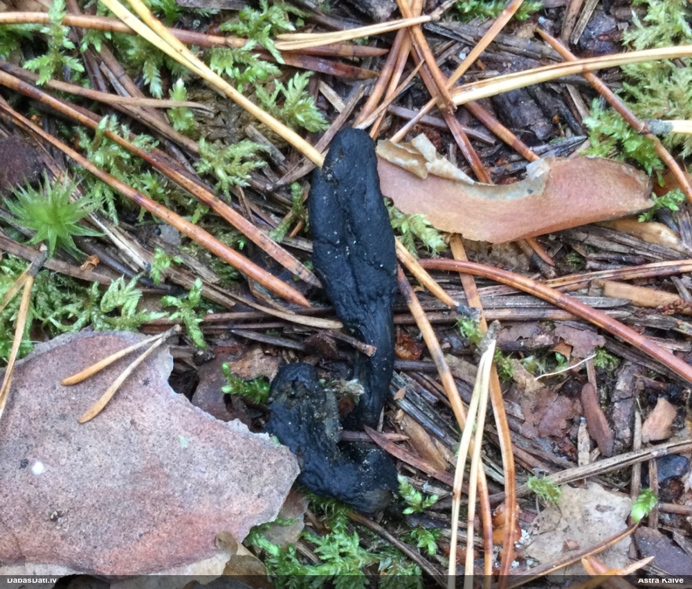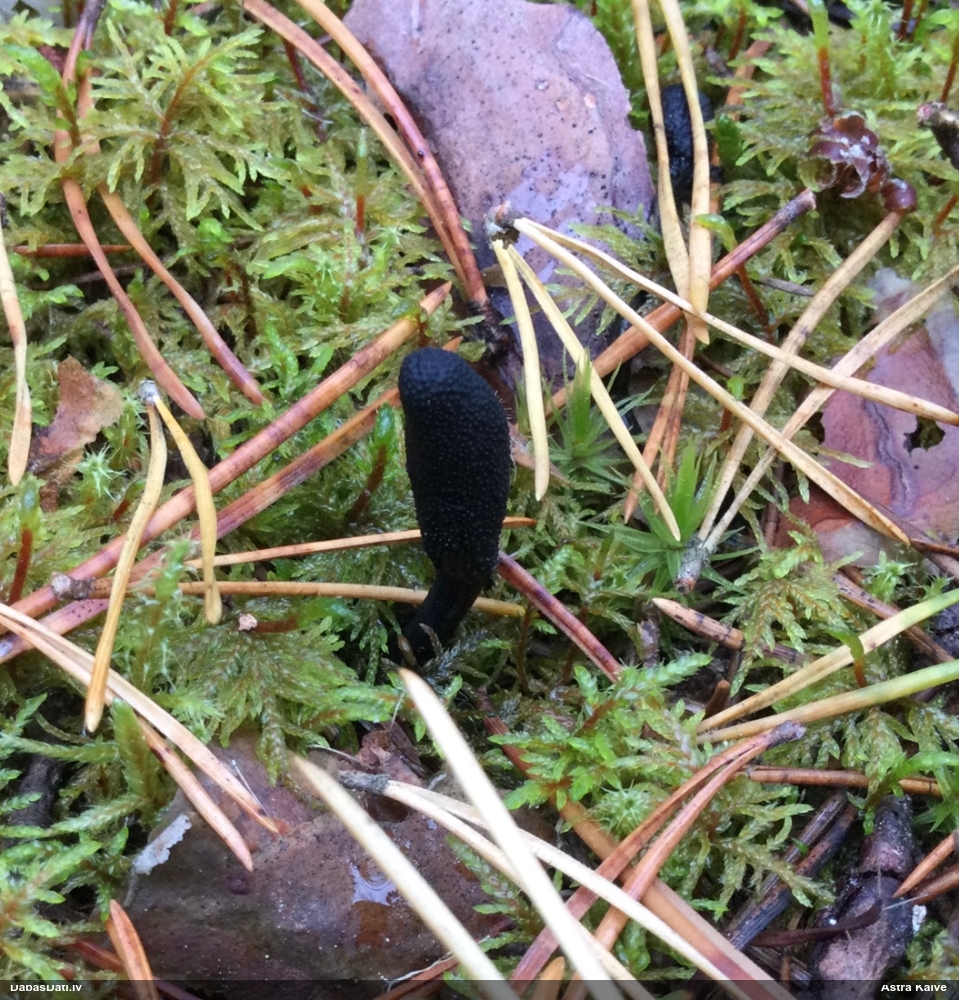 Šis interesants. Uz sausām priedes kritalām rozā mazi līdzīga izskata augļķermeņi maijā aug divām citādi atšķirīgām sugām (dažādās dzimtās) - melnajai plaispikai Amaurochaete atra un trauslajam gļotpūpēdim Reticularia jurana. Pēc sīkām mikropazīmēm (foto nav redzama pat ne sīka balta pakāje ap augļķermeni, un uz virsmas ar lielu piepūli var ja ne saskatīt, tad iztēloties tīklotu virsmas rakstu) izšķīros par biežāko no abām - melno plaispiku, kas tipiski aug samērā atklātās, skrajās vietās, t.sk. nesenos izcirtumos.