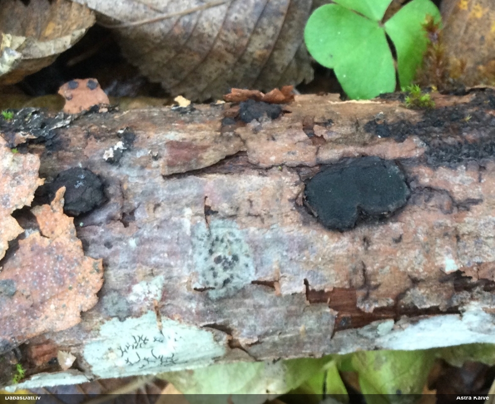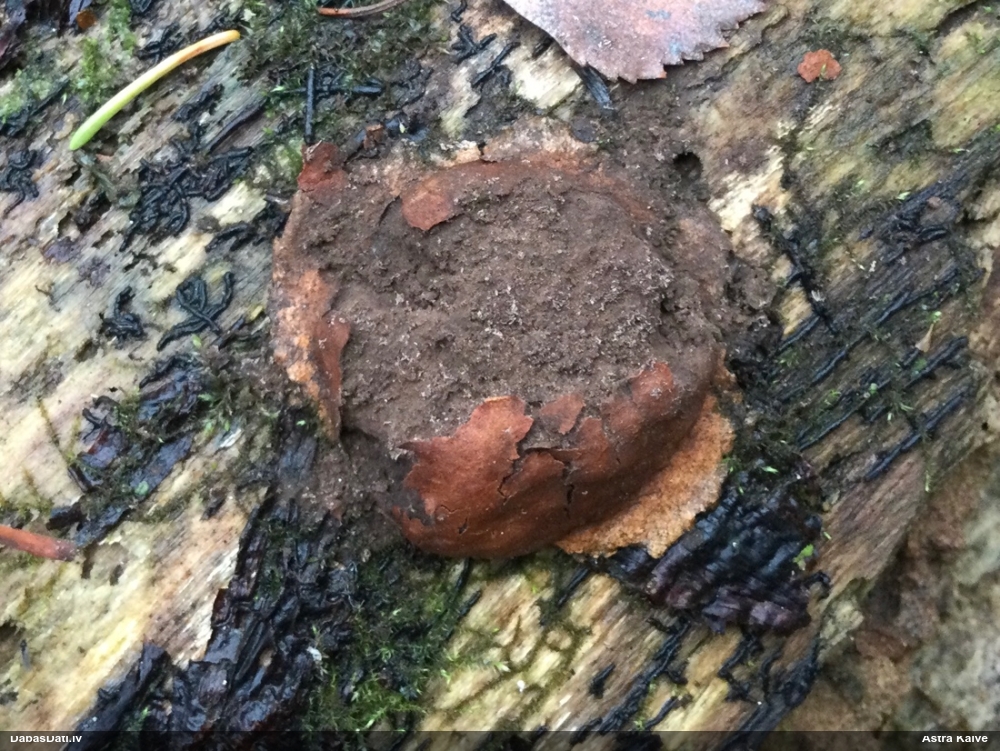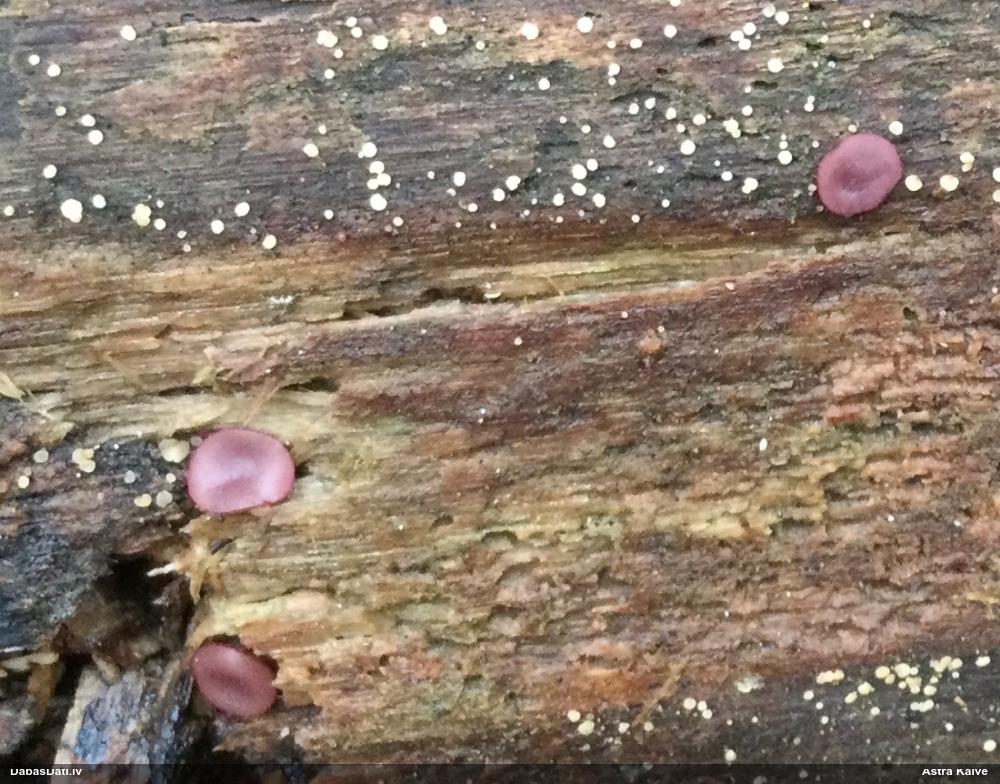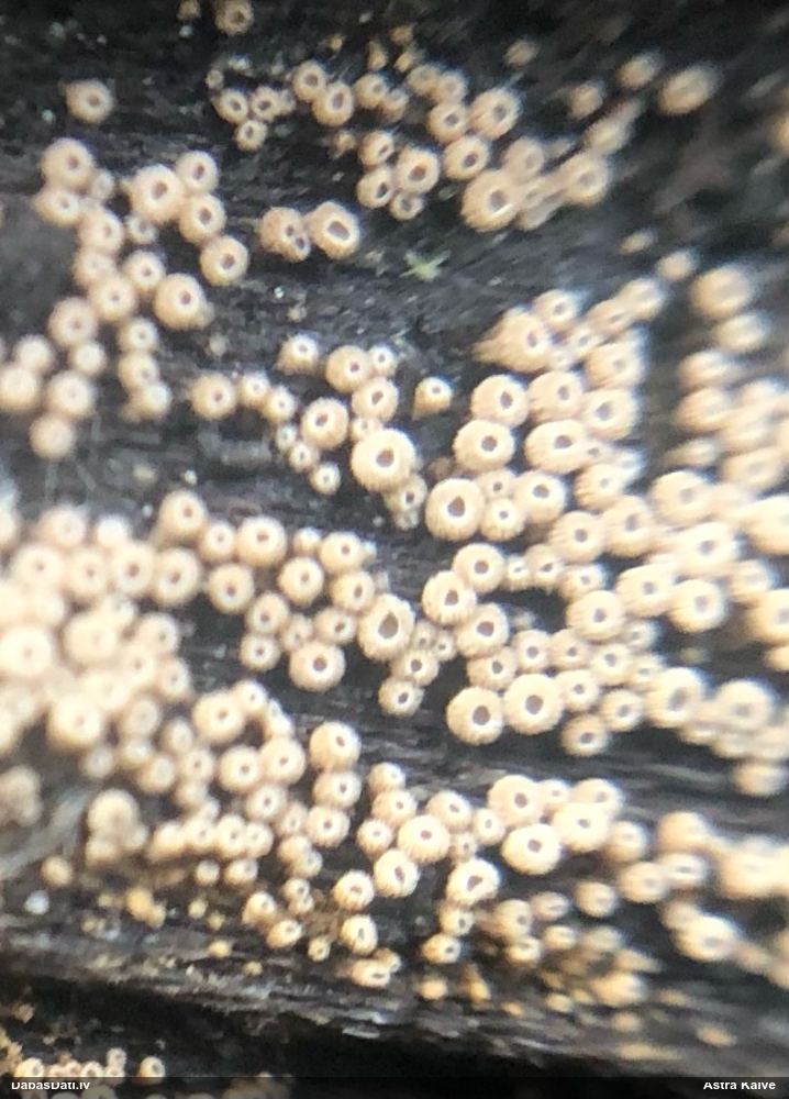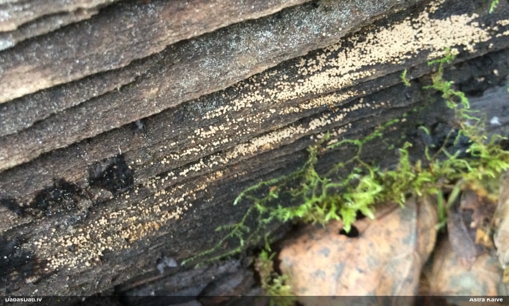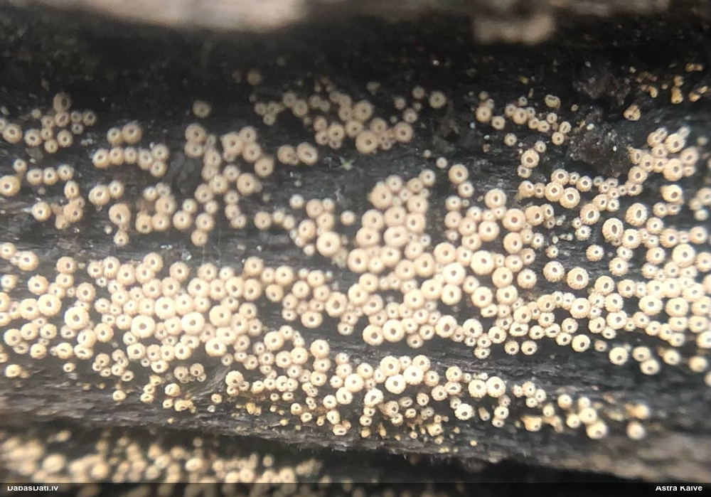 Nevar saprast, uz kā auga - vai tas ir nobirās, vai uz kritalas mizas? Abas hipotēzes ir "pa tēmu", bet man "nepatīk" kopskats, kur skaidri redzams, ka vairāki augļķermeņi ir cieši kopā, bet tas nav raksturīgs ne vienai, ne otrai hipotēzei, kur augļķermeņi tipiski ir nodalīti. Ļoti interesanti, ja ir paraugs, tad kāds tas izskatās tagad, un vispār to vajadzētu mikroskopēt.