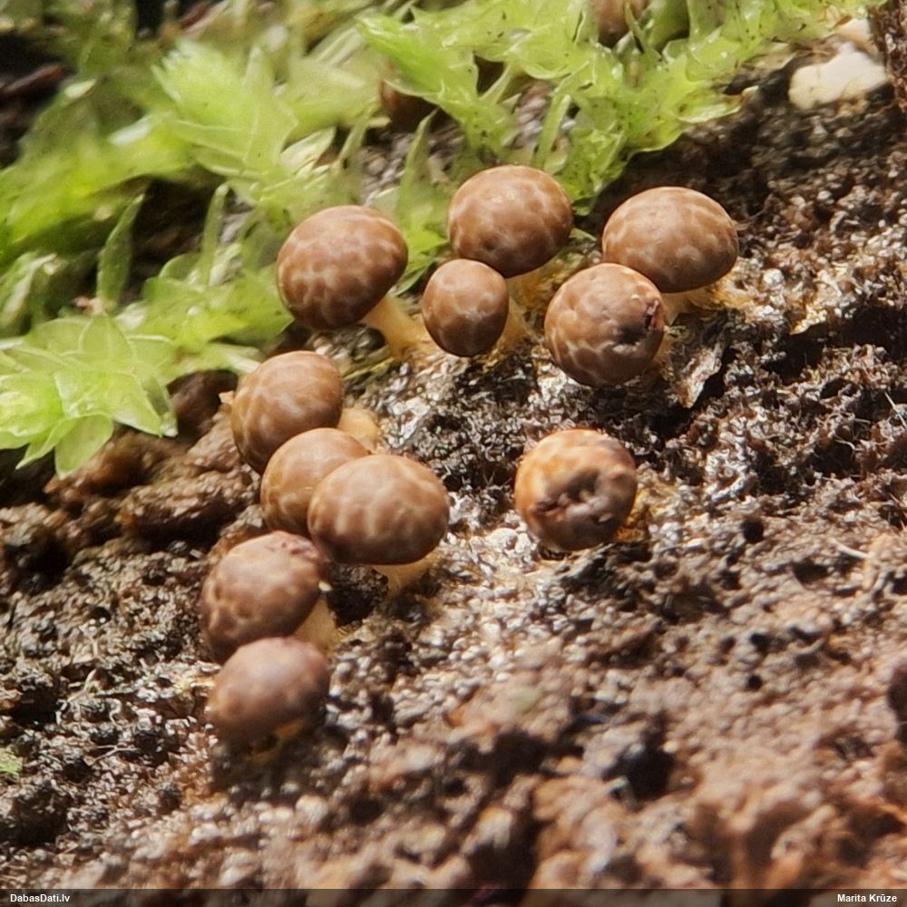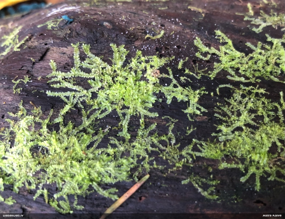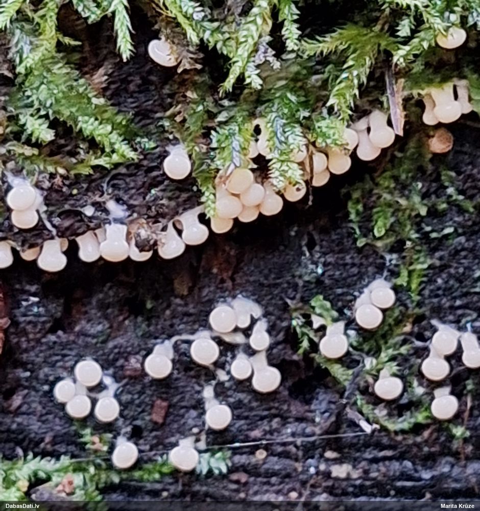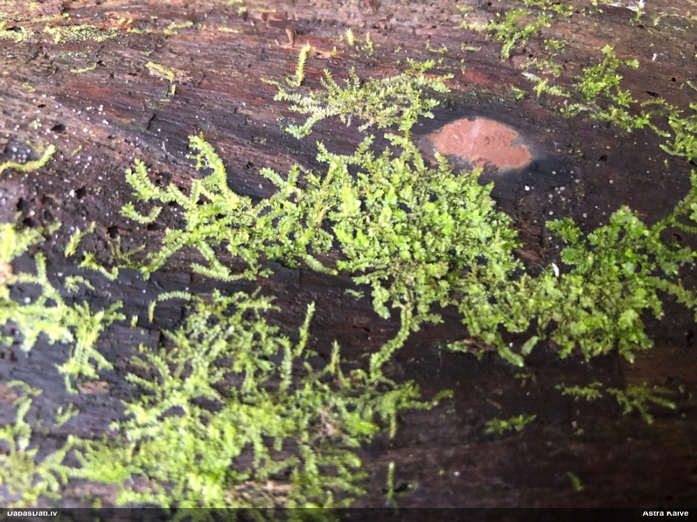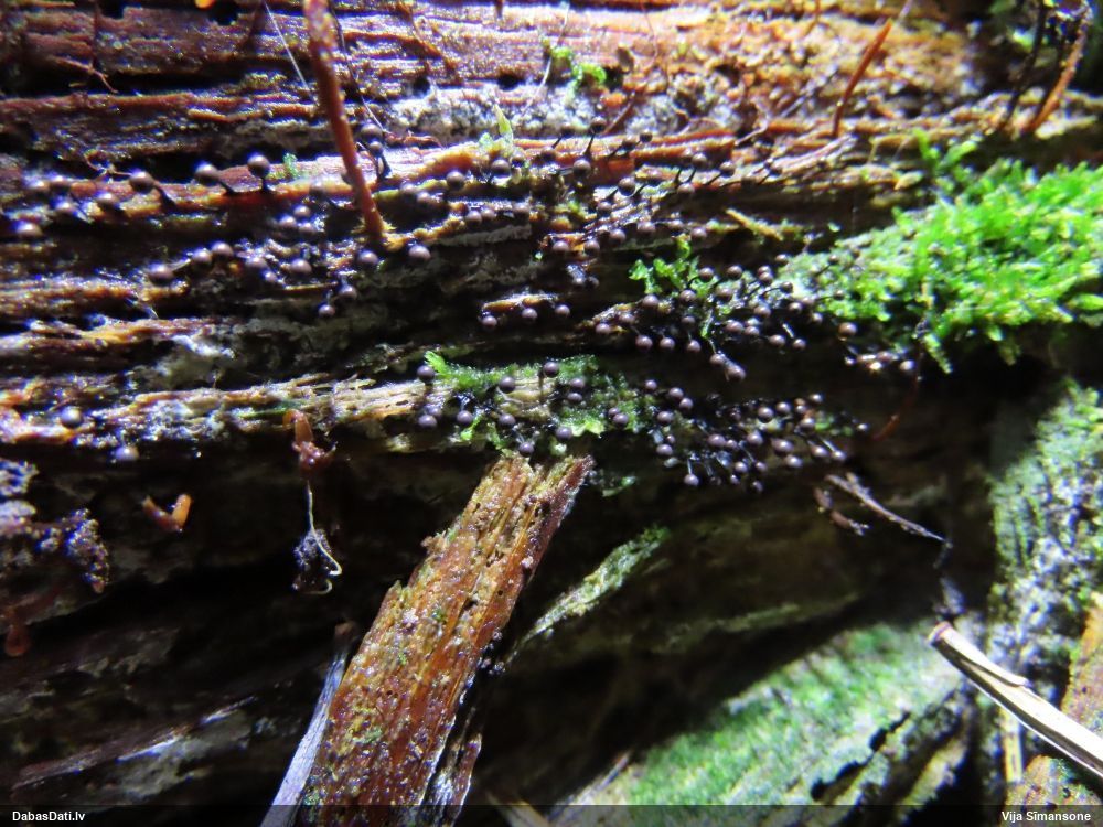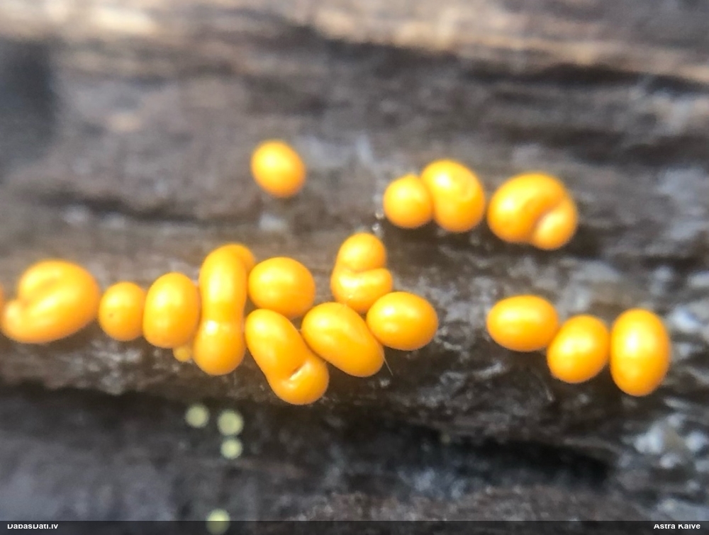 Paldies, Raivo! Ar acu gaišumu man arvien sliktāk, bet mikroskops palīdz. Jā, gribēju teikt, ka paraugam, ja vien nav kāda jutīga atradne, kurai drīkst ievākt tikai mazu gabaliņu, vērts ievākt lielāku gabalu, jo gļotsēnēm patīk kompānija. Un mikroskopa mazajos palielinājumos ar sānu papildus apgaismojumu ir vērts rūpīgi "izstaigāt" visu paraugu. Arī ķērpjus un interesantas sīksēnītes tā var atrast, ko dabā nepamanītu. Ar kriksītēm ir dažādi - pirmās es tā arī tikai citu sugu paraugos pamanīju, bet vēlāk redzēju arī dabā kriskīšu plantācijas - ja to ir daudz, tad var pamanīt jau dabā. Uz sūnām gan ir ekstrēms gadījums, dabā droši nepamanītu, arī eksemplāra noņemšana no sūnas nebija pārāk veiksmīga, tāpēc par noteikšanu mazliet šaubos (sporām mazliet cits tonis). Bet pagaidām citas hipotēzes nav (un konkrētā eksemplāra arī vairs ne).