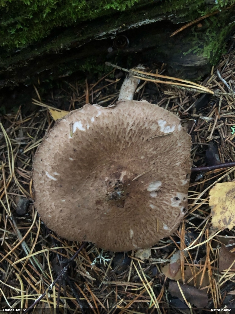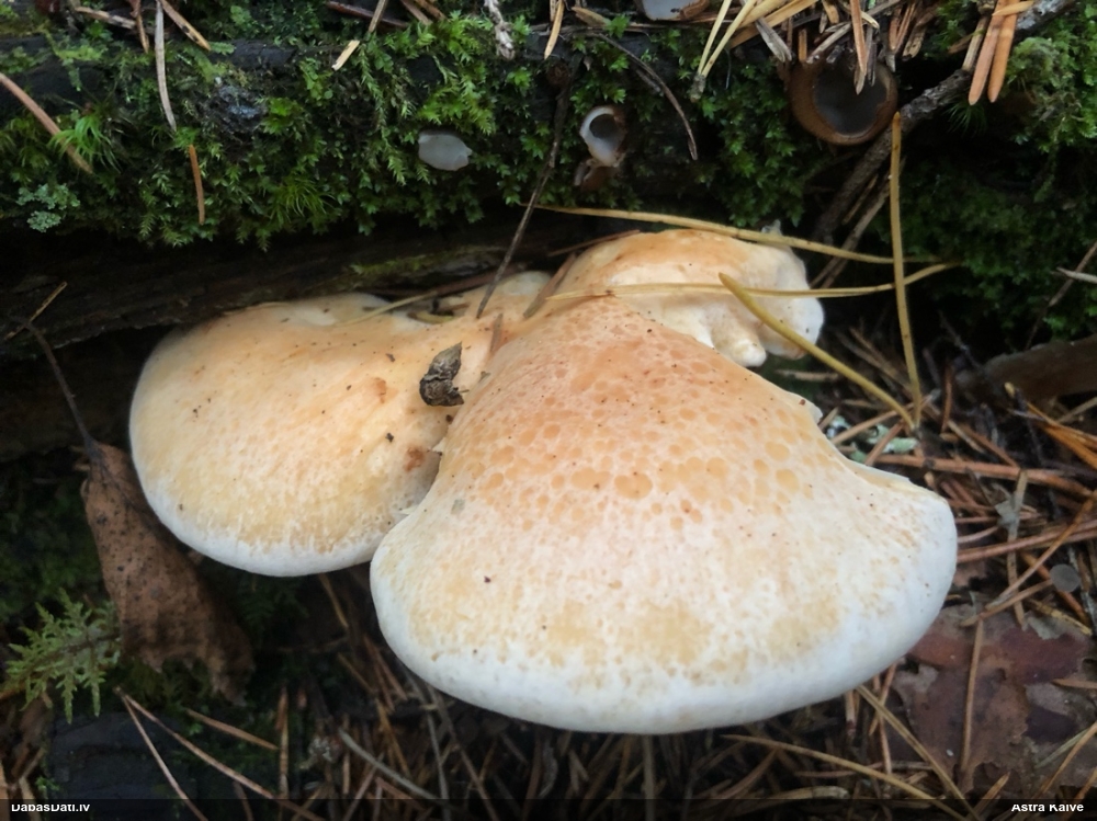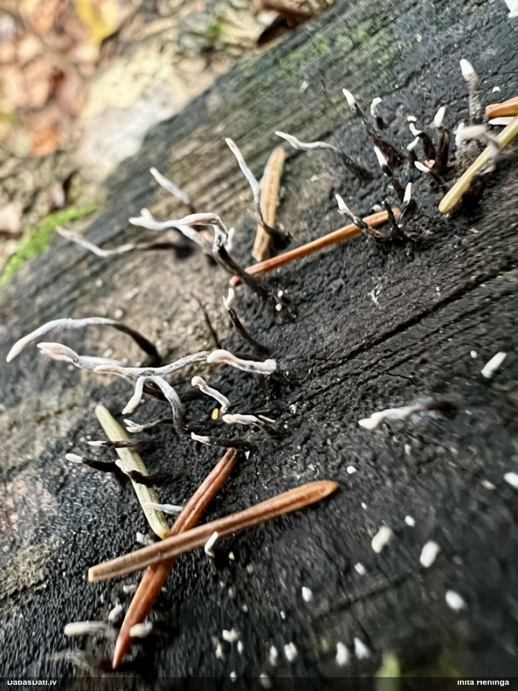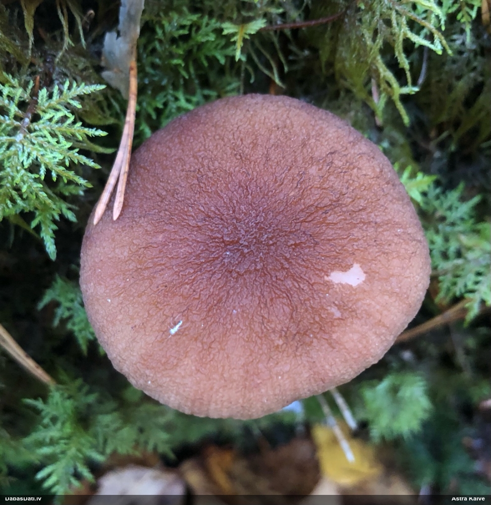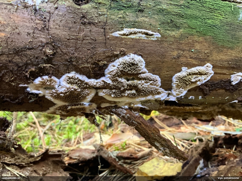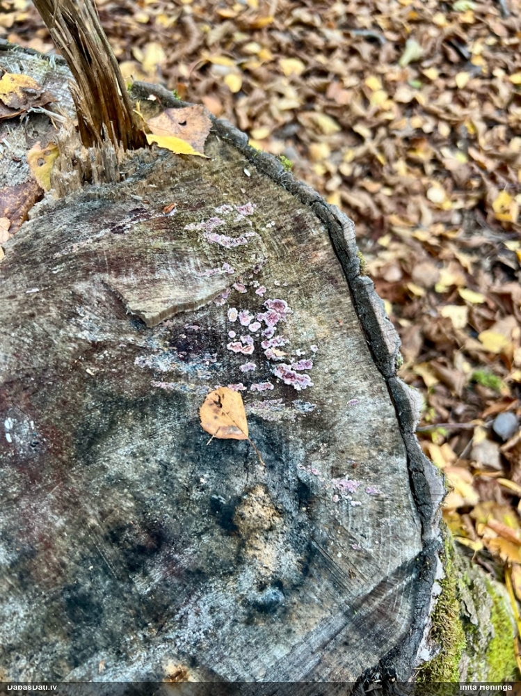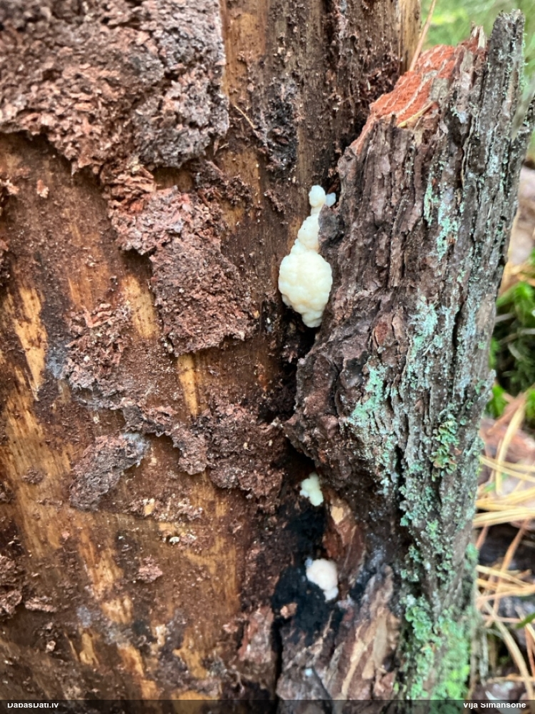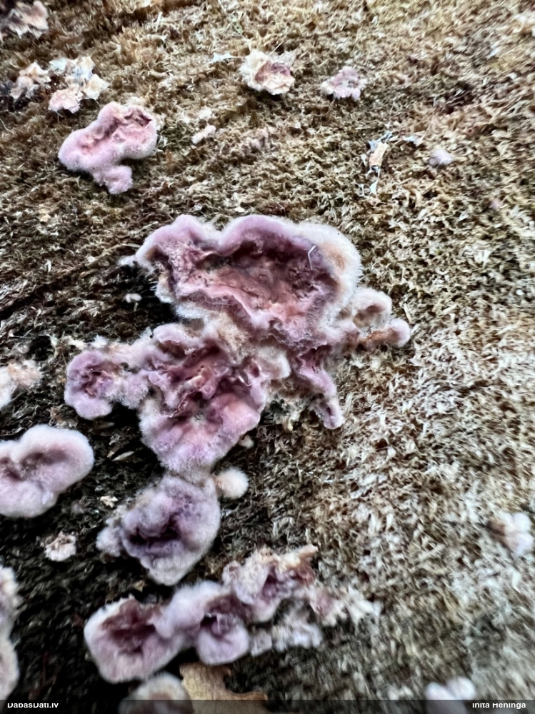 Nevar saprast, uz kā auga - vai tas ir nobirās, vai uz kritalas mizas? Abas hipotēzes ir "pa tēmu", bet man "nepatīk" kopskats, kur skaidri redzams, ka vairāki augļķermeņi ir cieši kopā, bet tas nav raksturīgs ne vienai, ne otrai hipotēzei, kur augļķermeņi tipiski ir nodalīti. Ļoti interesanti, ja ir paraugs, tad kāds tas izskatās tagad, un vispār to vajadzētu mikroskopēt.
