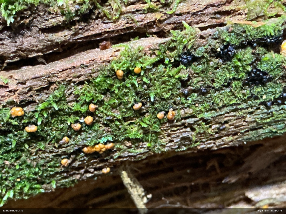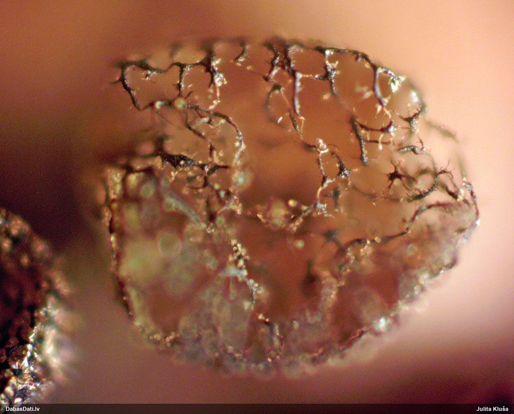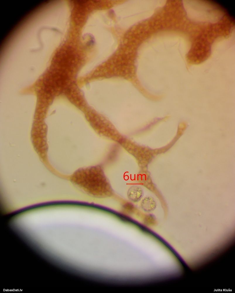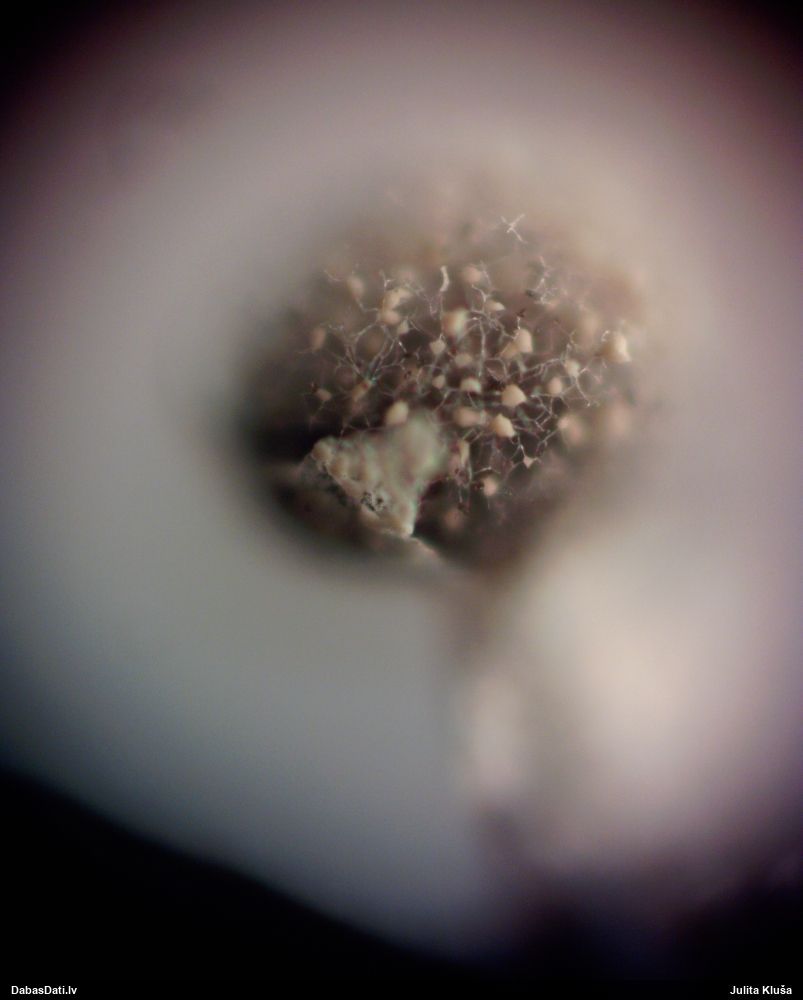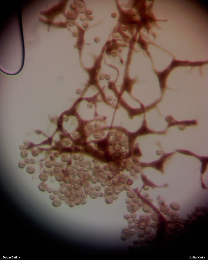 Paldies, Raivo! Ar acu gaišumu man arvien sliktāk, bet mikroskops palīdz. Jā, gribēju teikt, ka paraugam, ja vien nav kāda jutīga atradne, kurai drīkst ievākt tikai mazu gabaliņu, vērts ievākt lielāku gabalu, jo gļotsēnēm patīk kompānija. Un mikroskopa mazajos palielinājumos ar sānu papildus apgaismojumu ir vērts rūpīgi "izstaigāt" visu paraugu. Arī ķērpjus un interesantas sīksēnītes tā var atrast, ko dabā nepamanītu. Ar kriksītēm ir dažādi - pirmās es tā arī tikai citu sugu paraugos pamanīju, bet vēlāk redzēju arī dabā kriskīšu plantācijas - ja to ir daudz, tad var pamanīt jau dabā. Uz sūnām gan ir ekstrēms gadījums, dabā droši nepamanītu, arī eksemplāra noņemšana no sūnas nebija pārāk veiksmīga, tāpēc par noteikšanu mazliet šaubos (sporām mazliet cits tonis). Bet pagaidām citas hipotēzes nav (un konkrētā eksemplāra arī vairs ne).