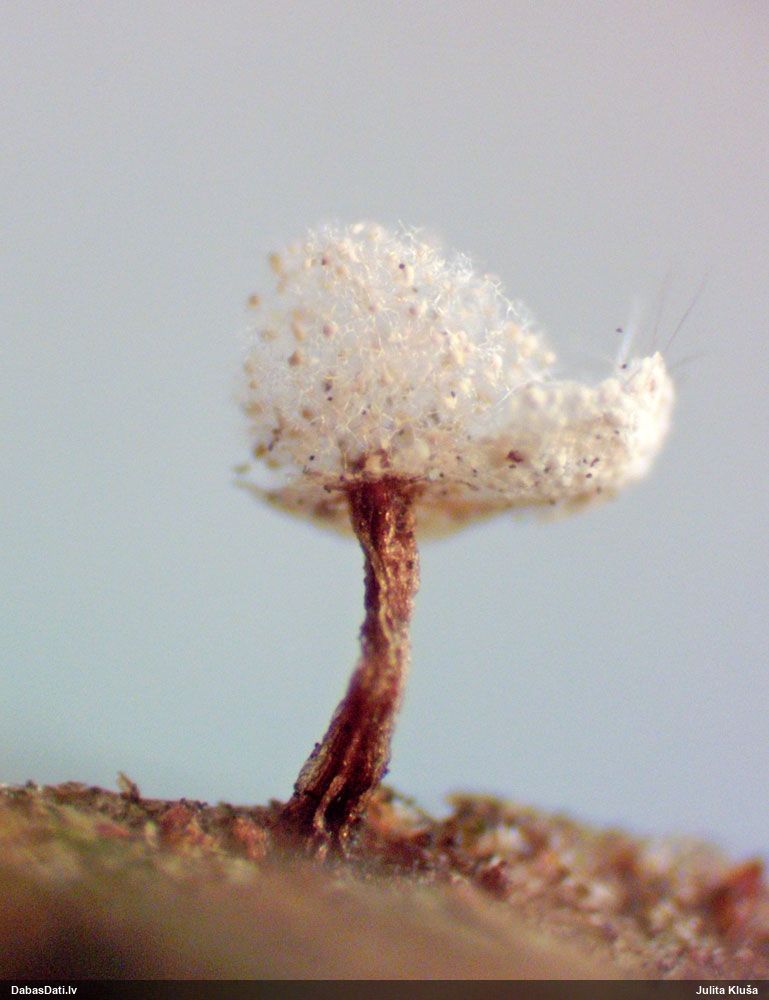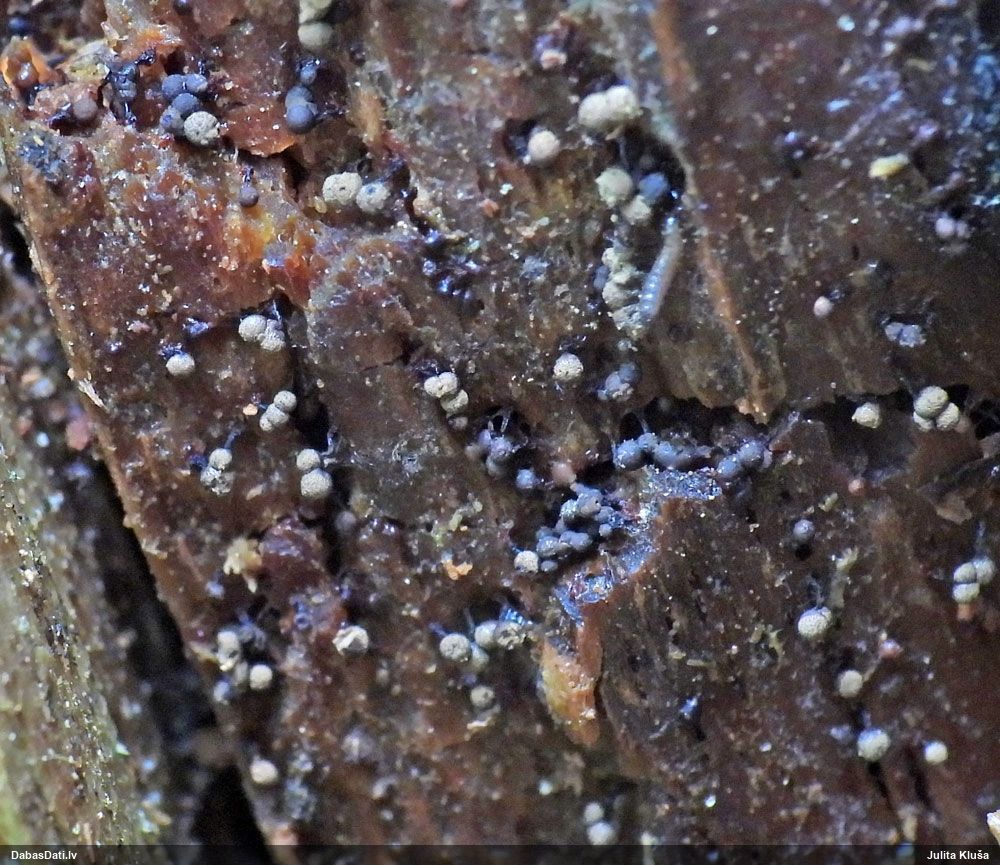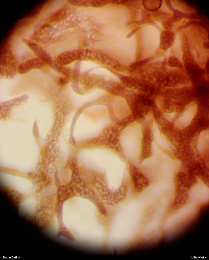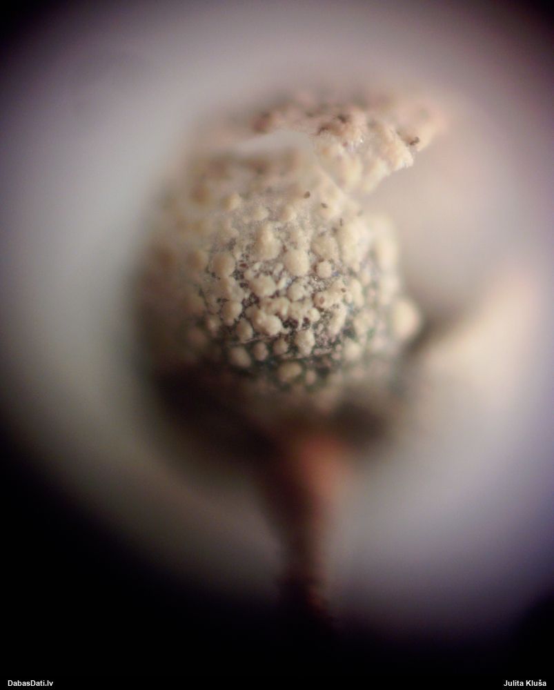 Paldies, Raivo! Ar acu gaišumu man arvien sliktāk, bet mikroskops palīdz. Jā, gribēju teikt, ka paraugam, ja vien nav kāda jutīga atradne, kurai drīkst ievākt tikai mazu gabaliņu, vērts ievākt lielāku gabalu, jo gļotsēnēm patīk kompānija. Un mikroskopa mazajos palielinājumos ar sānu papildus apgaismojumu ir vērts rūpīgi "izstaigāt" visu paraugu. Arī ķērpjus un interesantas sīksēnītes tā var atrast, ko dabā nepamanītu. Ar kriksītēm ir dažādi - pirmās es tā arī tikai citu sugu paraugos pamanīju, bet vēlāk redzēju arī dabā kriskīšu plantācijas - ja to ir daudz, tad var pamanīt jau dabā. Uz sūnām gan ir ekstrēms gadījums, dabā droši nepamanītu, arī eksemplāra noņemšana no sūnas nebija pārāk veiksmīga, tāpēc par noteikšanu mazliet šaubos (sporām mazliet cits tonis). Bet pagaidām citas hipotēzes nav (un konkrētā eksemplāra arī vairs ne).