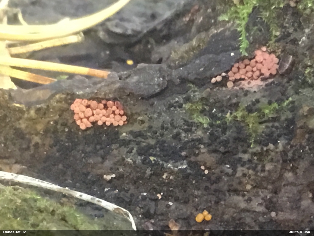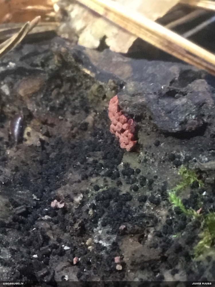 Šis interesants. Uz sausām priedes kritalām rozā mazi līdzīga izskata augļķermeņi maijā aug divām citādi atšķirīgām sugām (dažādās dzimtās) - melnajai plaispikai Amaurochaete atra un trauslajam gļotpūpēdim Reticularia jurana. Pēc sīkām mikropazīmēm (foto nav redzama pat ne sīka balta pakāje ap augļķermeni, un uz virsmas ar lielu piepūli var ja ne saskatīt, tad iztēloties tīklotu virsmas rakstu) izšķīros par biežāko no abām - melno plaispiku, kas tipiski aug samērā atklātās, skrajās vietās, t.sk. nesenos izcirtumos.