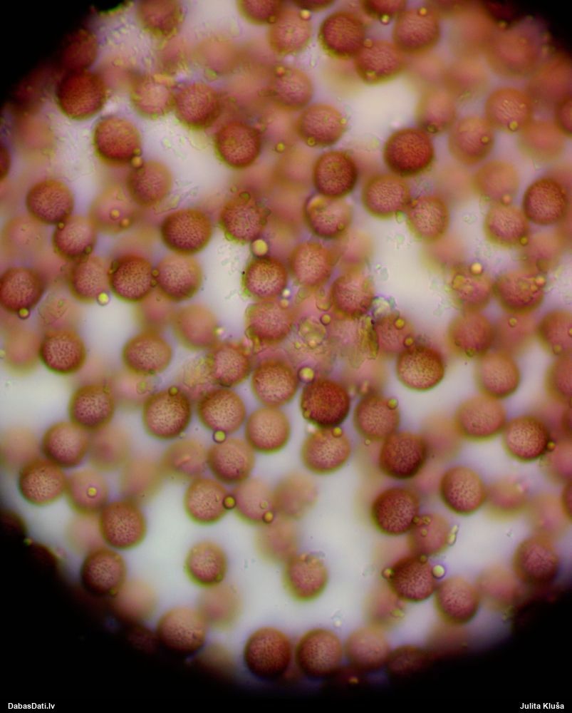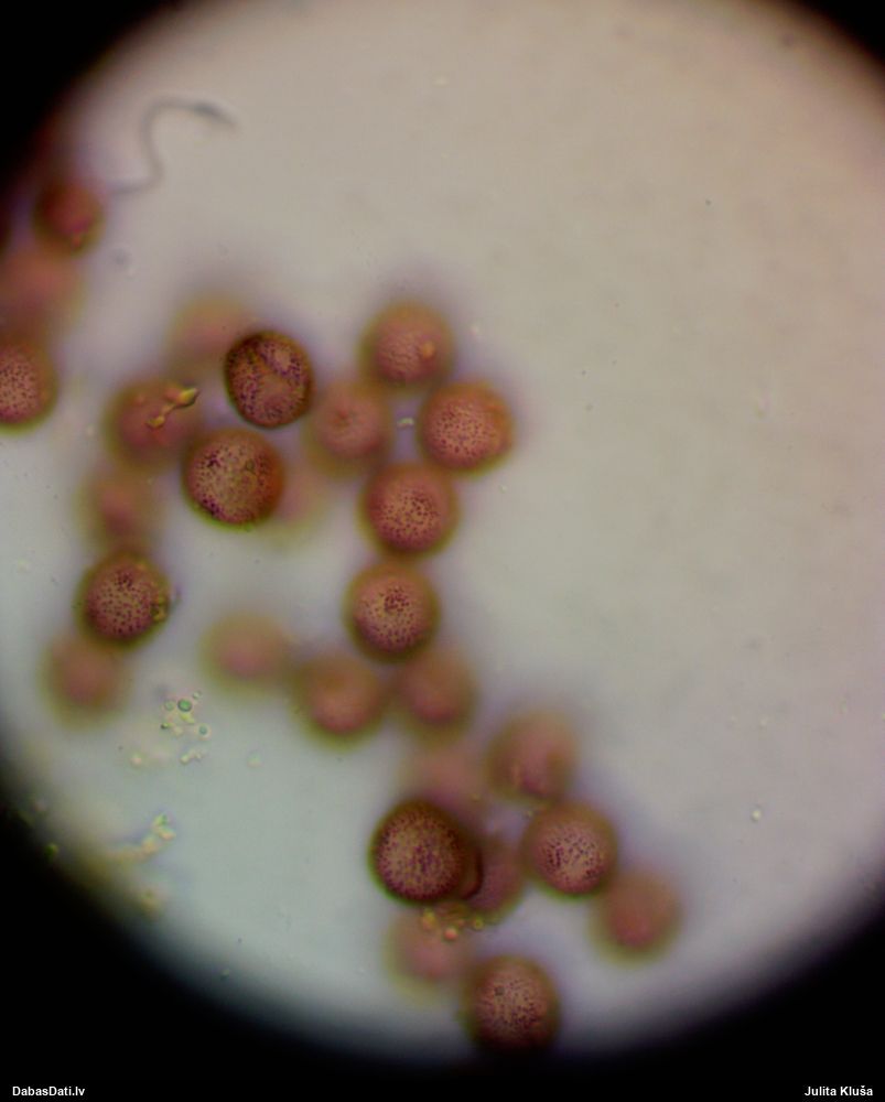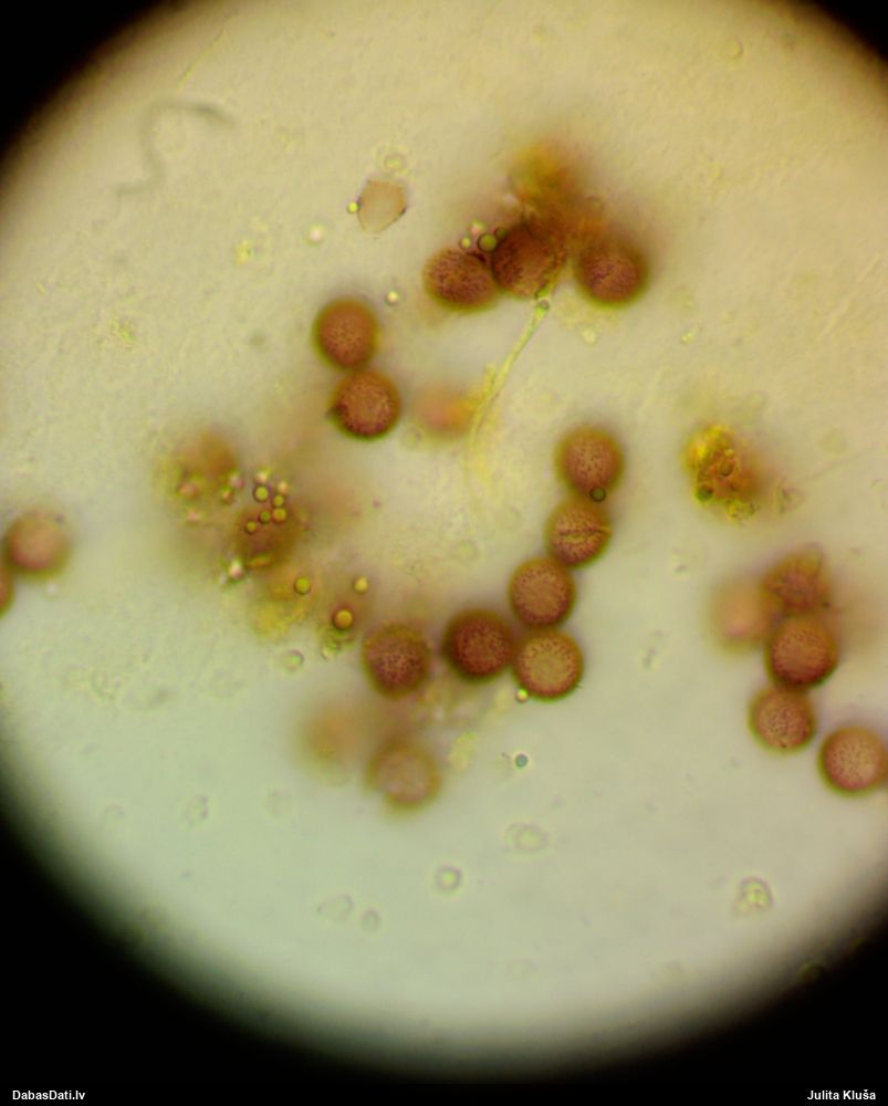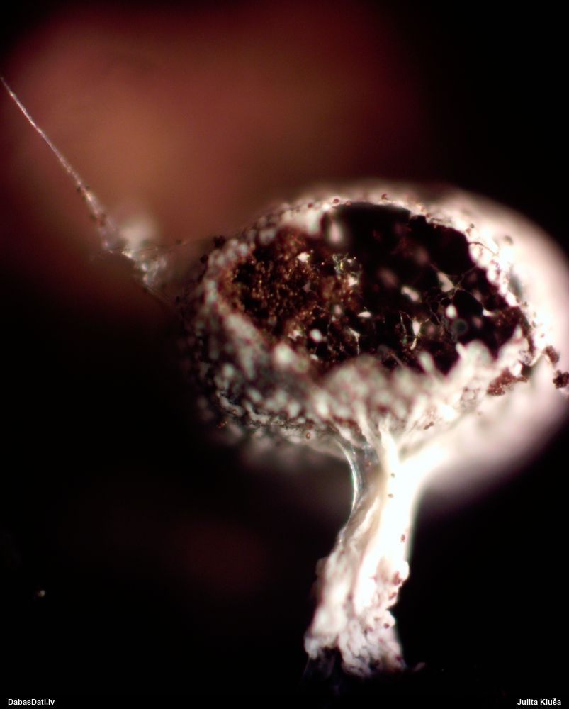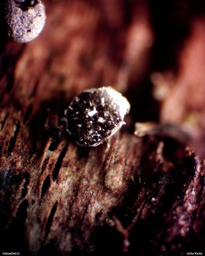 Paldies, Raivo! Ar acu gaišumu man arvien sliktāk, bet mikroskops palīdz. Jā, gribēju teikt, ka paraugam, ja vien nav kāda jutīga atradne, kurai drīkst ievākt tikai mazu gabaliņu, vērts ievākt lielāku gabalu, jo gļotsēnēm patīk kompānija. Un mikroskopa mazajos palielinājumos ar sānu papildus apgaismojumu ir vērts rūpīgi "izstaigāt" visu paraugu. Arī ķērpjus un interesantas sīksēnītes tā var atrast, ko dabā nepamanītu. Ar kriksītēm ir dažādi - pirmās es tā arī tikai citu sugu paraugos pamanīju, bet vēlāk redzēju arī dabā kriskīšu plantācijas - ja to ir daudz, tad var pamanīt jau dabā. Uz sūnām gan ir ekstrēms gadījums, dabā droši nepamanītu, arī eksemplāra noņemšana no sūnas nebija pārāk veiksmīga, tāpēc par noteikšanu mazliet šaubos (sporām mazliet cits tonis). Bet pagaidām citas hipotēzes nav (un konkrētā eksemplāra arī vairs ne).