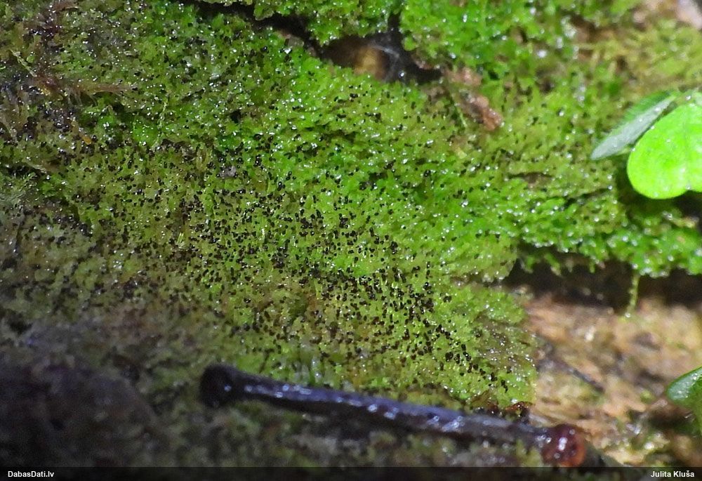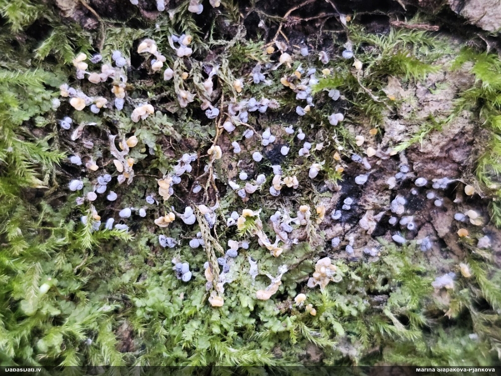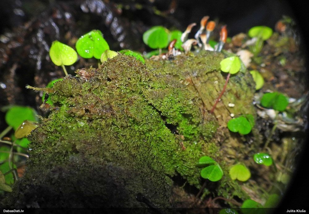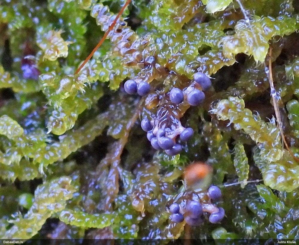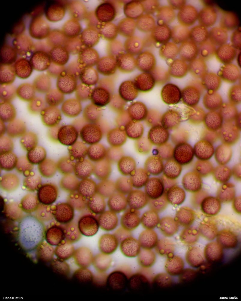 Paldies, Raivo! Ar acu gaišumu man arvien sliktāk, bet mikroskops palīdz. Jā, gribēju teikt, ka paraugam, ja vien nav kāda jutīga atradne, kurai drīkst ievākt tikai mazu gabaliņu, vērts ievākt lielāku gabalu, jo gļotsēnēm patīk kompānija. Un mikroskopa mazajos palielinājumos ar sānu papildus apgaismojumu ir vērts rūpīgi "izstaigāt" visu paraugu. Arī ķērpjus un interesantas sīksēnītes tā var atrast, ko dabā nepamanītu. Ar kriksītēm ir dažādi - pirmās es tā arī tikai citu sugu paraugos pamanīju, bet vēlāk redzēju arī dabā kriskīšu plantācijas - ja to ir daudz, tad var pamanīt jau dabā. Uz sūnām gan ir ekstrēms gadījums, dabā droši nepamanītu, arī eksemplāra noņemšana no sūnas nebija pārāk veiksmīga, tāpēc par noteikšanu mazliet šaubos (sporām mazliet cits tonis). Bet pagaidām citas hipotēzes nav (un konkrētā eksemplāra arī vairs ne).