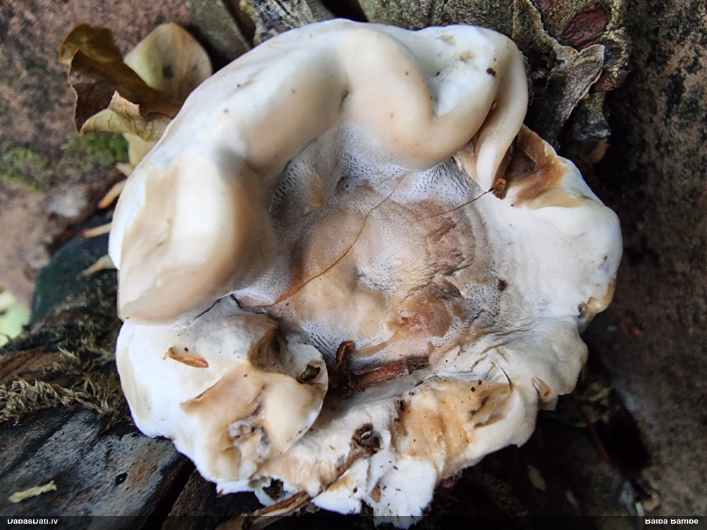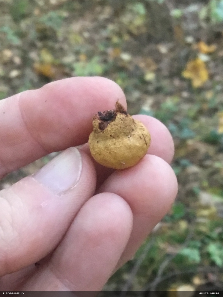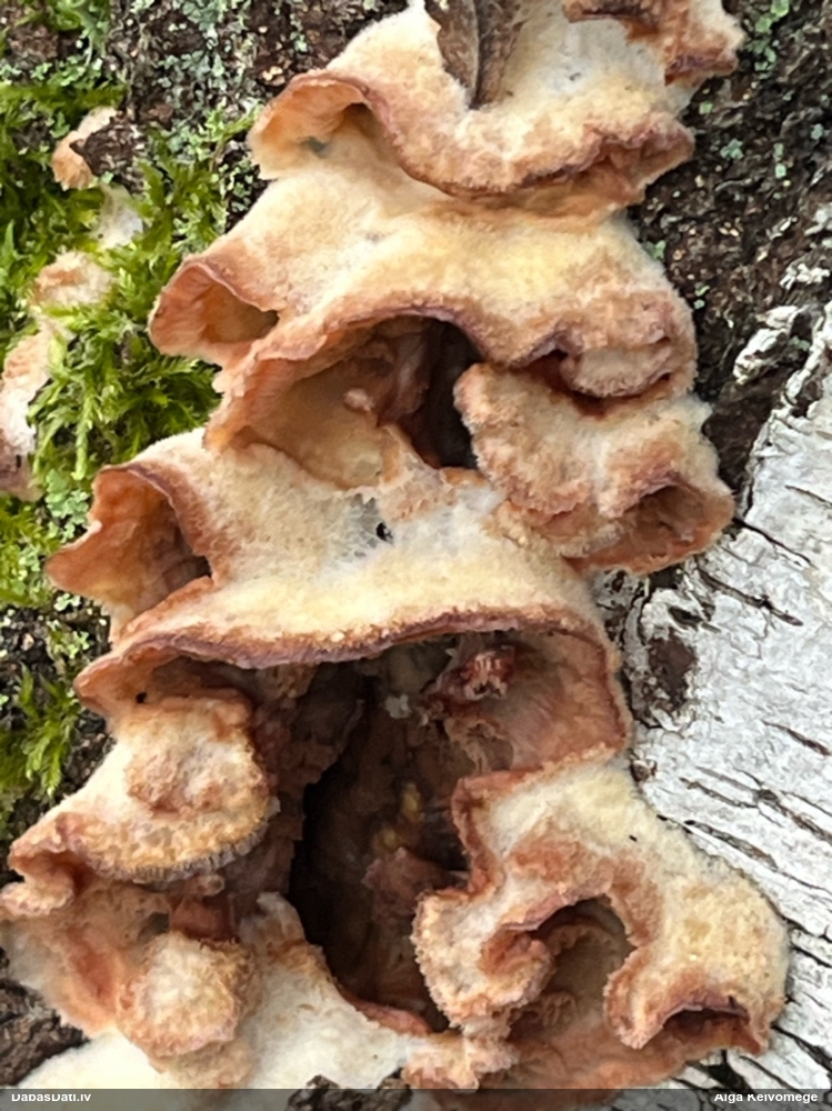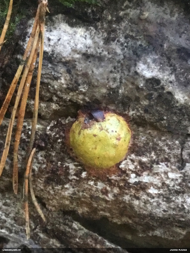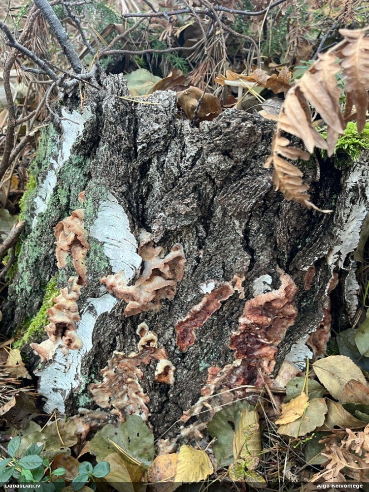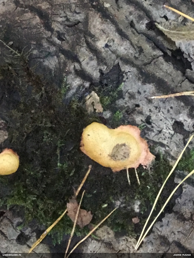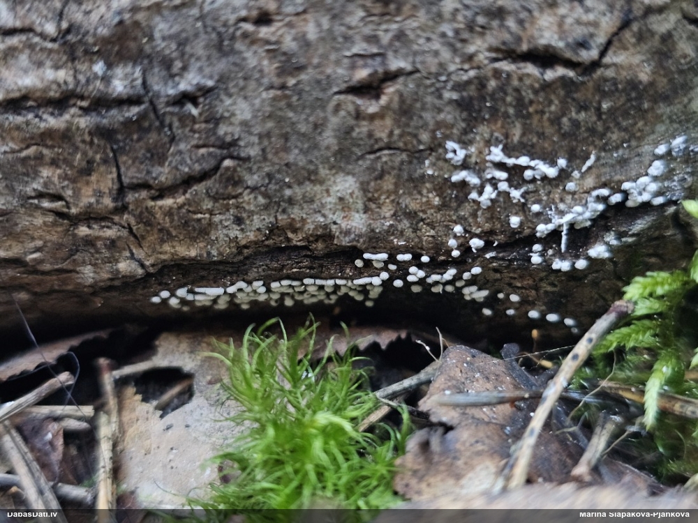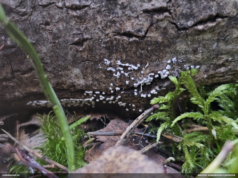 Nevar saprast, uz kā auga - vai tas ir nobirās, vai uz kritalas mizas? Abas hipotēzes ir "pa tēmu", bet man "nepatīk" kopskats, kur skaidri redzams, ka vairāki augļķermeņi ir cieši kopā, bet tas nav raksturīgs ne vienai, ne otrai hipotēzei, kur augļķermeņi tipiski ir nodalīti. Ļoti interesanti, ja ir paraugs, tad kāds tas izskatās tagad, un vispār to vajadzētu mikroskopēt.
