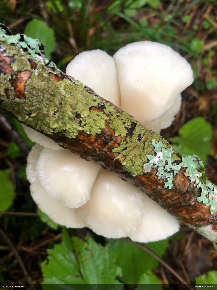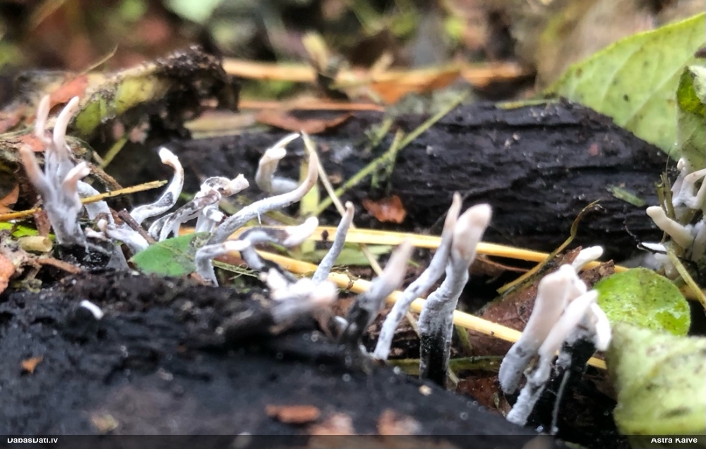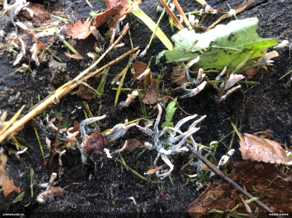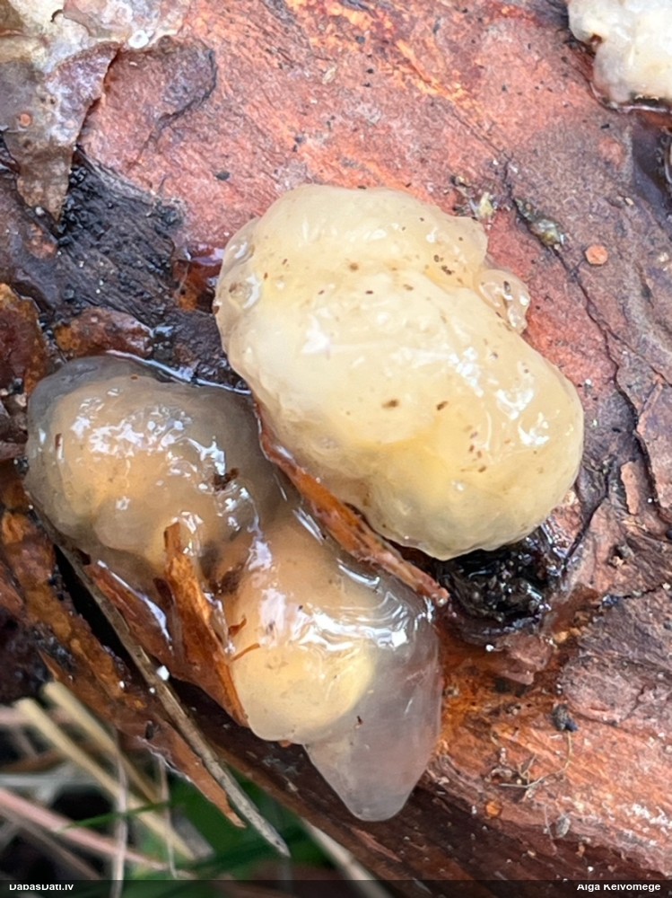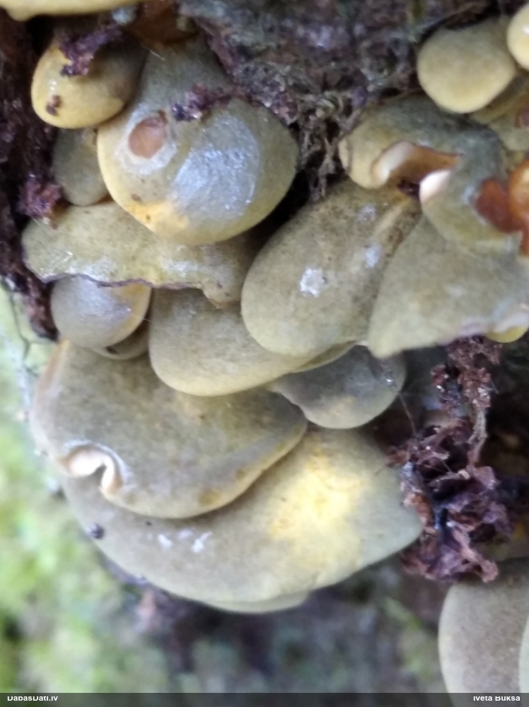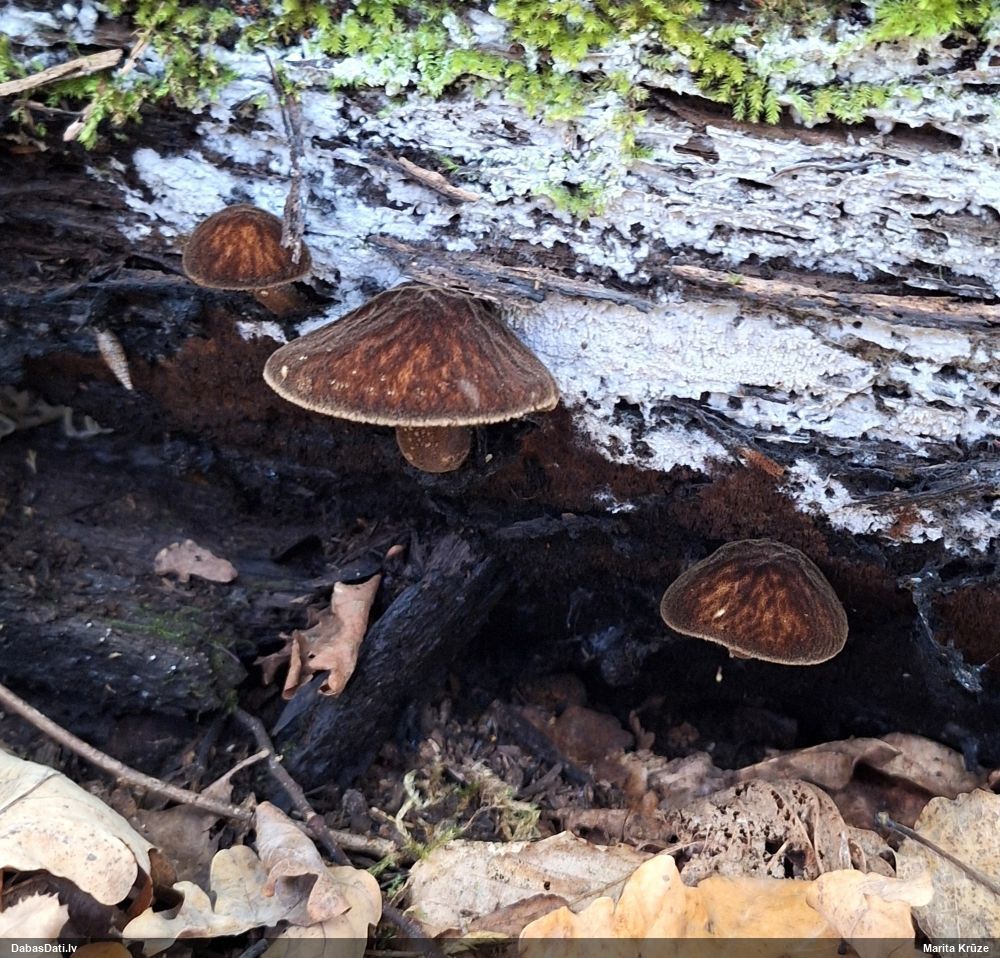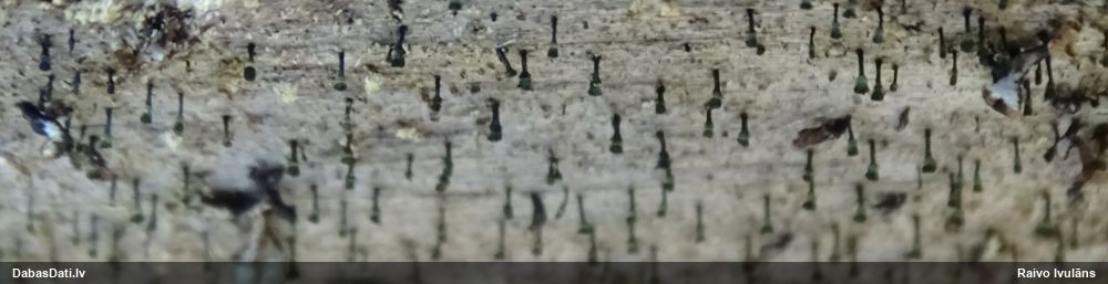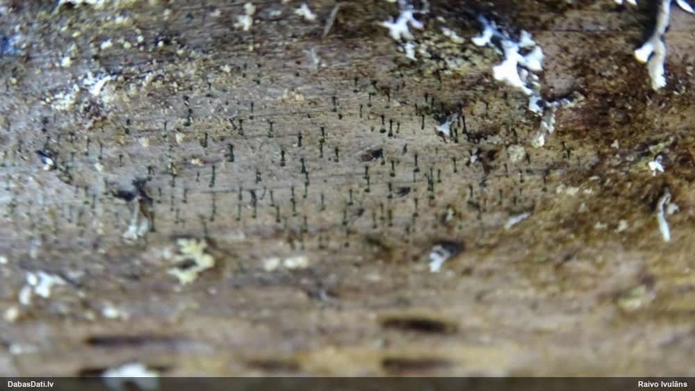 Nevar saprast, uz kā auga - vai tas ir nobirās, vai uz kritalas mizas? Abas hipotēzes ir "pa tēmu", bet man "nepatīk" kopskats, kur skaidri redzams, ka vairāki augļķermeņi ir cieši kopā, bet tas nav raksturīgs ne vienai, ne otrai hipotēzei, kur augļķermeņi tipiski ir nodalīti. Ļoti interesanti, ja ir paraugs, tad kāds tas izskatās tagad, un vispār to vajadzētu mikroskopēt.