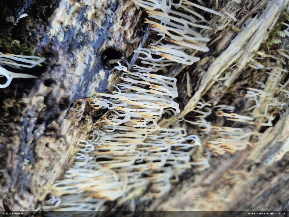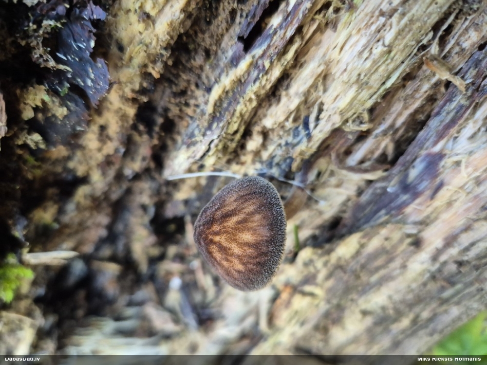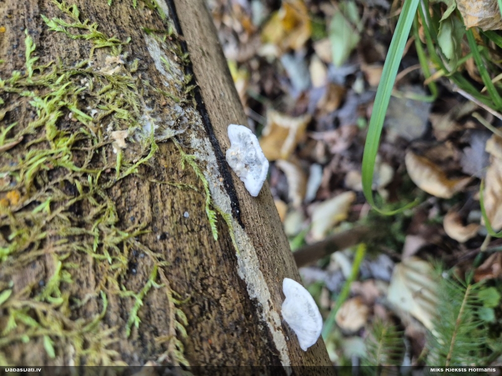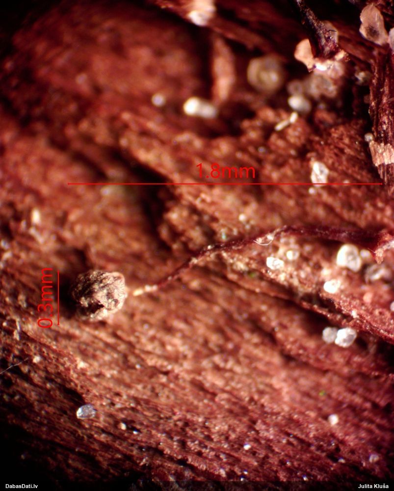 Nevar saprast, uz kā auga - vai tas ir nobirās, vai uz kritalas mizas? Abas hipotēzes ir "pa tēmu", bet man "nepatīk" kopskats, kur skaidri redzams, ka vairāki augļķermeņi ir cieši kopā, bet tas nav raksturīgs ne vienai, ne otrai hipotēzei, kur augļķermeņi tipiski ir nodalīti. Ļoti interesanti, ja ir paraugs, tad kāds tas izskatās tagad, un vispār to vajadzētu mikroskopēt.