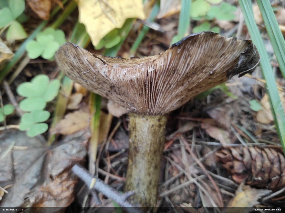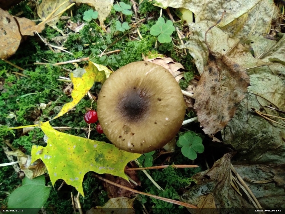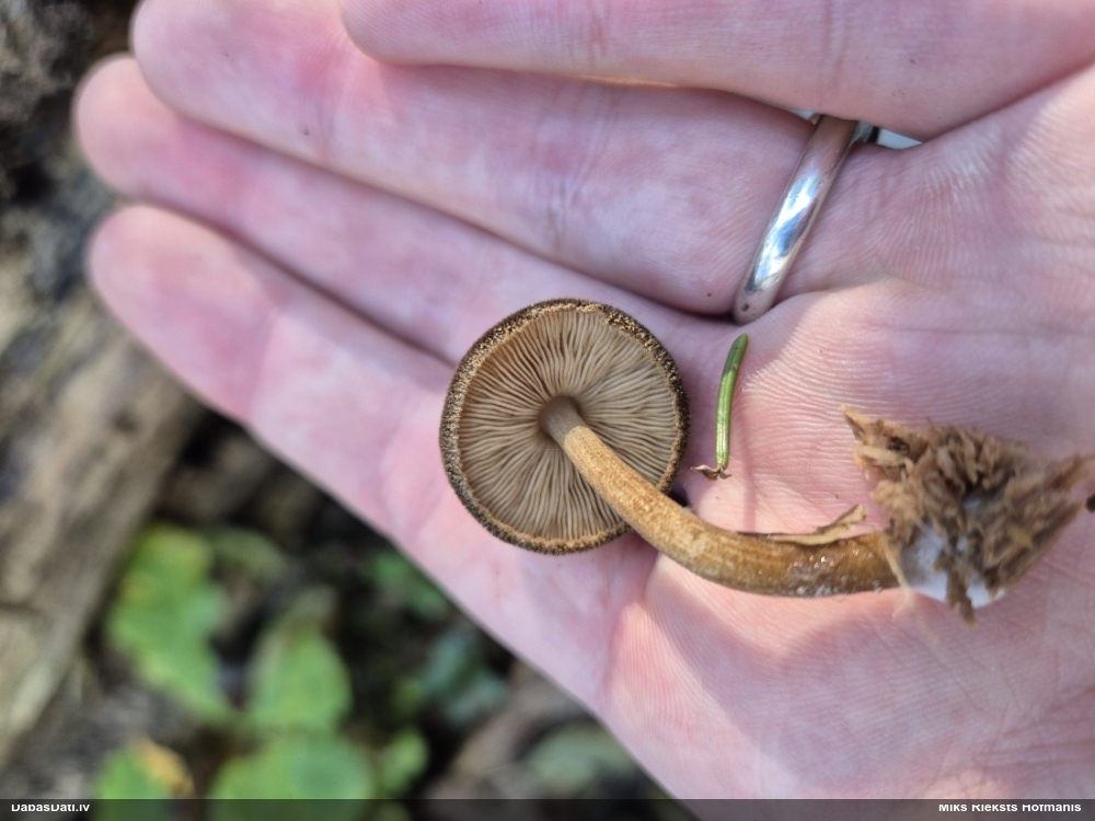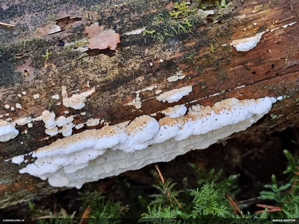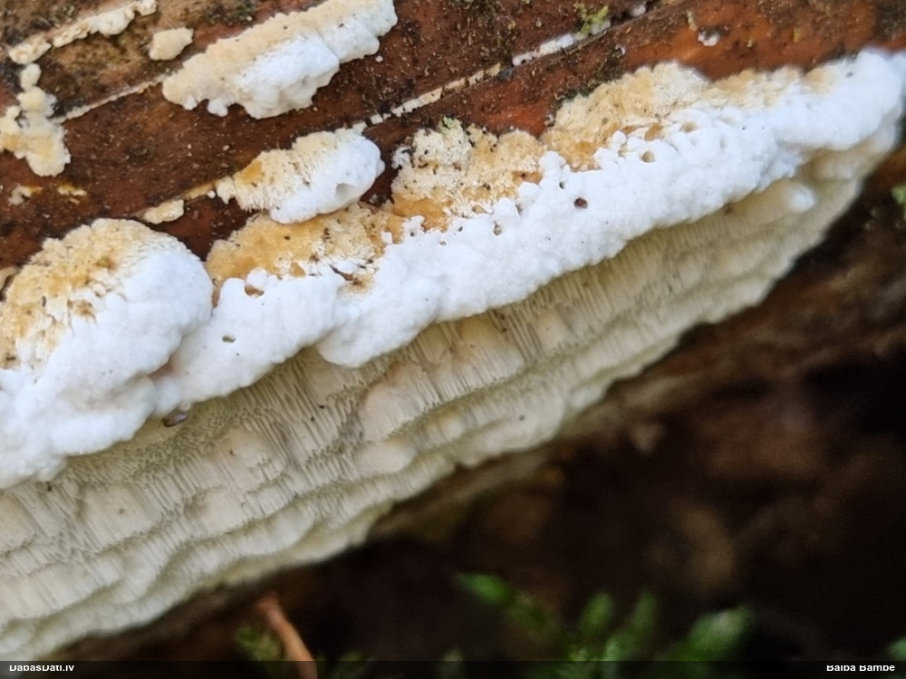 Nevar saprast, uz kā auga - vai tas ir nobirās, vai uz kritalas mizas? Abas hipotēzes ir "pa tēmu", bet man "nepatīk" kopskats, kur skaidri redzams, ka vairāki augļķermeņi ir cieši kopā, bet tas nav raksturīgs ne vienai, ne otrai hipotēzei, kur augļķermeņi tipiski ir nodalīti. Ļoti interesanti, ja ir paraugs, tad kāds tas izskatās tagad, un vispār to vajadzētu mikroskopēt.