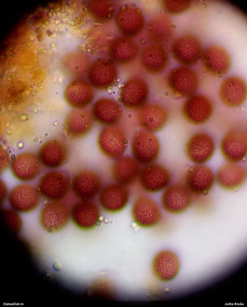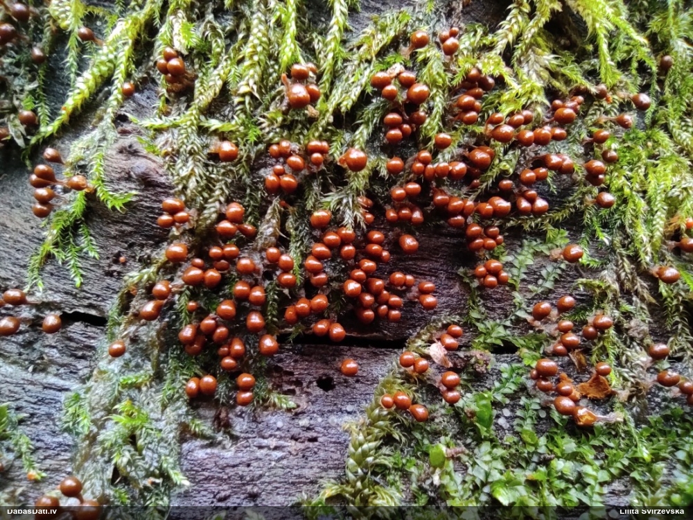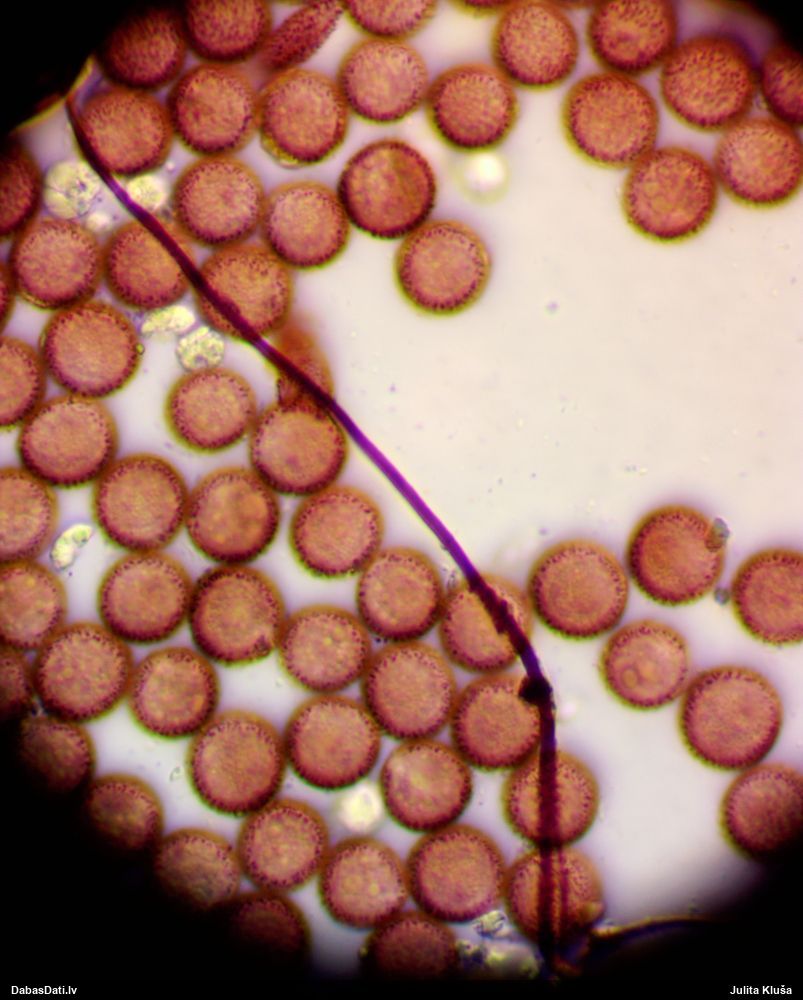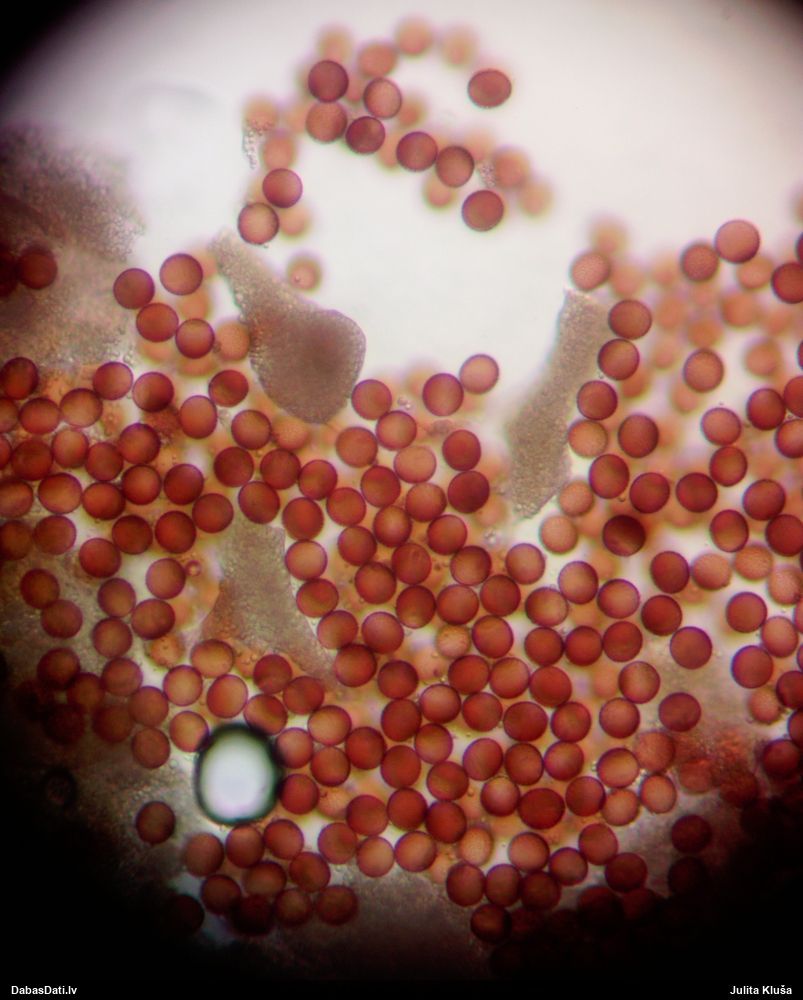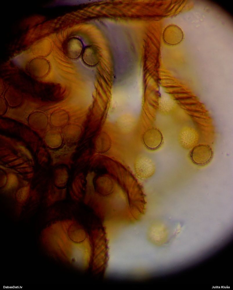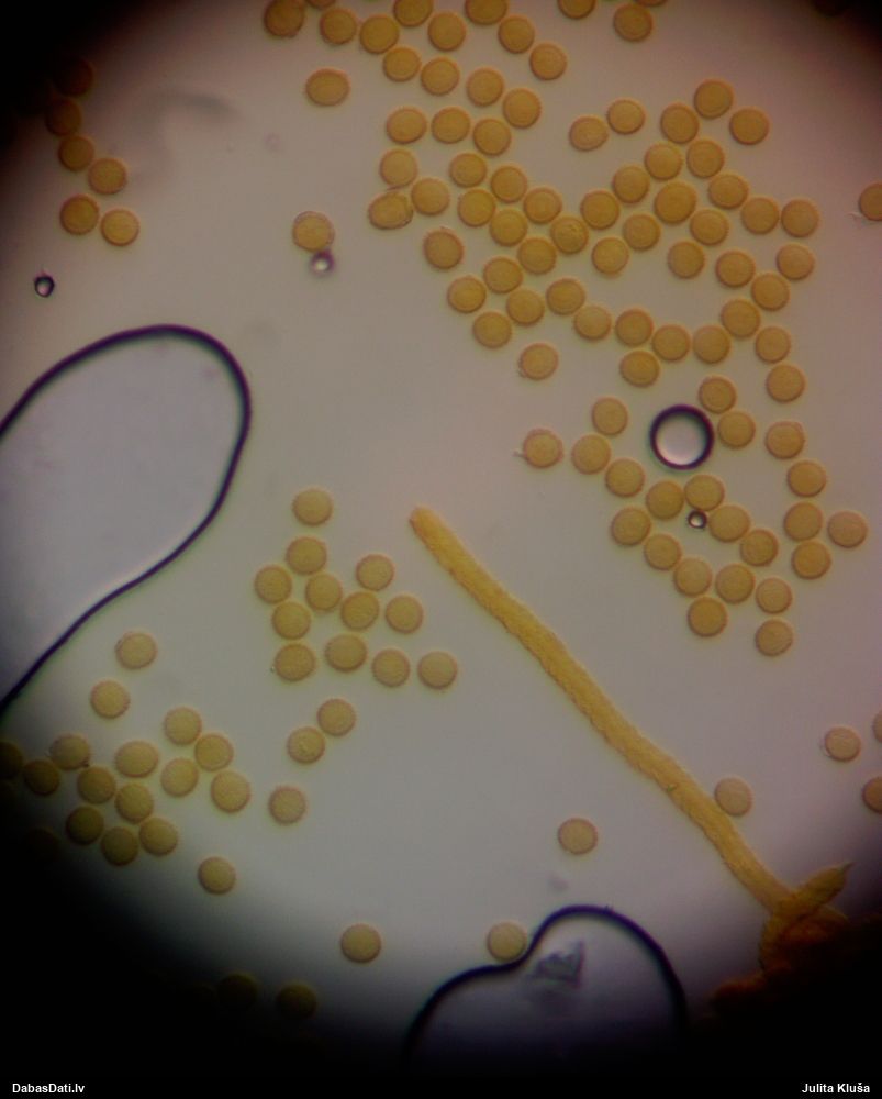 Paldies, Raivo! Ar acu gaišumu man arvien sliktāk, bet mikroskops palīdz. Jā, gribēju teikt, ka paraugam, ja vien nav kāda jutīga atradne, kurai drīkst ievākt tikai mazu gabaliņu, vērts ievākt lielāku gabalu, jo gļotsēnēm patīk kompānija. Un mikroskopa mazajos palielinājumos ar sānu papildus apgaismojumu ir vērts rūpīgi "izstaigāt" visu paraugu. Arī ķērpjus un interesantas sīksēnītes tā var atrast, ko dabā nepamanītu. Ar kriksītēm ir dažādi - pirmās es tā arī tikai citu sugu paraugos pamanīju, bet vēlāk redzēju arī dabā kriskīšu plantācijas - ja to ir daudz, tad var pamanīt jau dabā. Uz sūnām gan ir ekstrēms gadījums, dabā droši nepamanītu, arī eksemplāra noņemšana no sūnas nebija pārāk veiksmīga, tāpēc par noteikšanu mazliet šaubos (sporām mazliet cits tonis). Bet pagaidām citas hipotēzes nav (un konkrētā eksemplāra arī vairs ne).