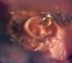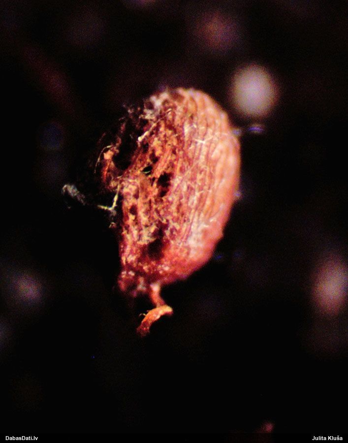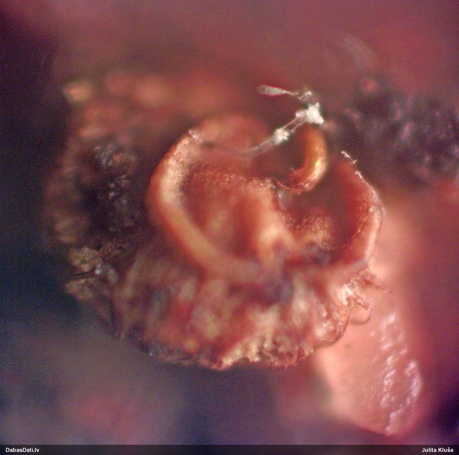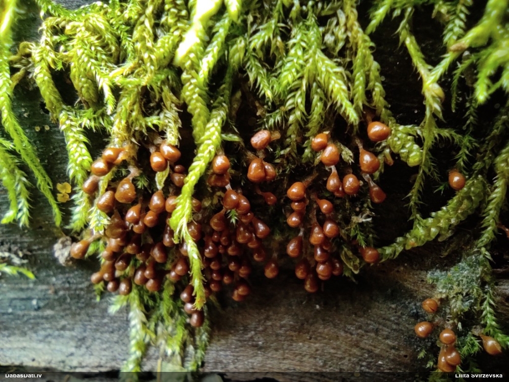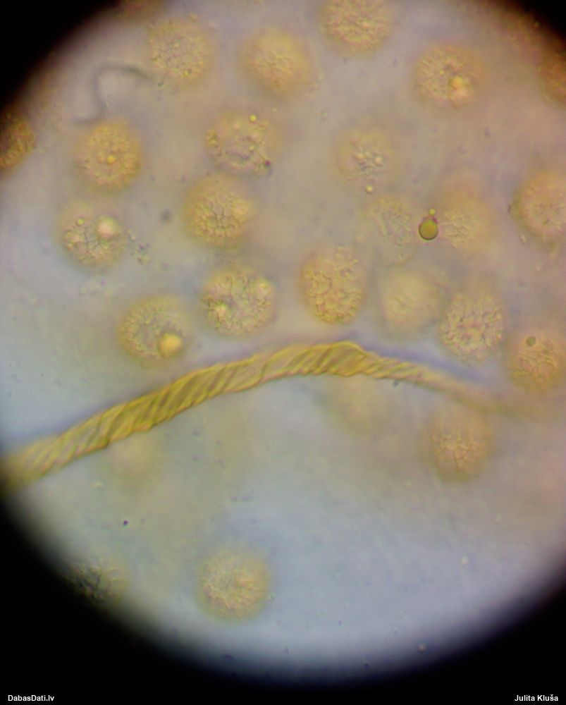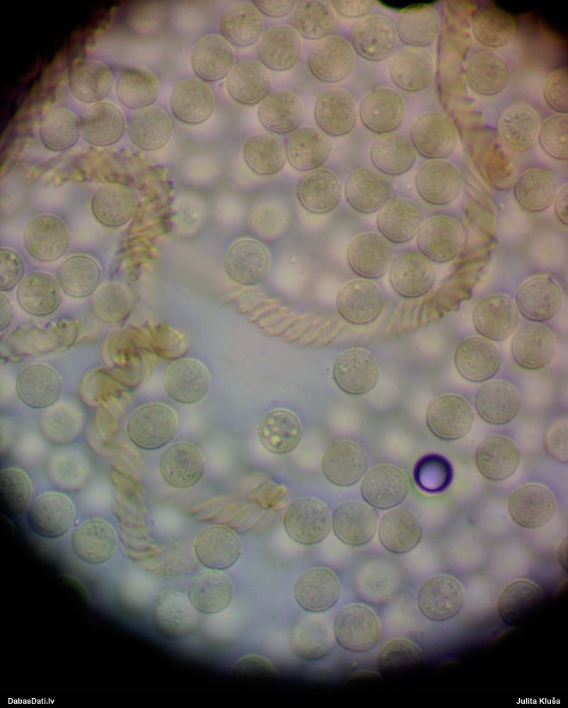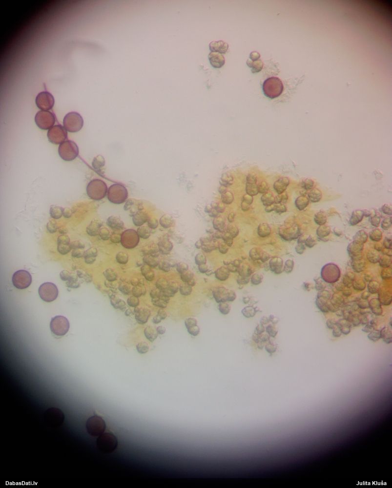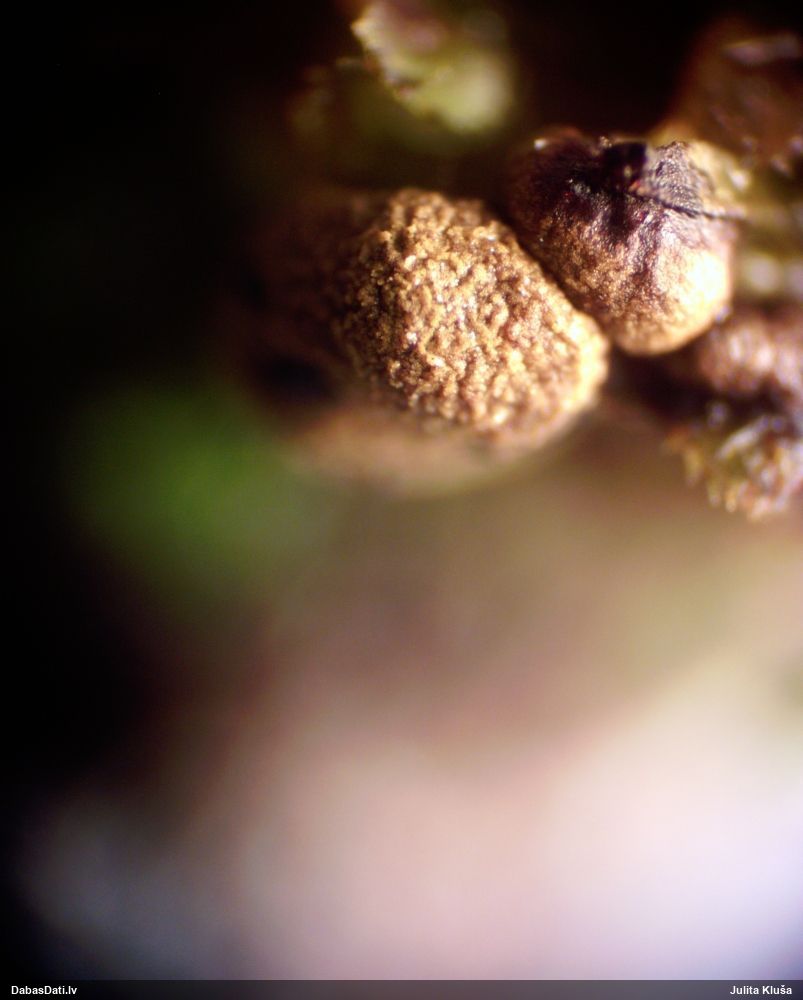 Paldies, Raivo! Ar acu gaišumu man arvien sliktāk, bet mikroskops palīdz. Jā, gribēju teikt, ka paraugam, ja vien nav kāda jutīga atradne, kurai drīkst ievākt tikai mazu gabaliņu, vērts ievākt lielāku gabalu, jo gļotsēnēm patīk kompānija. Un mikroskopa mazajos palielinājumos ar sānu papildus apgaismojumu ir vērts rūpīgi "izstaigāt" visu paraugu. Arī ķērpjus un interesantas sīksēnītes tā var atrast, ko dabā nepamanītu. Ar kriksītēm ir dažādi - pirmās es tā arī tikai citu sugu paraugos pamanīju, bet vēlāk redzēju arī dabā kriskīšu plantācijas - ja to ir daudz, tad var pamanīt jau dabā. Uz sūnām gan ir ekstrēms gadījums, dabā droši nepamanītu, arī eksemplāra noņemšana no sūnas nebija pārāk veiksmīga, tāpēc par noteikšanu mazliet šaubos (sporām mazliet cits tonis). Bet pagaidām citas hipotēzes nav (un konkrētā eksemplāra arī vairs ne).