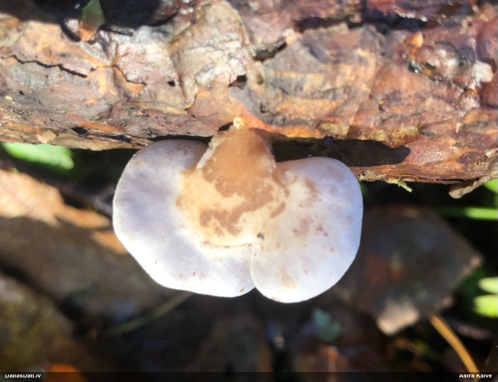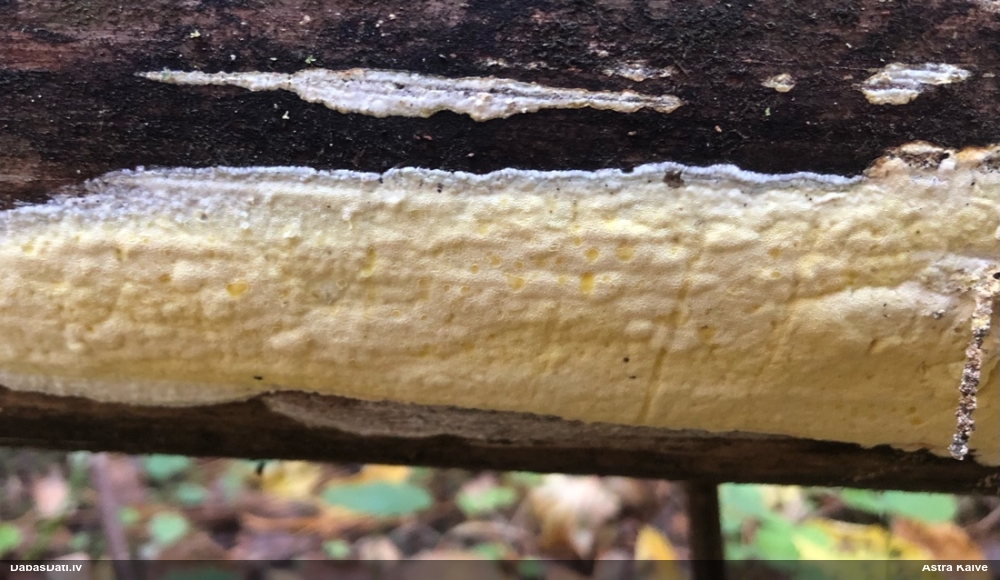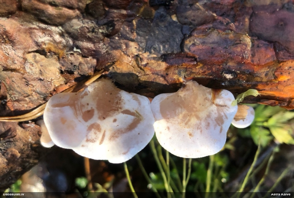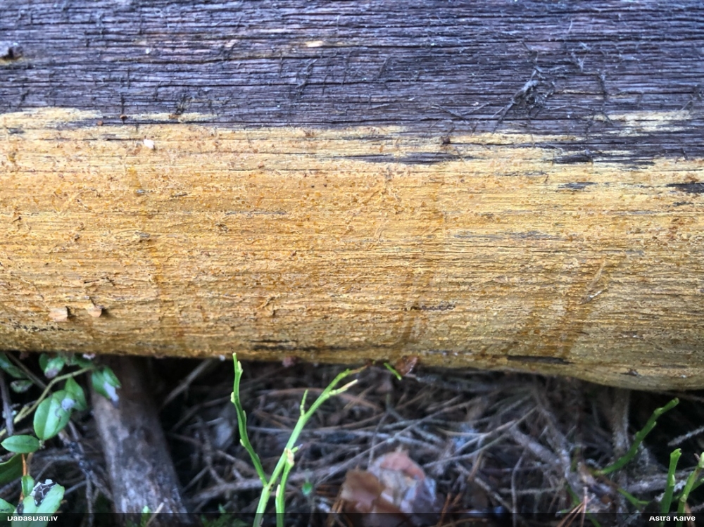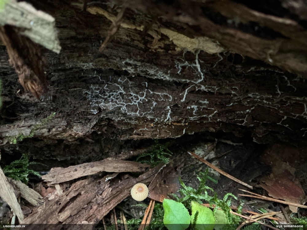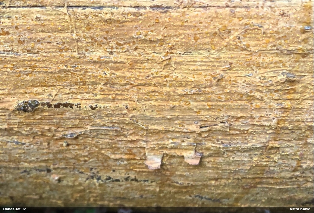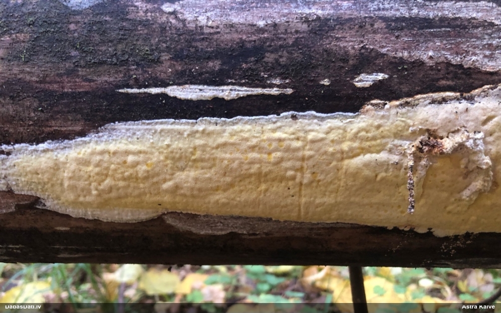 Nevar saprast, uz kā auga - vai tas ir nobirās, vai uz kritalas mizas? Abas hipotēzes ir "pa tēmu", bet man "nepatīk" kopskats, kur skaidri redzams, ka vairāki augļķermeņi ir cieši kopā, bet tas nav raksturīgs ne vienai, ne otrai hipotēzei, kur augļķermeņi tipiski ir nodalīti. Ļoti interesanti, ja ir paraugs, tad kāds tas izskatās tagad, un vispār to vajadzētu mikroskopēt.
