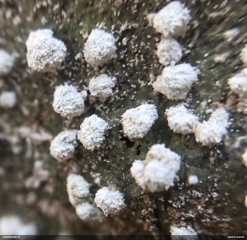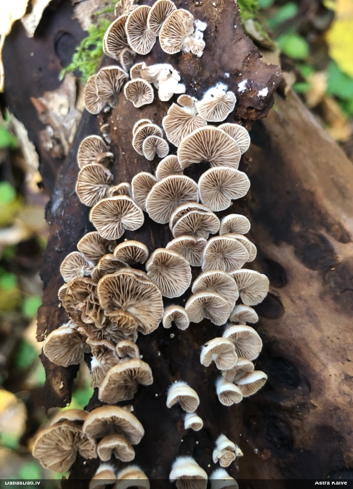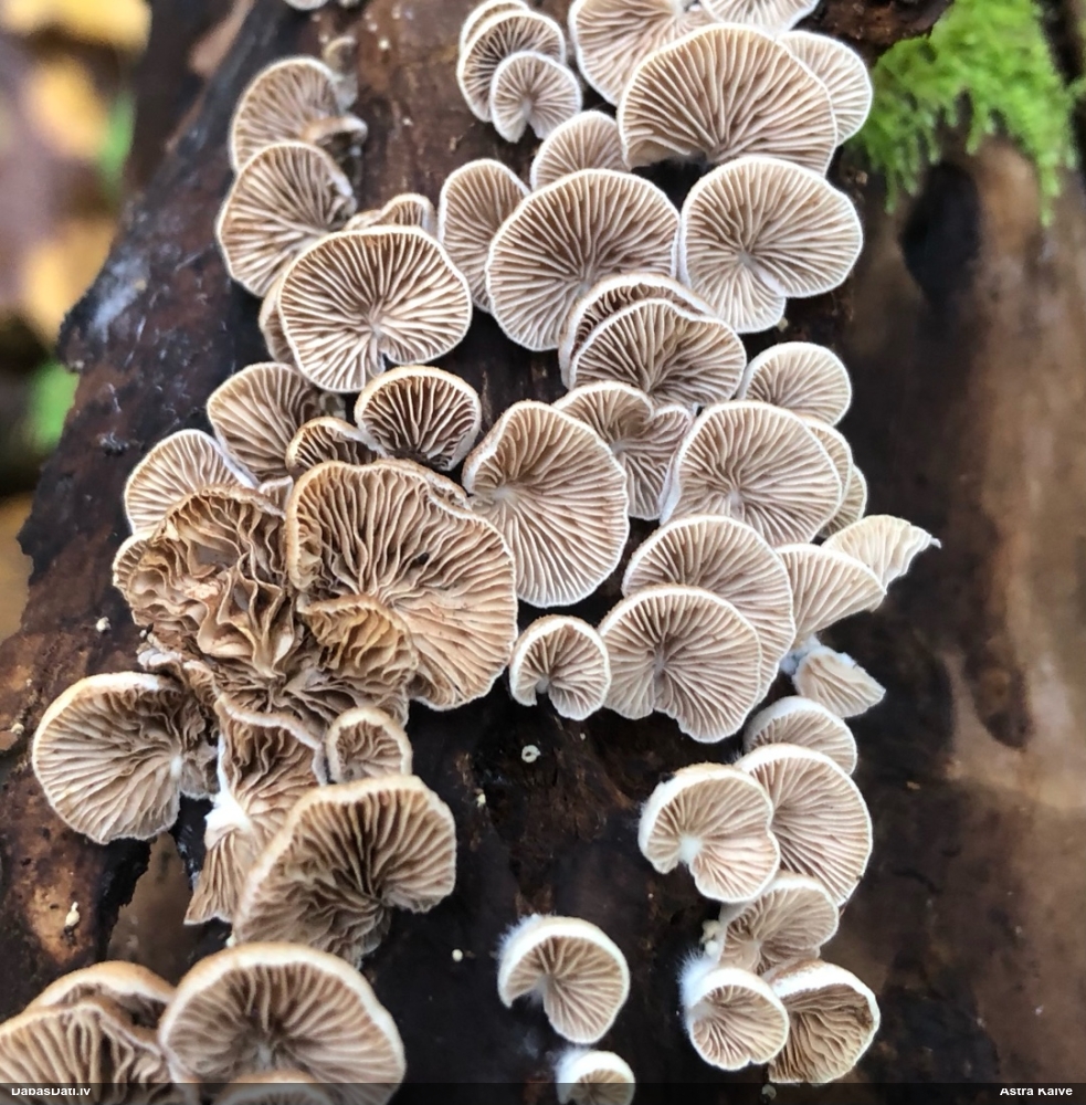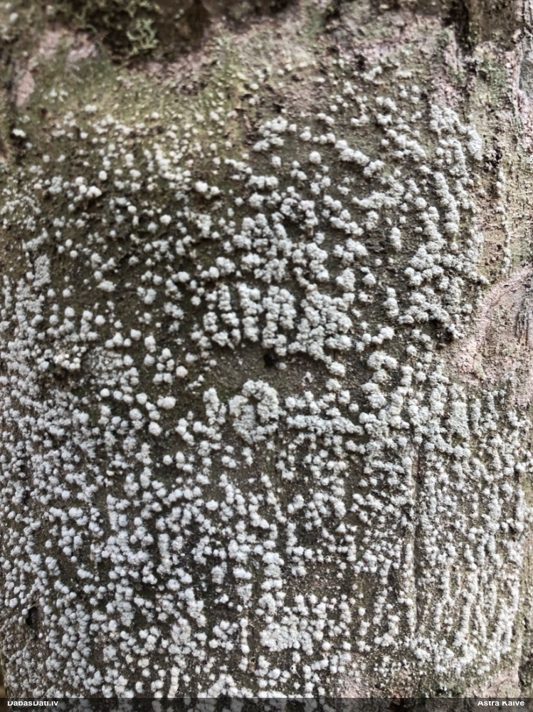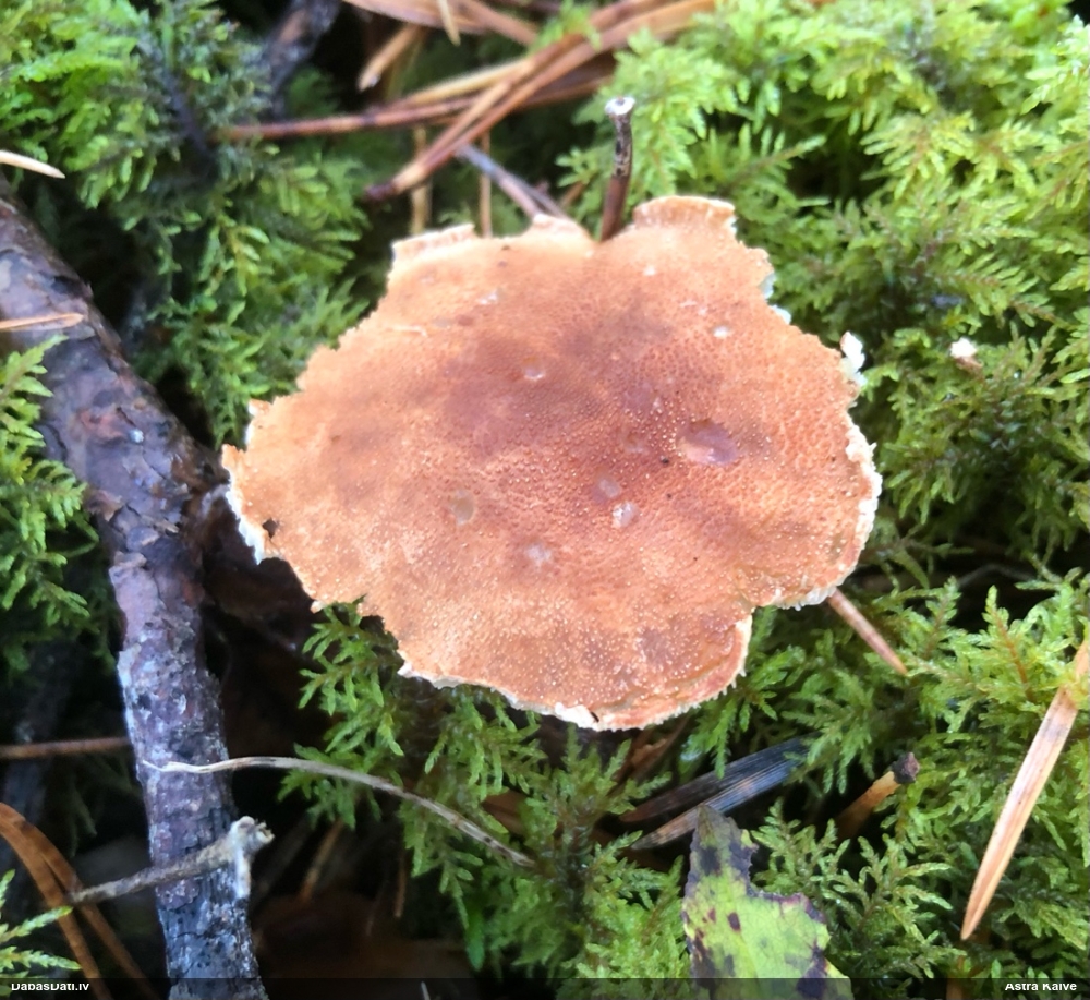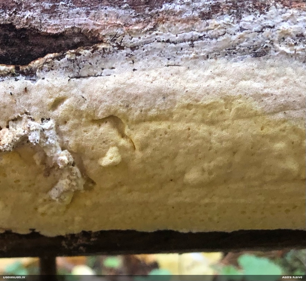 Nevar saprast, uz kā auga - vai tas ir nobirās, vai uz kritalas mizas? Abas hipotēzes ir "pa tēmu", bet man "nepatīk" kopskats, kur skaidri redzams, ka vairāki augļķermeņi ir cieši kopā, bet tas nav raksturīgs ne vienai, ne otrai hipotēzei, kur augļķermeņi tipiski ir nodalīti. Ļoti interesanti, ja ir paraugs, tad kāds tas izskatās tagad, un vispār to vajadzētu mikroskopēt.