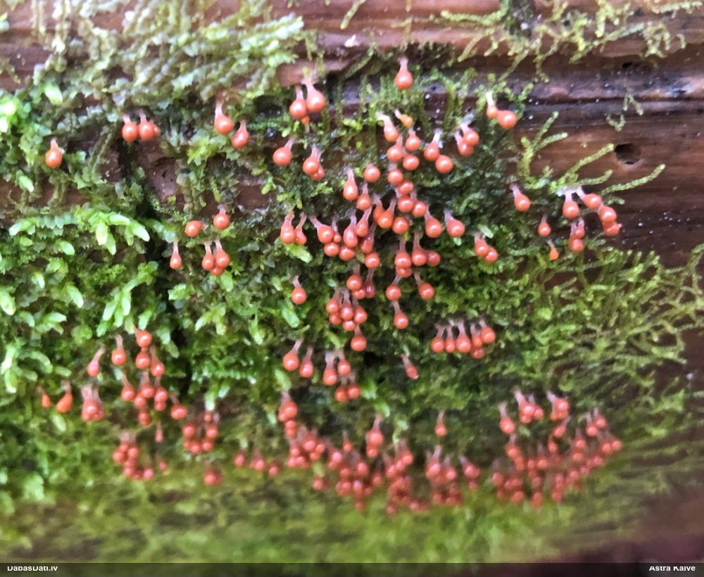 Paldies, Raivo! Ar acu gaišumu man arvien sliktāk, bet mikroskops palīdz. Jā, gribēju teikt, ka paraugam, ja vien nav kāda jutīga atradne, kurai drīkst ievākt tikai mazu gabaliņu, vērts ievākt lielāku gabalu, jo gļotsēnēm patīk kompānija. Un mikroskopa mazajos palielinājumos ar sānu papildus apgaismojumu ir vērts rūpīgi "izstaigāt" visu paraugu. Arī ķērpjus un interesantas sīksēnītes tā var atrast, ko dabā nepamanītu. Ar kriksītēm ir dažādi - pirmās es tā arī tikai citu sugu paraugos pamanīju, bet vēlāk redzēju arī dabā kriskīšu plantācijas - ja to ir daudz, tad var pamanīt jau dabā. Uz sūnām gan ir ekstrēms gadījums, dabā droši nepamanītu, arī eksemplāra noņemšana no sūnas nebija pārāk veiksmīga, tāpēc par noteikšanu mazliet šaubos (sporām mazliet cits tonis). Bet pagaidām citas hipotēzes nav (un konkrētā eksemplāra arī vairs ne).