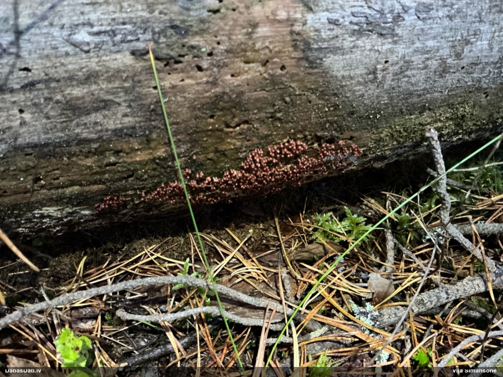 Šis interesants. Uz sausām priedes kritalām rozā mazi līdzīga izskata augļķermeņi maijā aug divām citādi atšķirīgām sugām (dažādās dzimtās) - melnajai plaispikai Amaurochaete atra un trauslajam gļotpūpēdim Reticularia jurana. Pēc sīkām mikropazīmēm (foto nav redzama pat ne sīka balta pakāje ap augļķermeni, un uz virsmas ar lielu piepūli var ja ne saskatīt, tad iztēloties tīklotu virsmas rakstu) izšķīros par biežāko no abām - melno plaispiku, kas tipiski aug samērā atklātās, skrajās vietās, t.sk. nesenos izcirtumos.