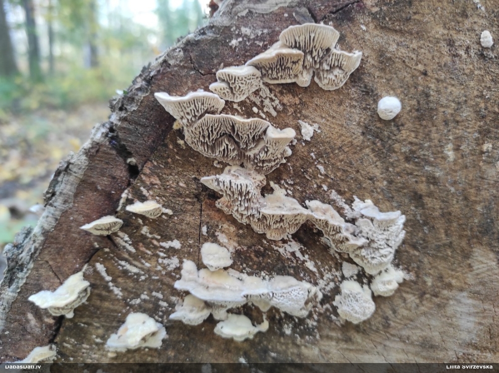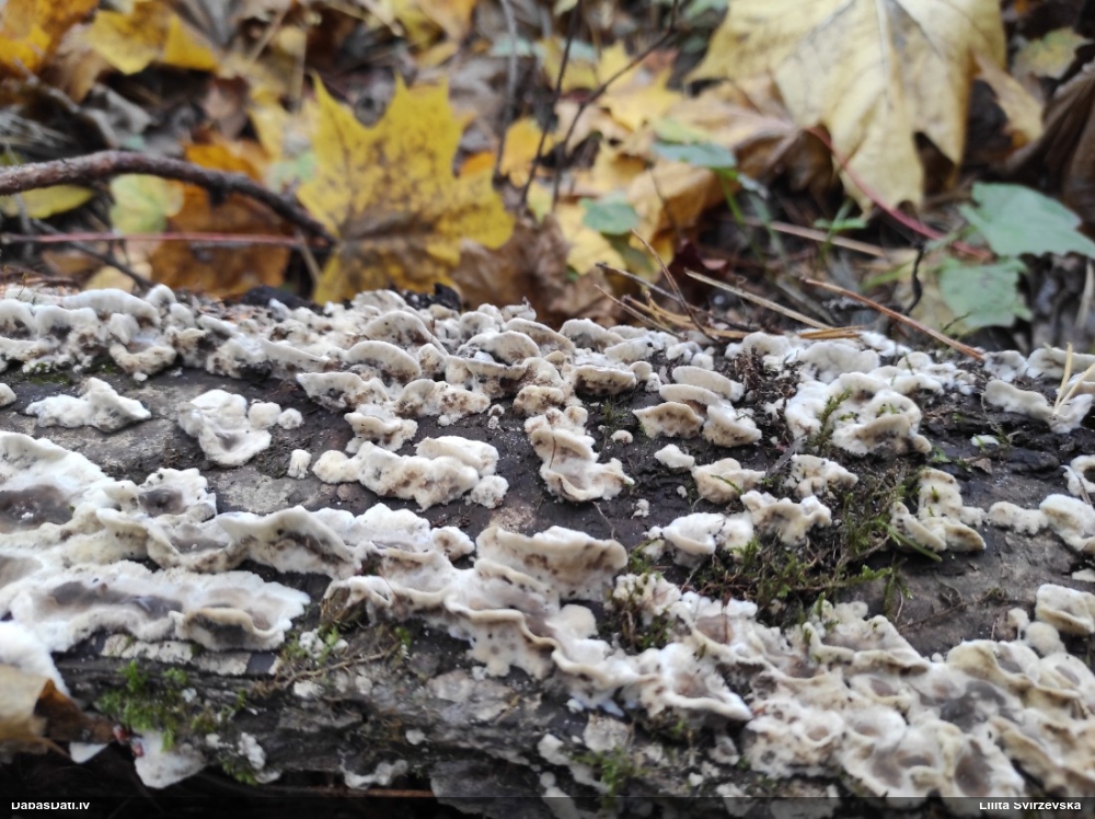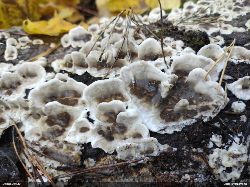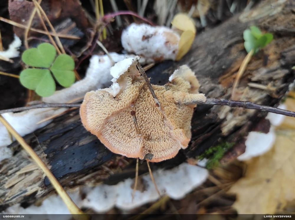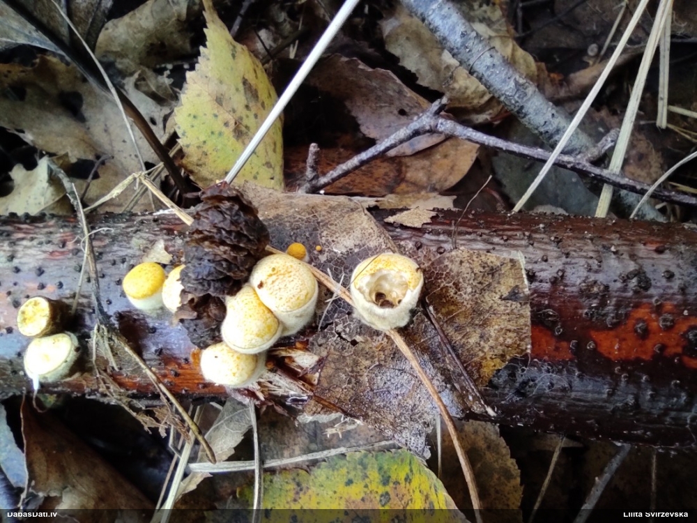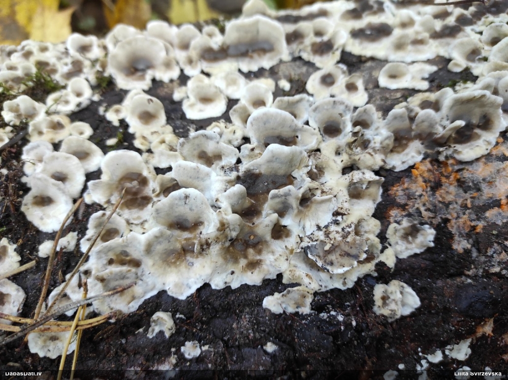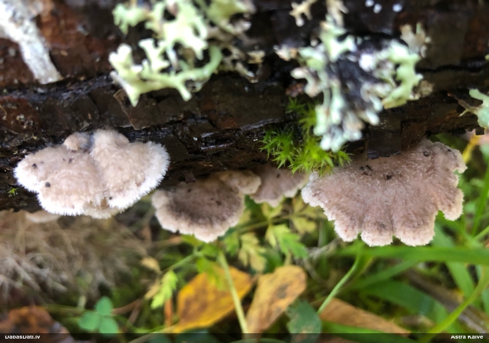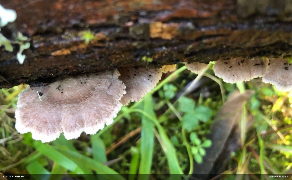 Nevar saprast, uz kā auga - vai tas ir nobirās, vai uz kritalas mizas? Abas hipotēzes ir "pa tēmu", bet man "nepatīk" kopskats, kur skaidri redzams, ka vairāki augļķermeņi ir cieši kopā, bet tas nav raksturīgs ne vienai, ne otrai hipotēzei, kur augļķermeņi tipiski ir nodalīti. Ļoti interesanti, ja ir paraugs, tad kāds tas izskatās tagad, un vispār to vajadzētu mikroskopēt.
