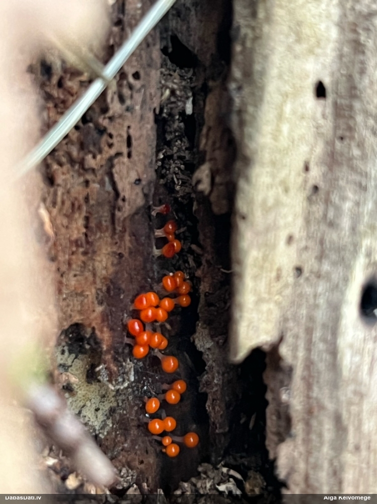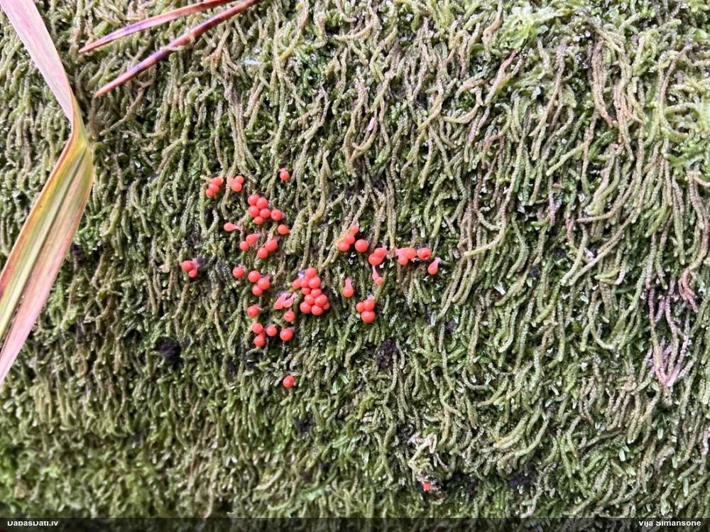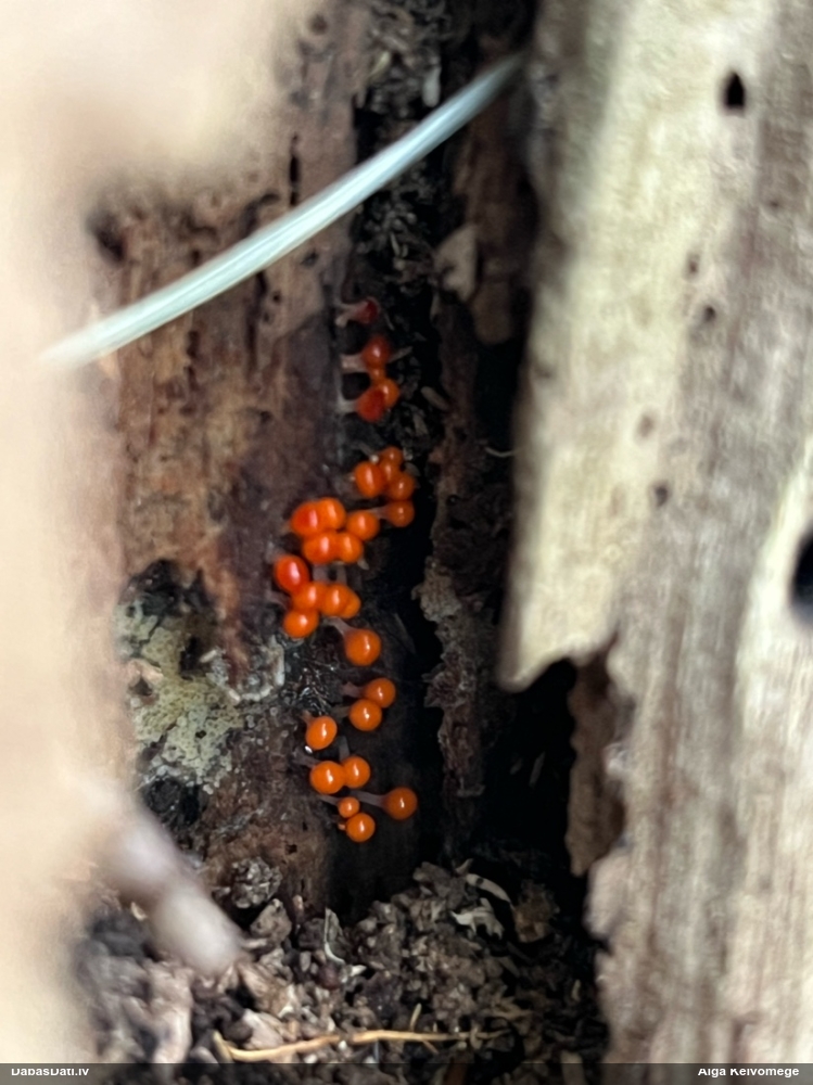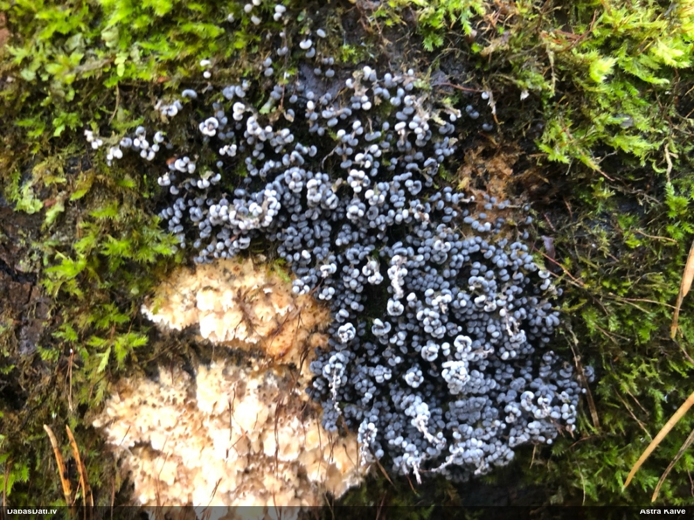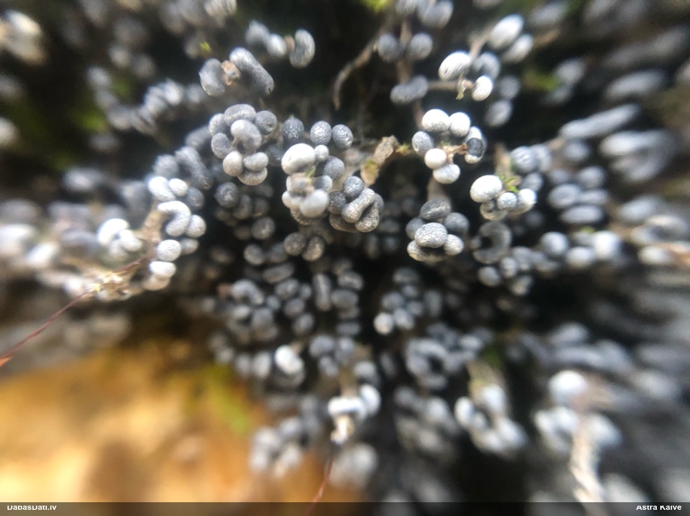 Paldies, Raivo! Ar acu gaišumu man arvien sliktāk, bet mikroskops palīdz. Jā, gribēju teikt, ka paraugam, ja vien nav kāda jutīga atradne, kurai drīkst ievākt tikai mazu gabaliņu, vērts ievākt lielāku gabalu, jo gļotsēnēm patīk kompānija. Un mikroskopa mazajos palielinājumos ar sānu papildus apgaismojumu ir vērts rūpīgi "izstaigāt" visu paraugu. Arī ķērpjus un interesantas sīksēnītes tā var atrast, ko dabā nepamanītu. Ar kriksītēm ir dažādi - pirmās es tā arī tikai citu sugu paraugos pamanīju, bet vēlāk redzēju arī dabā kriskīšu plantācijas - ja to ir daudz, tad var pamanīt jau dabā. Uz sūnām gan ir ekstrēms gadījums, dabā droši nepamanītu, arī eksemplāra noņemšana no sūnas nebija pārāk veiksmīga, tāpēc par noteikšanu mazliet šaubos (sporām mazliet cits tonis). Bet pagaidām citas hipotēzes nav (un konkrētā eksemplāra arī vairs ne).