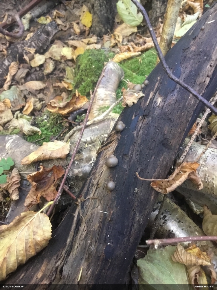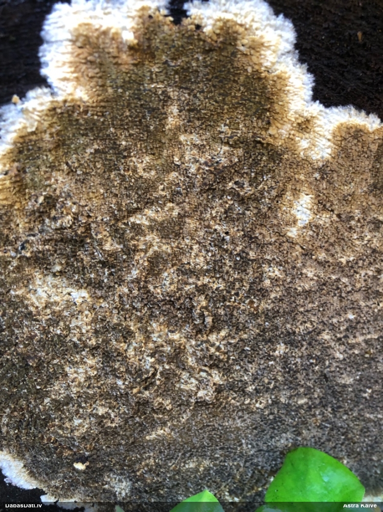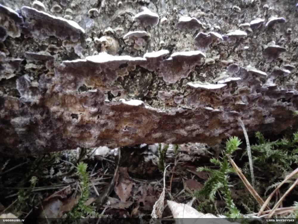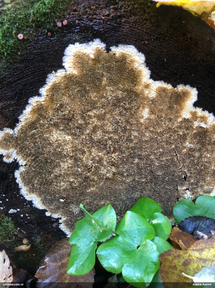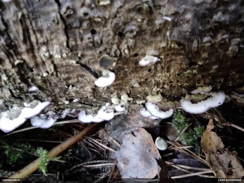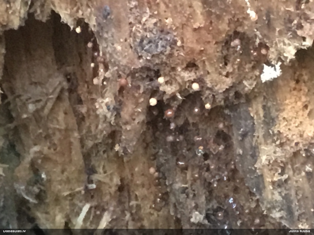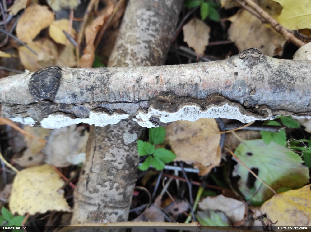 Nevar saprast, uz kā auga - vai tas ir nobirās, vai uz kritalas mizas? Abas hipotēzes ir "pa tēmu", bet man "nepatīk" kopskats, kur skaidri redzams, ka vairāki augļķermeņi ir cieši kopā, bet tas nav raksturīgs ne vienai, ne otrai hipotēzei, kur augļķermeņi tipiski ir nodalīti. Ļoti interesanti, ja ir paraugs, tad kāds tas izskatās tagad, un vispār to vajadzētu mikroskopēt.