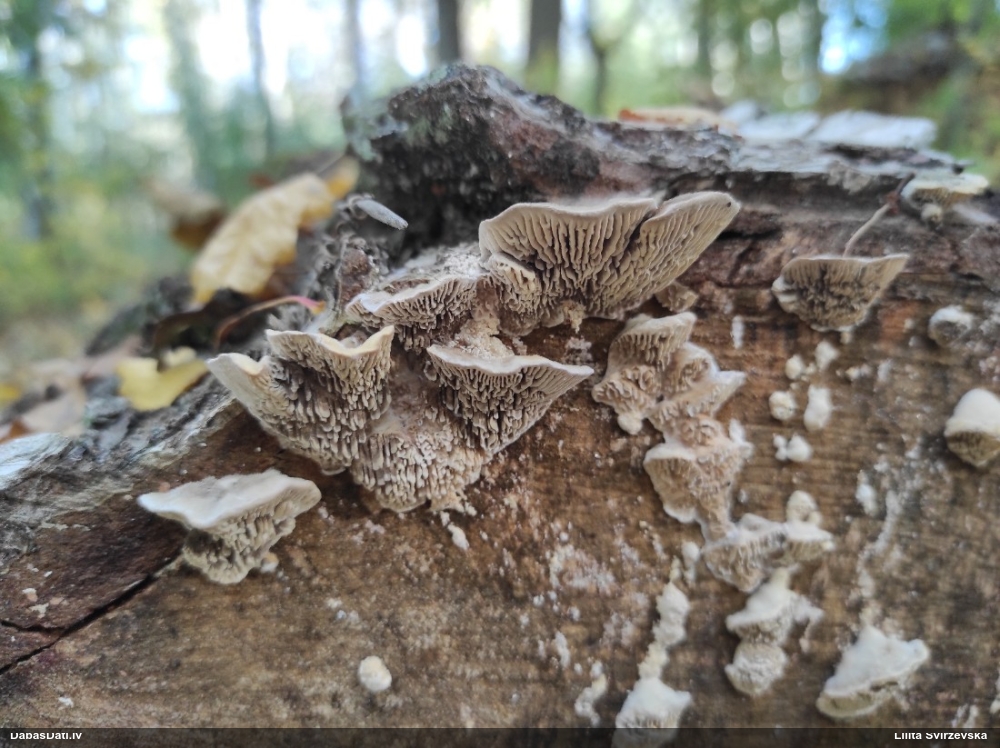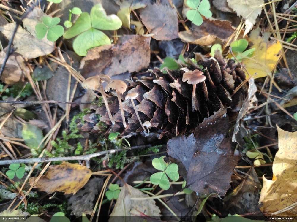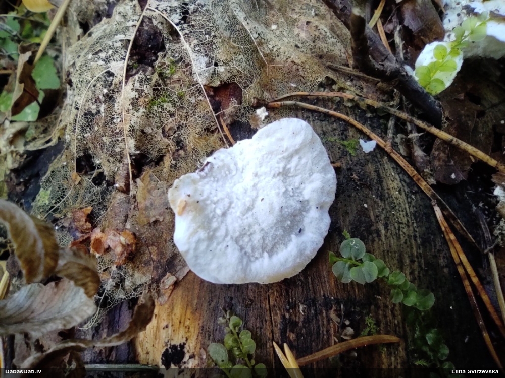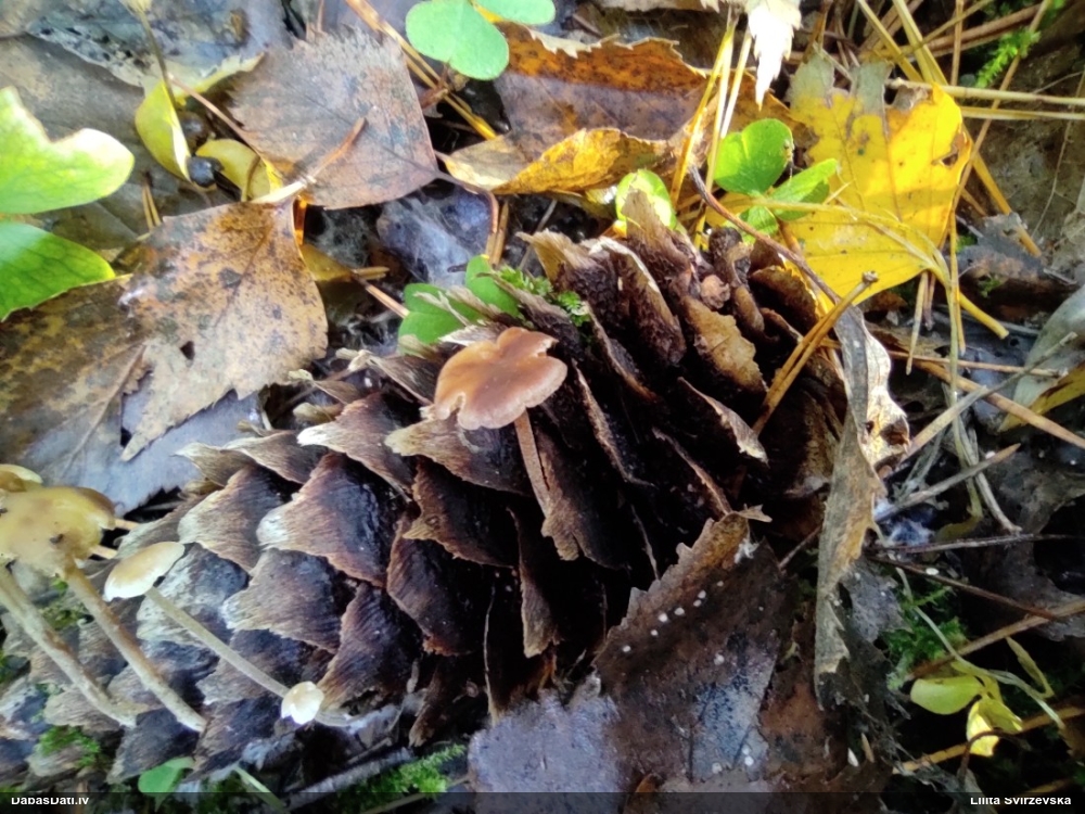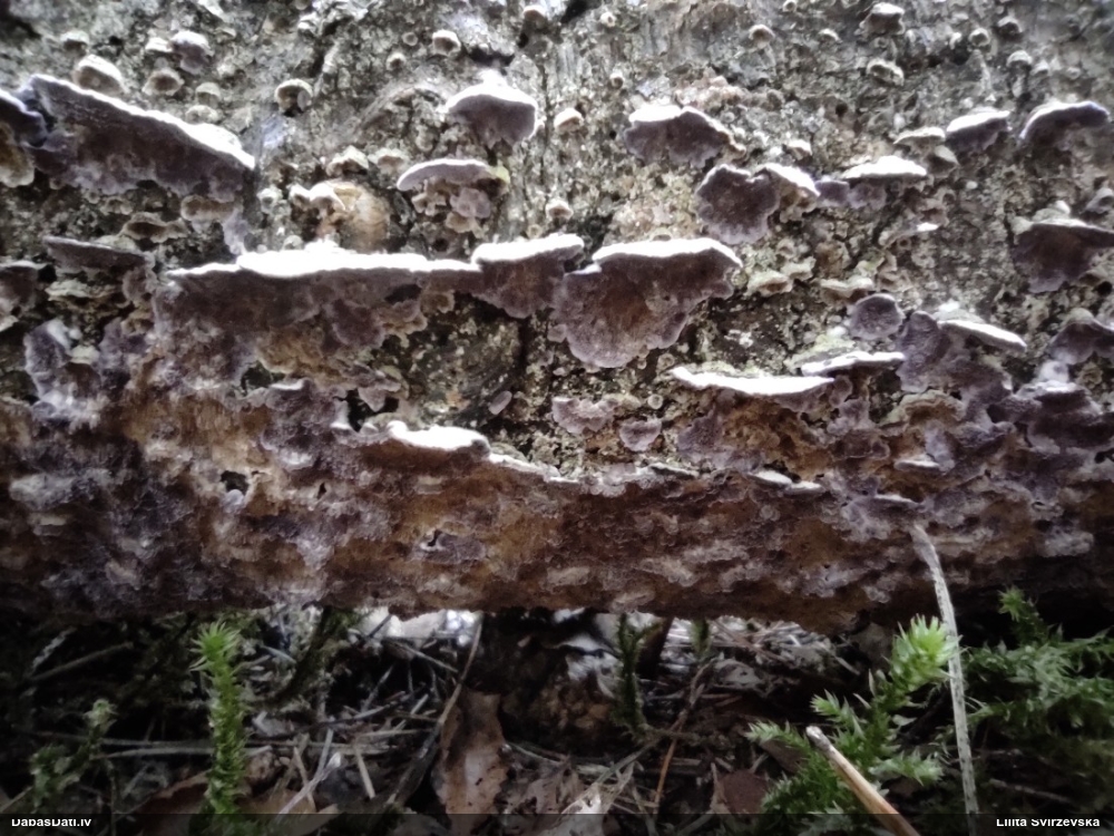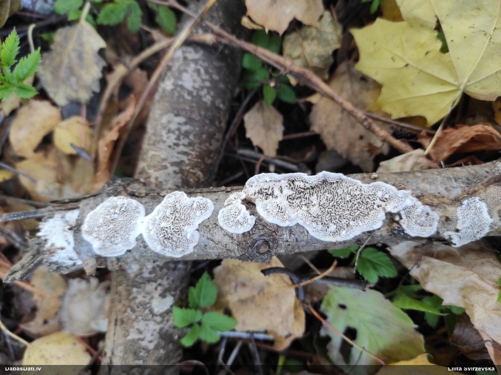 Nevar saprast, uz kā auga - vai tas ir nobirās, vai uz kritalas mizas? Abas hipotēzes ir "pa tēmu", bet man "nepatīk" kopskats, kur skaidri redzams, ka vairāki augļķermeņi ir cieši kopā, bet tas nav raksturīgs ne vienai, ne otrai hipotēzei, kur augļķermeņi tipiski ir nodalīti. Ļoti interesanti, ja ir paraugs, tad kāds tas izskatās tagad, un vispār to vajadzētu mikroskopēt.