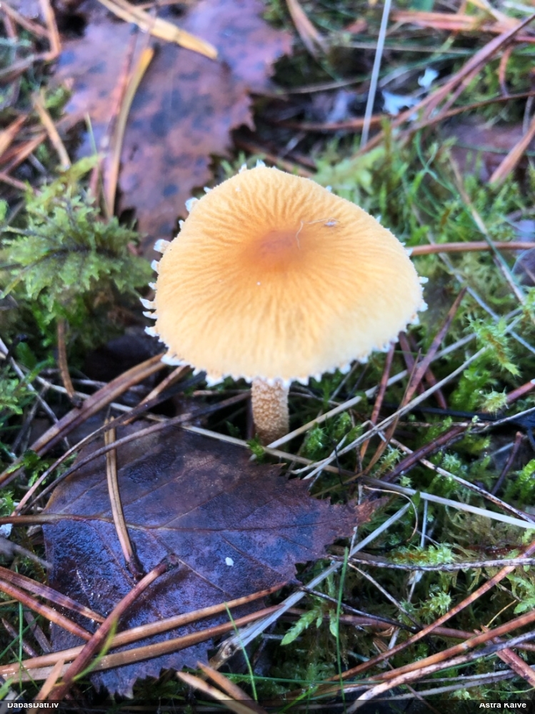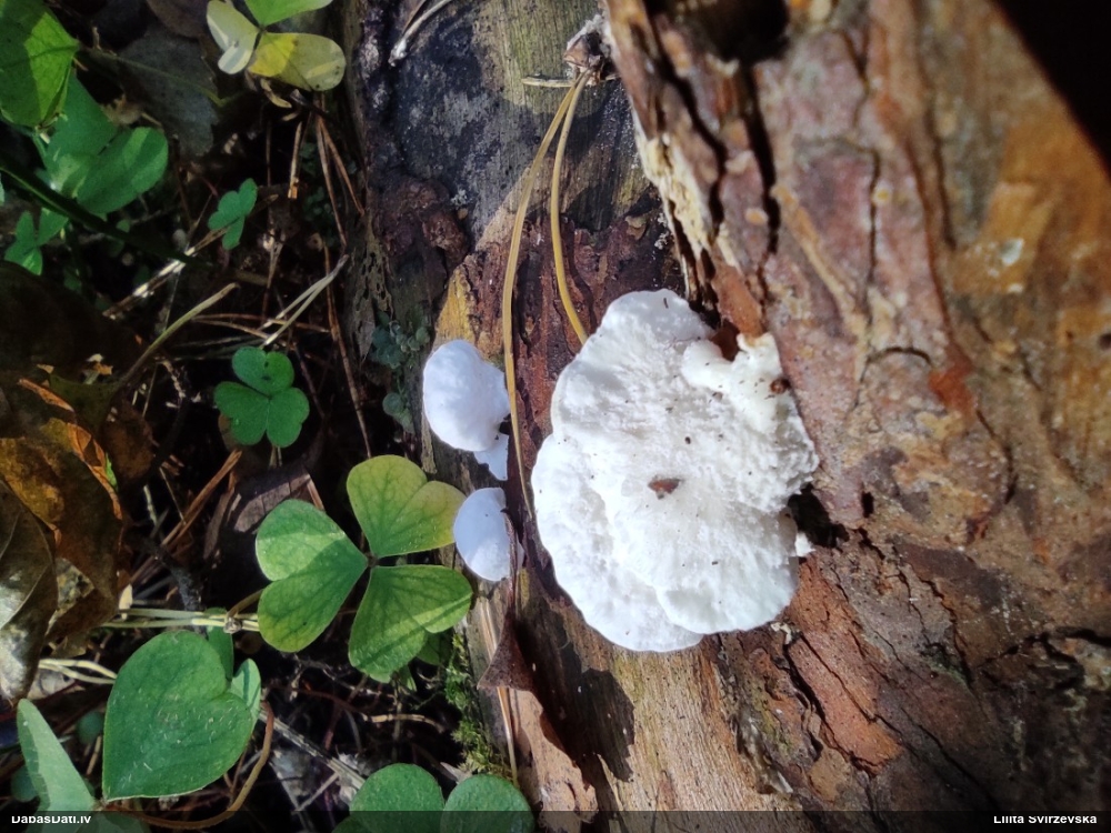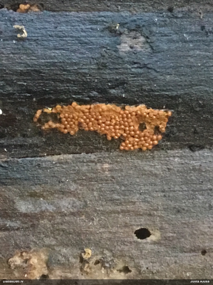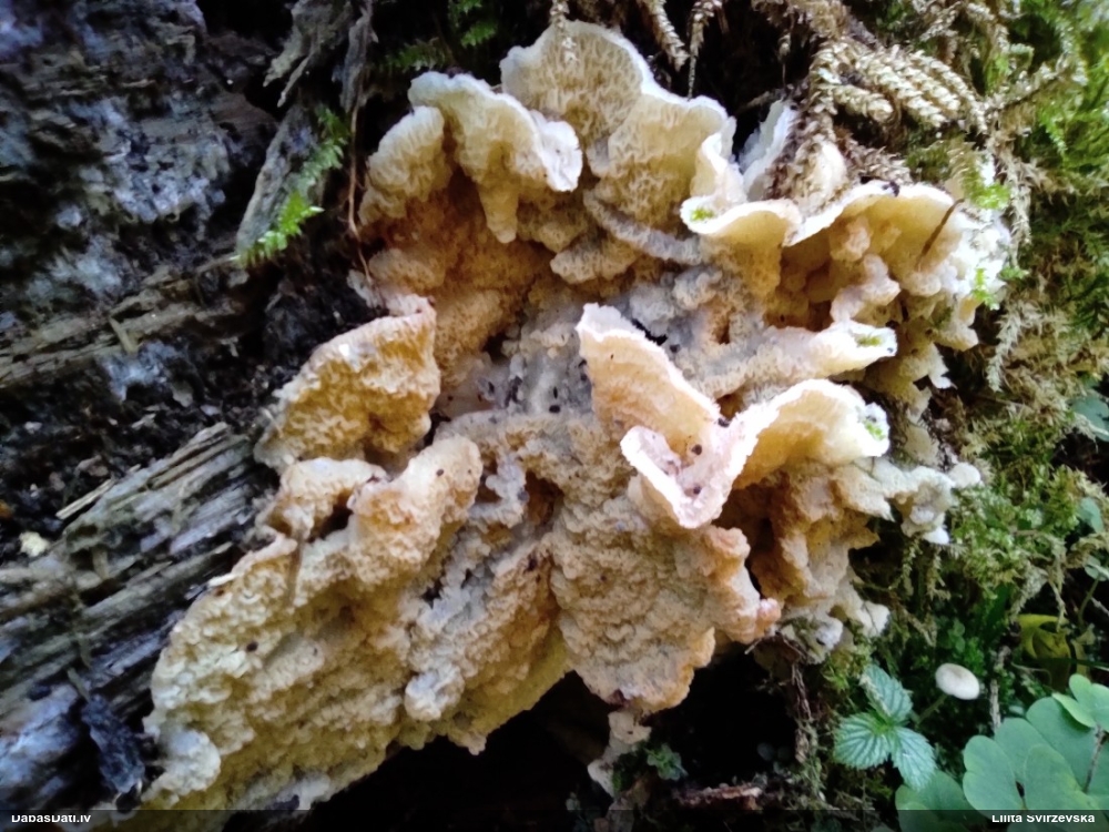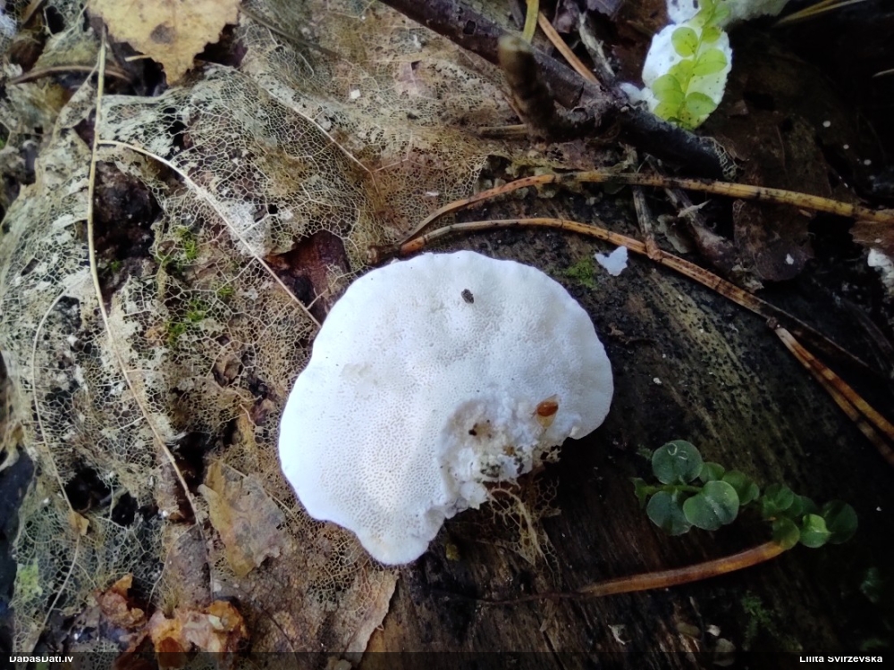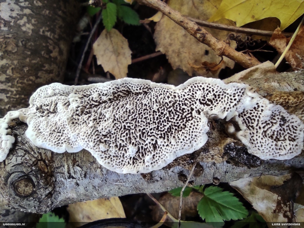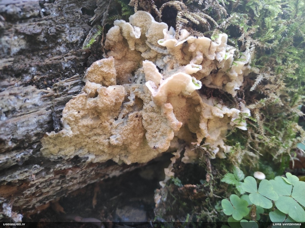 Nevar saprast, uz kā auga - vai tas ir nobirās, vai uz kritalas mizas? Abas hipotēzes ir "pa tēmu", bet man "nepatīk" kopskats, kur skaidri redzams, ka vairāki augļķermeņi ir cieši kopā, bet tas nav raksturīgs ne vienai, ne otrai hipotēzei, kur augļķermeņi tipiski ir nodalīti. Ļoti interesanti, ja ir paraugs, tad kāds tas izskatās tagad, un vispār to vajadzētu mikroskopēt.