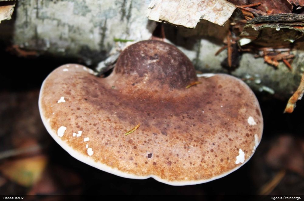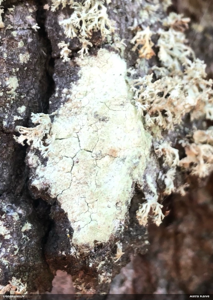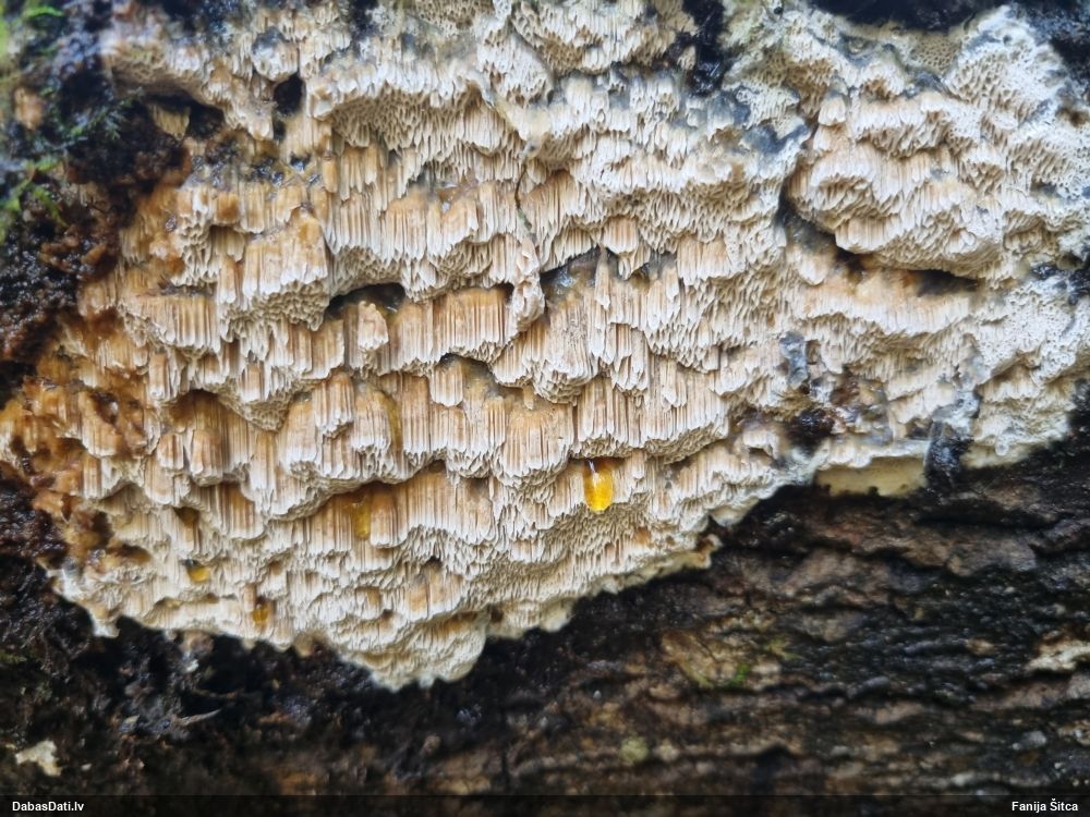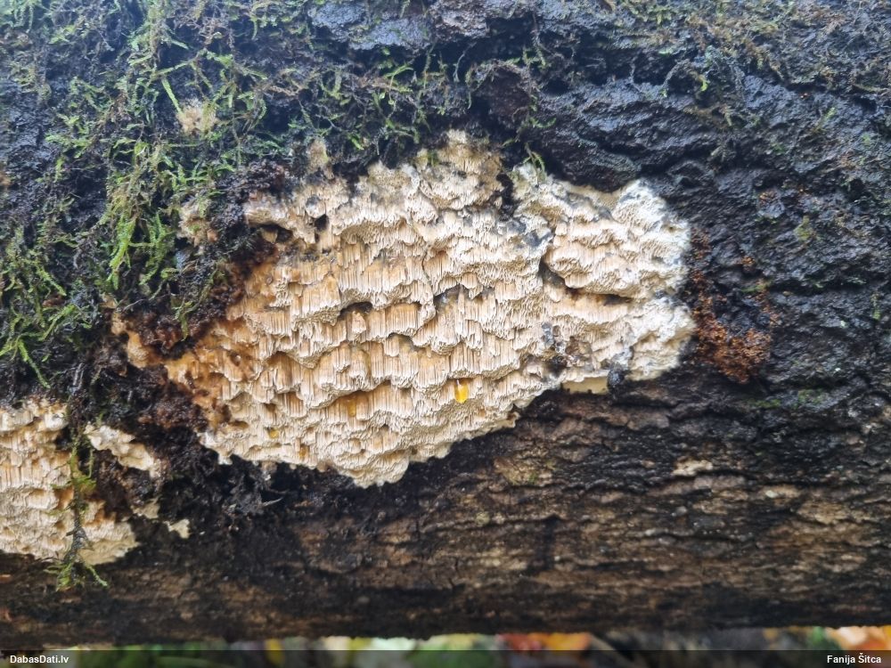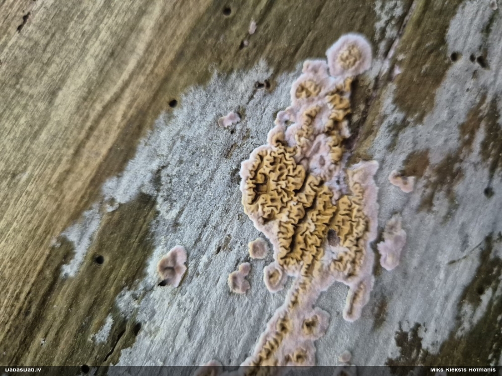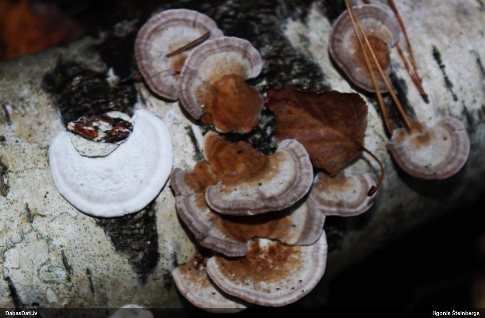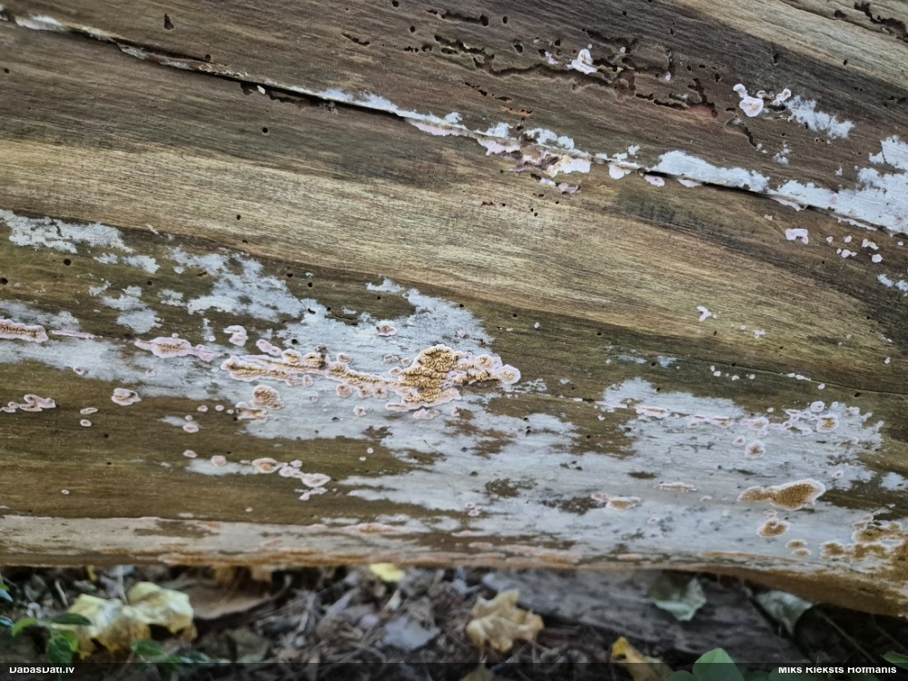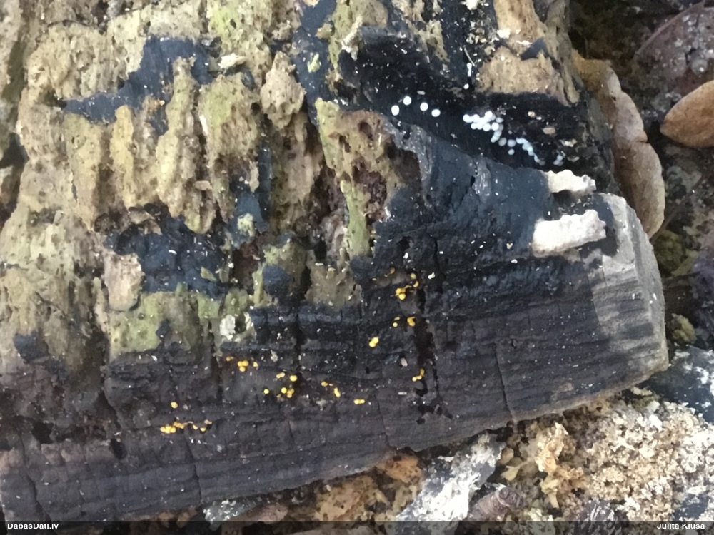 Nevar saprast, uz kā auga - vai tas ir nobirās, vai uz kritalas mizas? Abas hipotēzes ir "pa tēmu", bet man "nepatīk" kopskats, kur skaidri redzams, ka vairāki augļķermeņi ir cieši kopā, bet tas nav raksturīgs ne vienai, ne otrai hipotēzei, kur augļķermeņi tipiski ir nodalīti. Ļoti interesanti, ja ir paraugs, tad kāds tas izskatās tagad, un vispār to vajadzētu mikroskopēt.