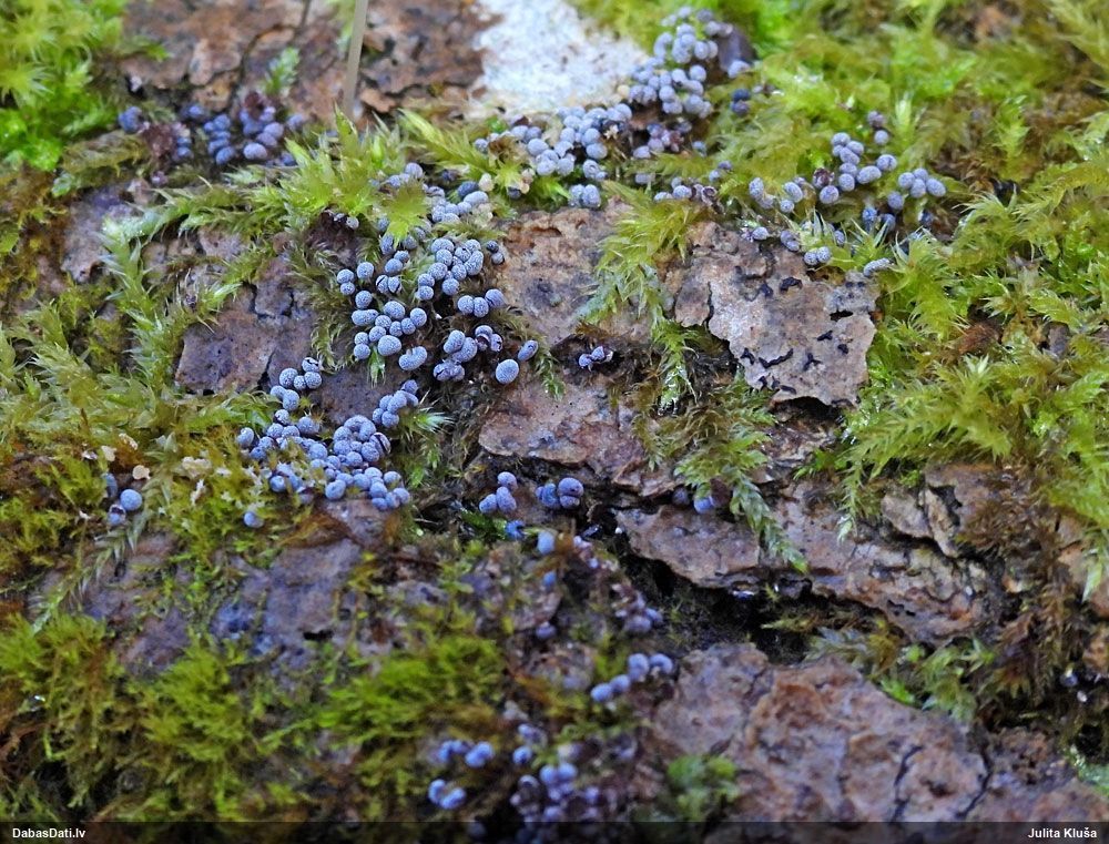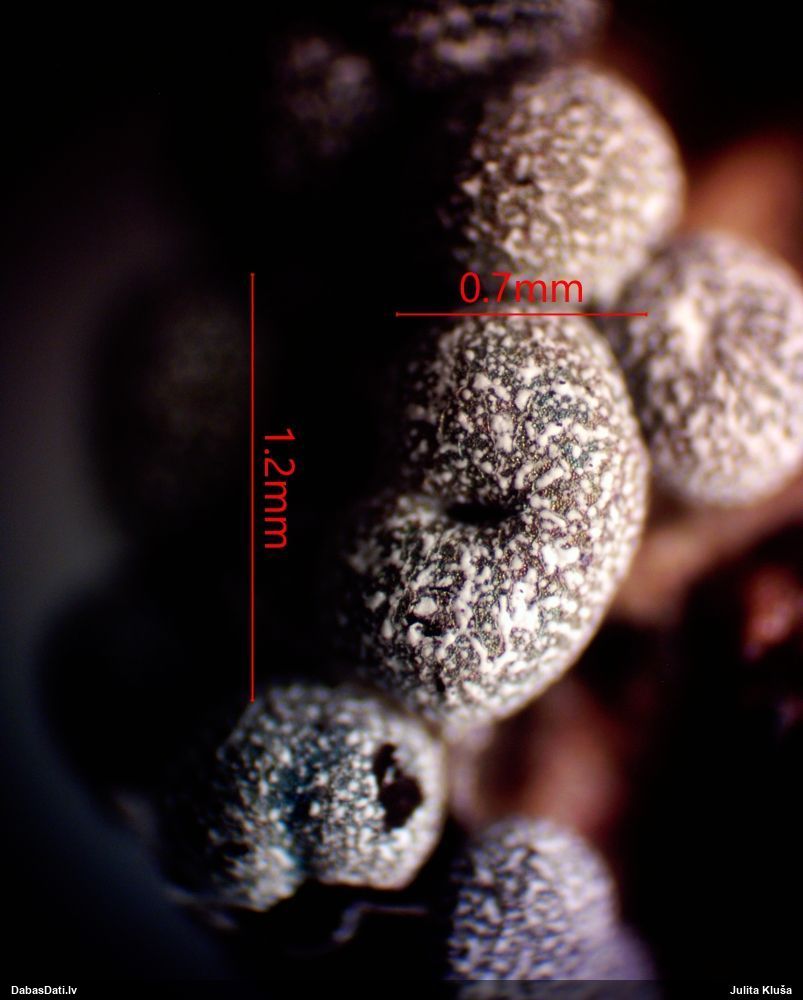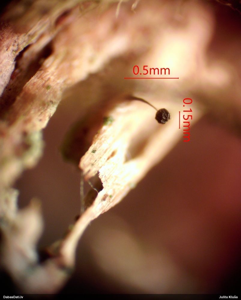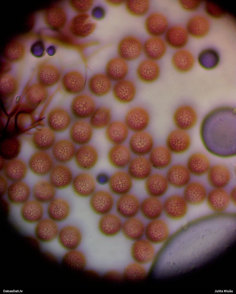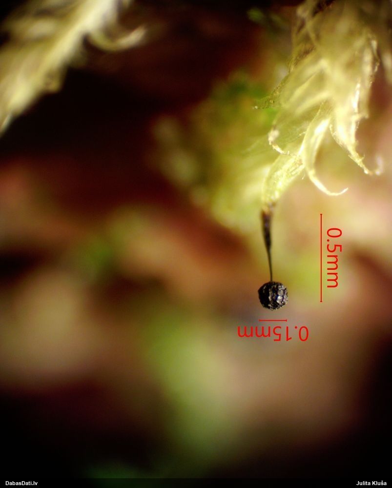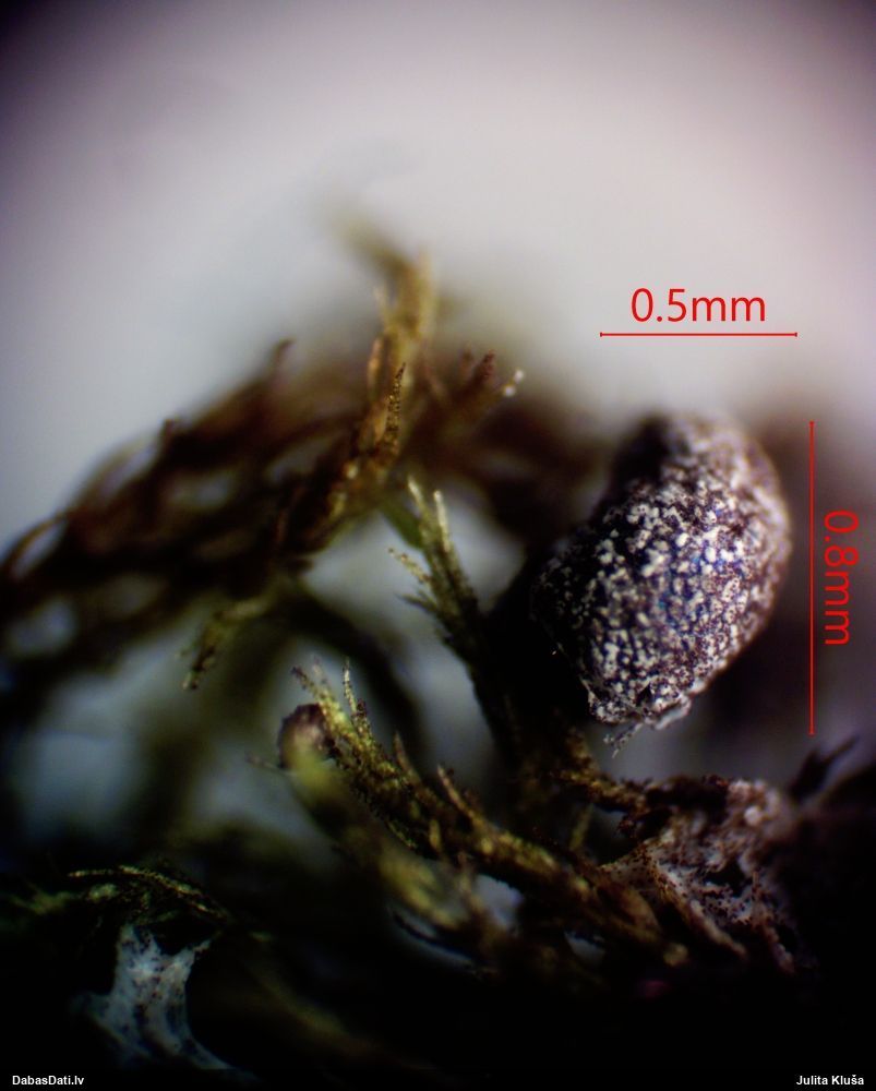 Paldies, Raivo! Ar acu gaišumu man arvien sliktāk, bet mikroskops palīdz. Jā, gribēju teikt, ka paraugam, ja vien nav kāda jutīga atradne, kurai drīkst ievākt tikai mazu gabaliņu, vērts ievākt lielāku gabalu, jo gļotsēnēm patīk kompānija. Un mikroskopa mazajos palielinājumos ar sānu papildus apgaismojumu ir vērts rūpīgi "izstaigāt" visu paraugu. Arī ķērpjus un interesantas sīksēnītes tā var atrast, ko dabā nepamanītu. Ar kriksītēm ir dažādi - pirmās es tā arī tikai citu sugu paraugos pamanīju, bet vēlāk redzēju arī dabā kriskīšu plantācijas - ja to ir daudz, tad var pamanīt jau dabā. Uz sūnām gan ir ekstrēms gadījums, dabā droši nepamanītu, arī eksemplāra noņemšana no sūnas nebija pārāk veiksmīga, tāpēc par noteikšanu mazliet šaubos (sporām mazliet cits tonis). Bet pagaidām citas hipotēzes nav (un konkrētā eksemplāra arī vairs ne).
