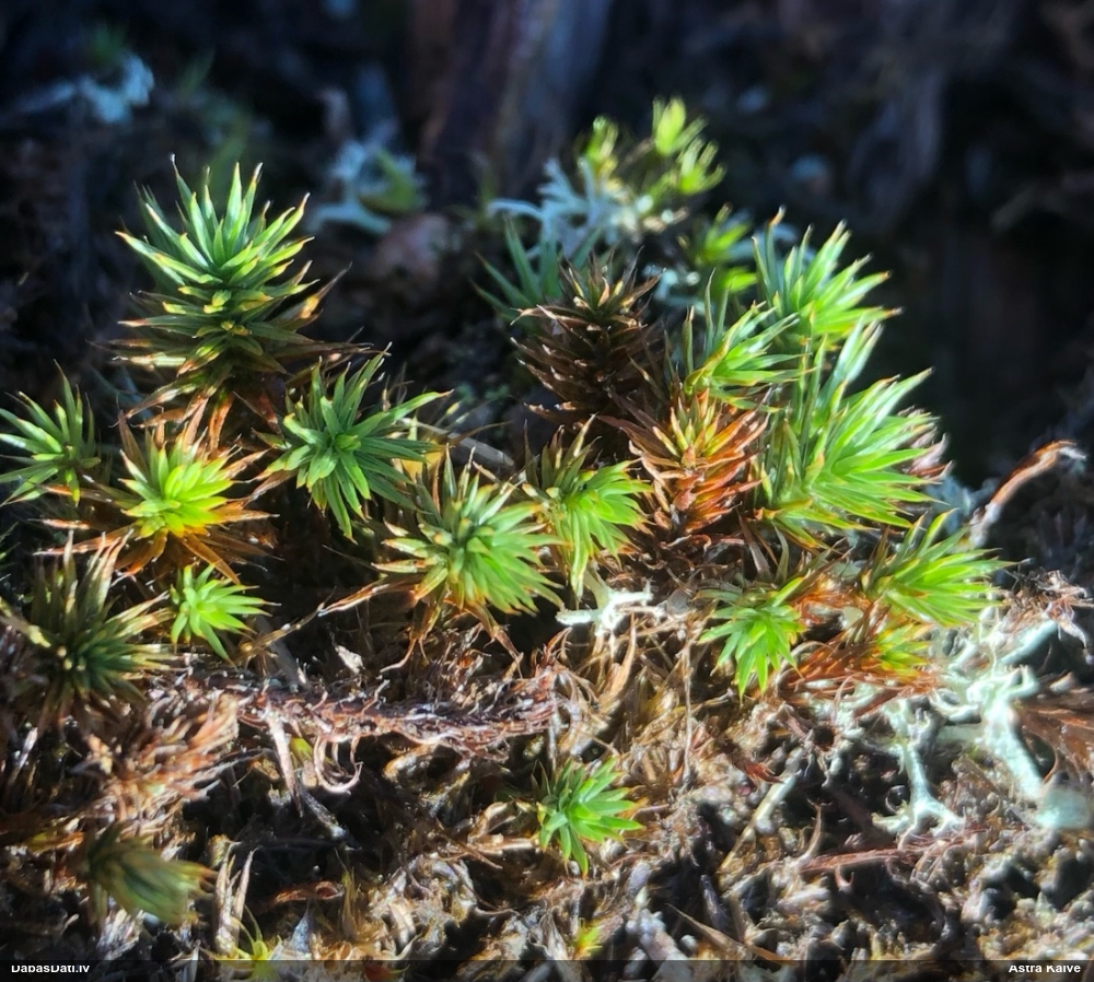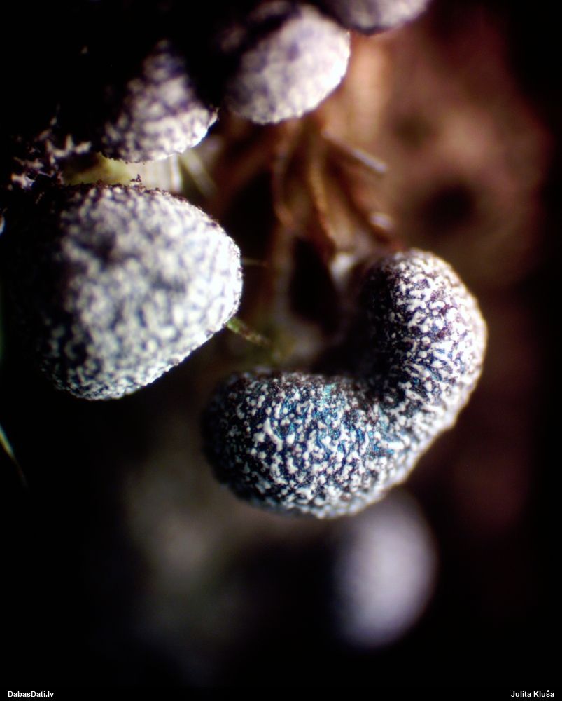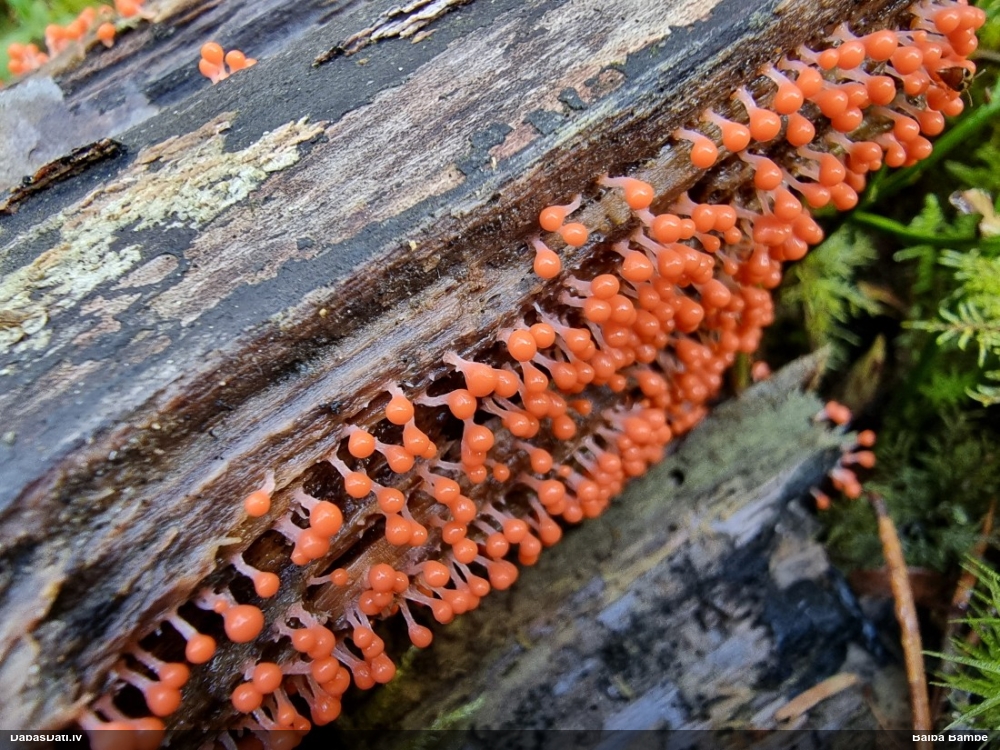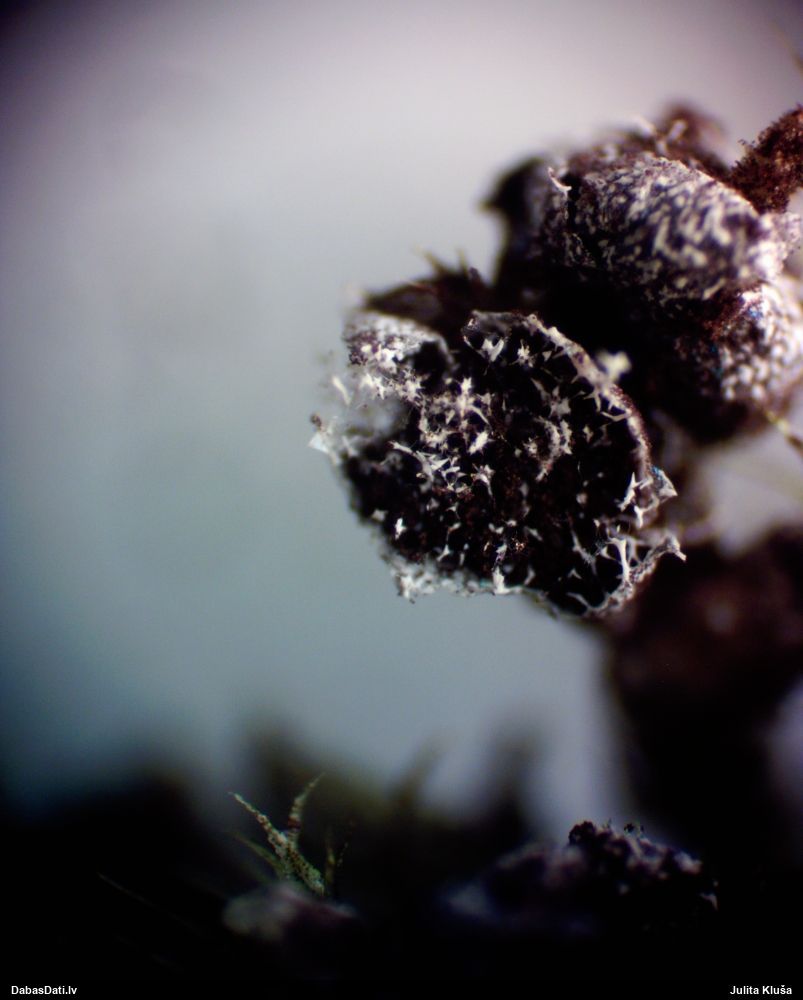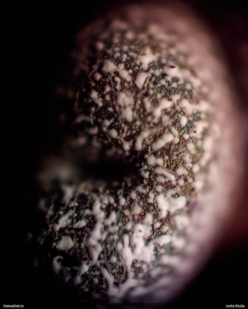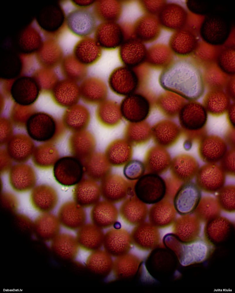 Paldies, Raivo! Ar acu gaišumu man arvien sliktāk, bet mikroskops palīdz. Jā, gribēju teikt, ka paraugam, ja vien nav kāda jutīga atradne, kurai drīkst ievākt tikai mazu gabaliņu, vērts ievākt lielāku gabalu, jo gļotsēnēm patīk kompānija. Un mikroskopa mazajos palielinājumos ar sānu papildus apgaismojumu ir vērts rūpīgi "izstaigāt" visu paraugu. Arī ķērpjus un interesantas sīksēnītes tā var atrast, ko dabā nepamanītu. Ar kriksītēm ir dažādi - pirmās es tā arī tikai citu sugu paraugos pamanīju, bet vēlāk redzēju arī dabā kriskīšu plantācijas - ja to ir daudz, tad var pamanīt jau dabā. Uz sūnām gan ir ekstrēms gadījums, dabā droši nepamanītu, arī eksemplāra noņemšana no sūnas nebija pārāk veiksmīga, tāpēc par noteikšanu mazliet šaubos (sporām mazliet cits tonis). Bet pagaidām citas hipotēzes nav (un konkrētā eksemplāra arī vairs ne).
