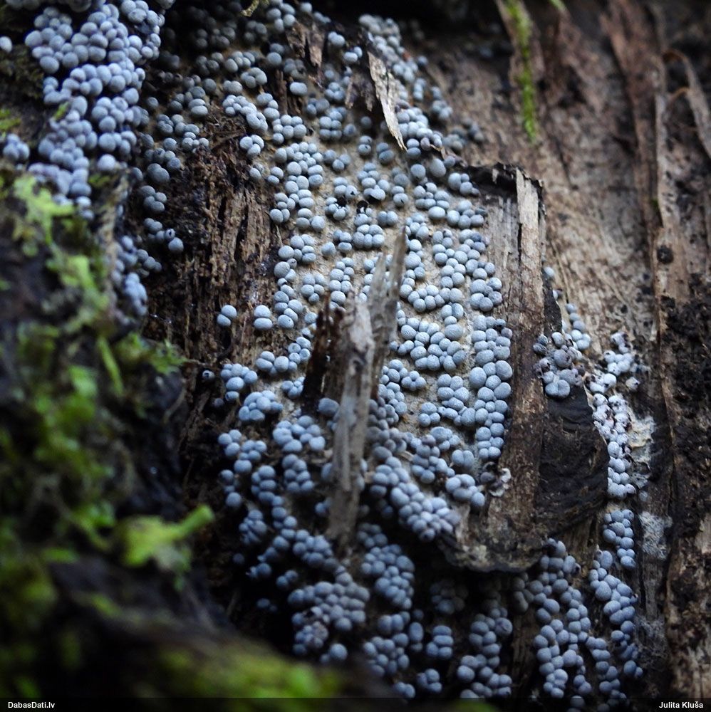 Nu jāā.. Pēc kopskata domājams, ka ļoti reti novērota suga, pēc pašreizējām zināšanām - Badhamia foliicola vai Physarum cinereum. Bet dikti agri! Varētu šogad papētīt, vai tur kas līdzīgs neuzaug. :D