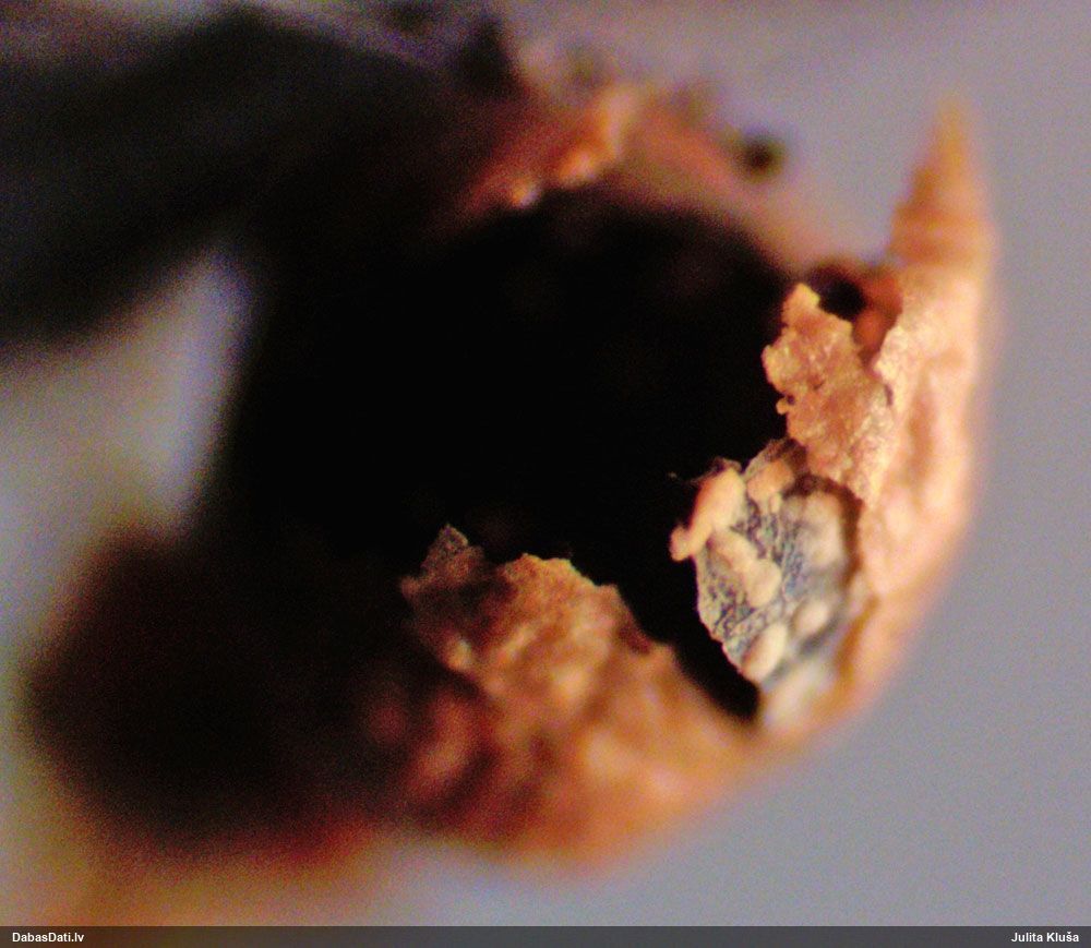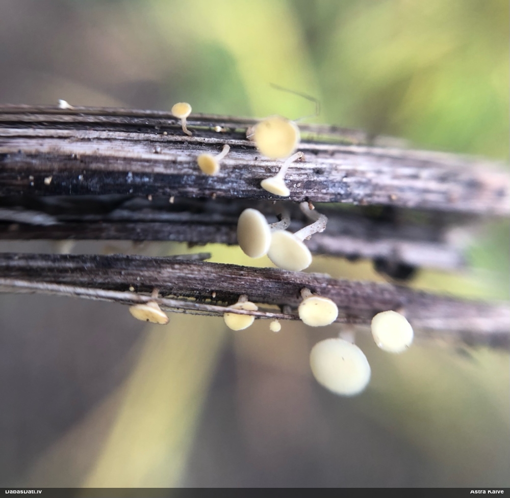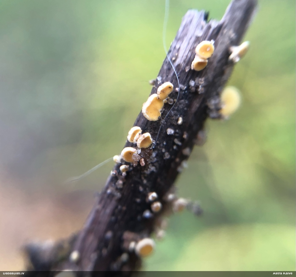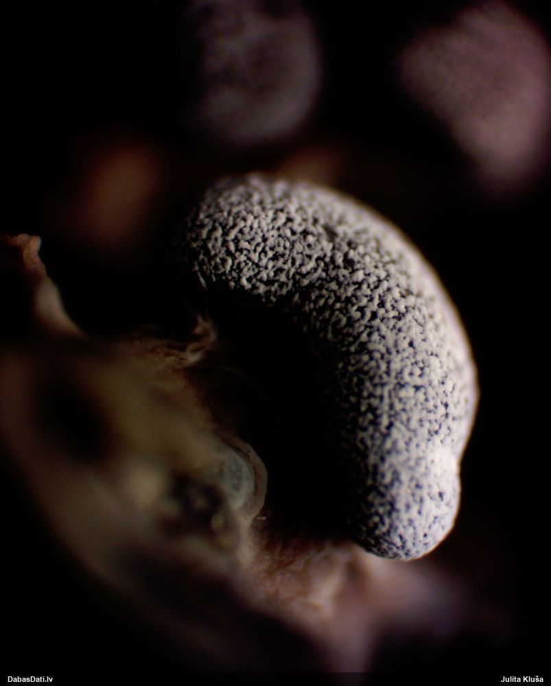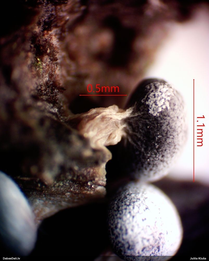 Nevar saprast, uz kā auga - vai tas ir nobirās, vai uz kritalas mizas? Abas hipotēzes ir "pa tēmu", bet man "nepatīk" kopskats, kur skaidri redzams, ka vairāki augļķermeņi ir cieši kopā, bet tas nav raksturīgs ne vienai, ne otrai hipotēzei, kur augļķermeņi tipiski ir nodalīti. Ļoti interesanti, ja ir paraugs, tad kāds tas izskatās tagad, un vispār to vajadzētu mikroskopēt.