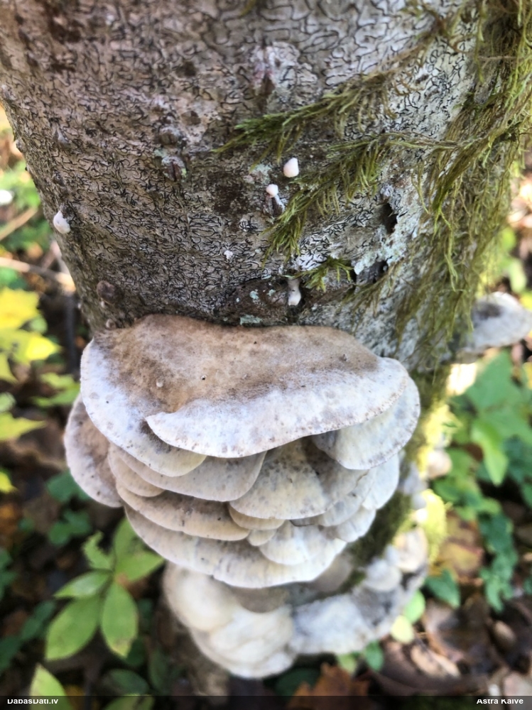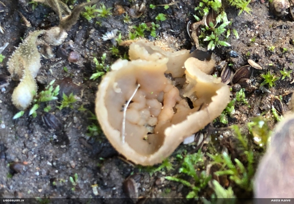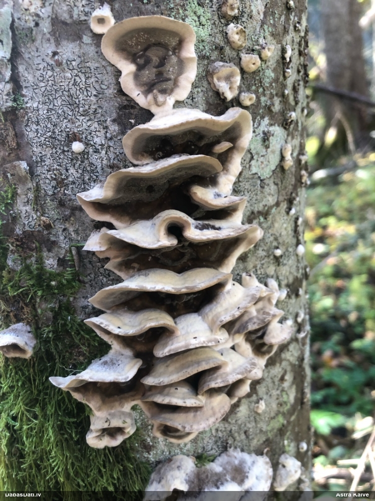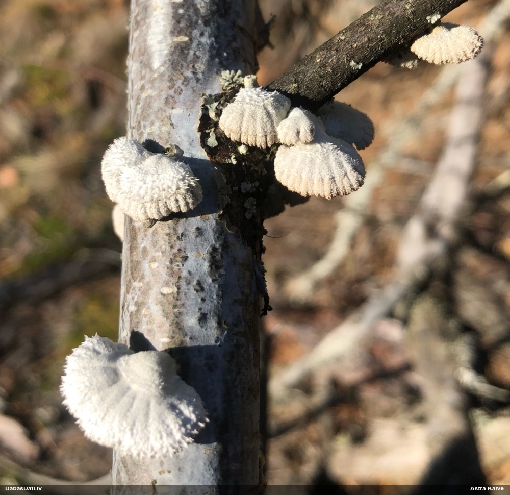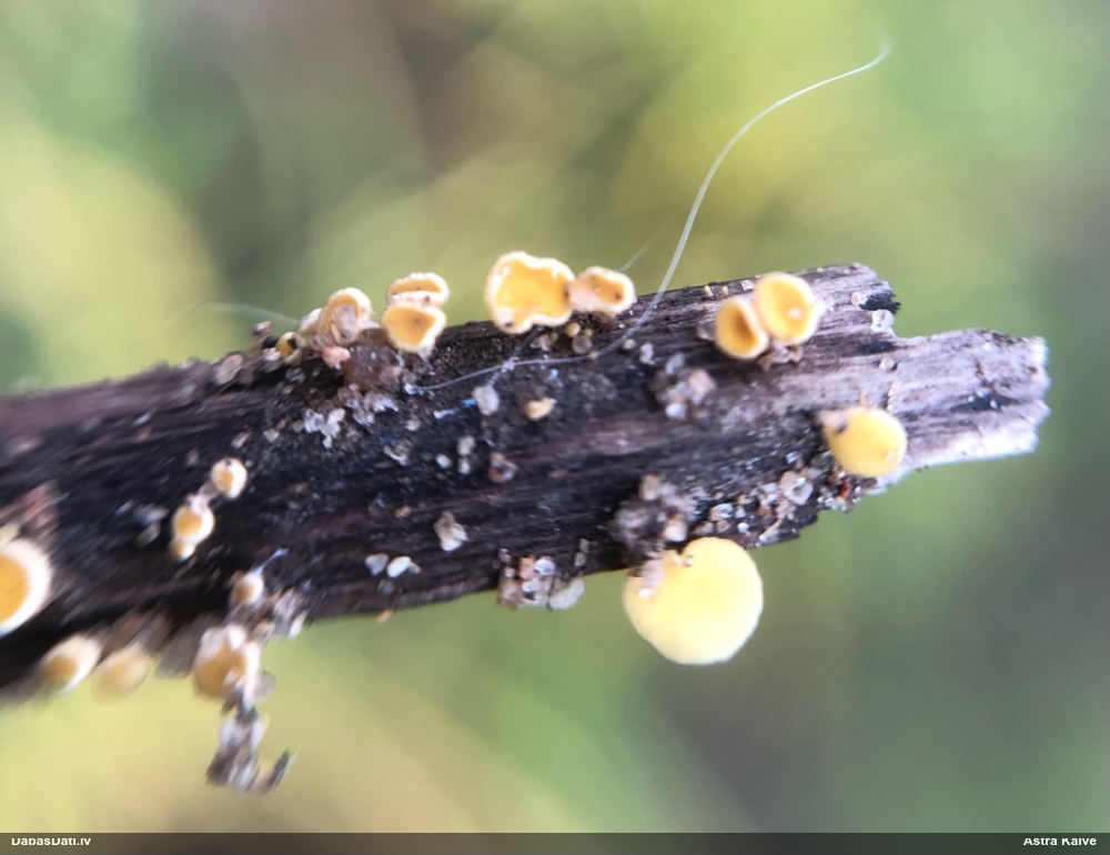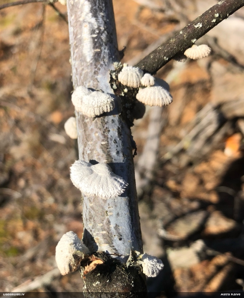 Nevar saprast, uz kā auga - vai tas ir nobirās, vai uz kritalas mizas? Abas hipotēzes ir "pa tēmu", bet man "nepatīk" kopskats, kur skaidri redzams, ka vairāki augļķermeņi ir cieši kopā, bet tas nav raksturīgs ne vienai, ne otrai hipotēzei, kur augļķermeņi tipiski ir nodalīti. Ļoti interesanti, ja ir paraugs, tad kāds tas izskatās tagad, un vispār to vajadzētu mikroskopēt.