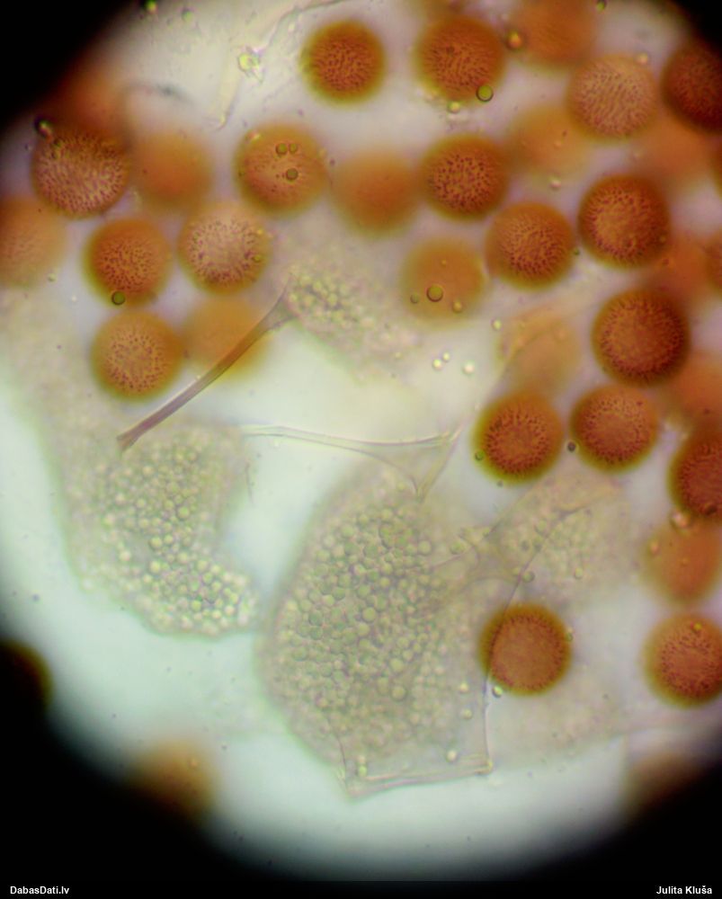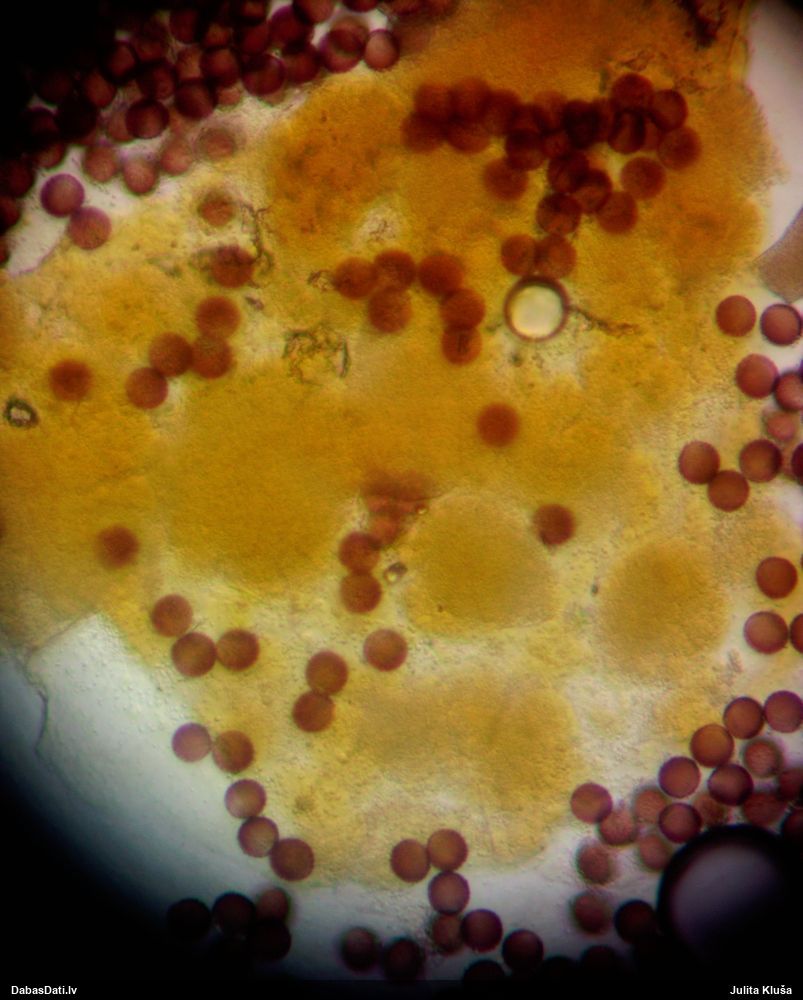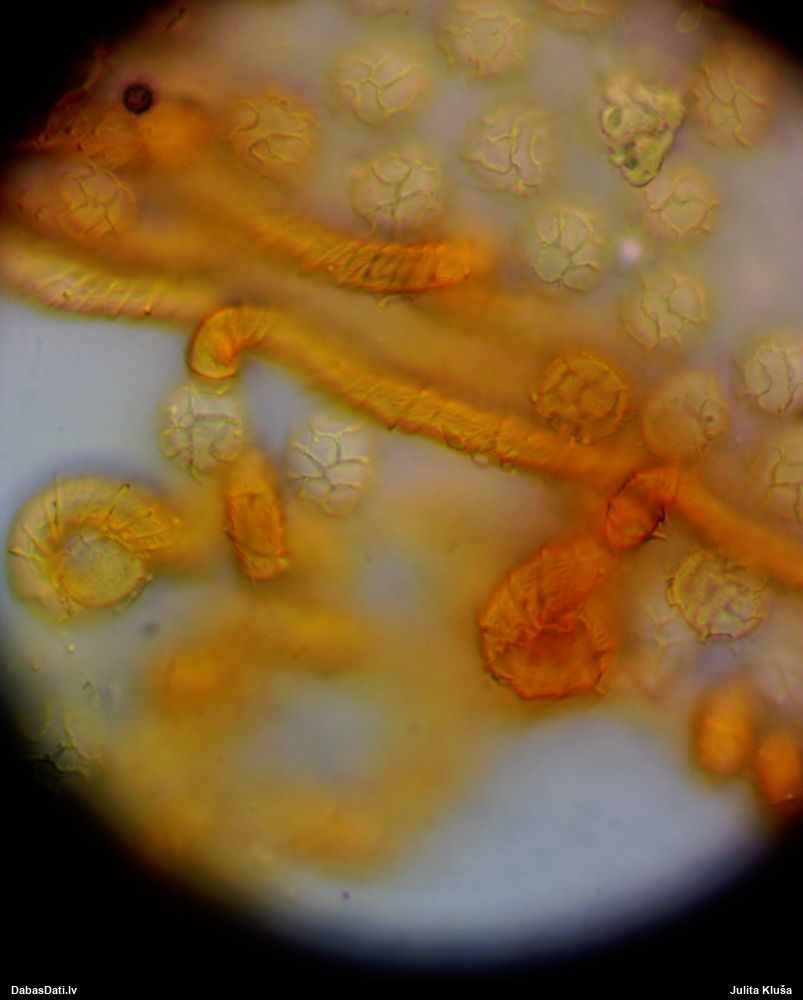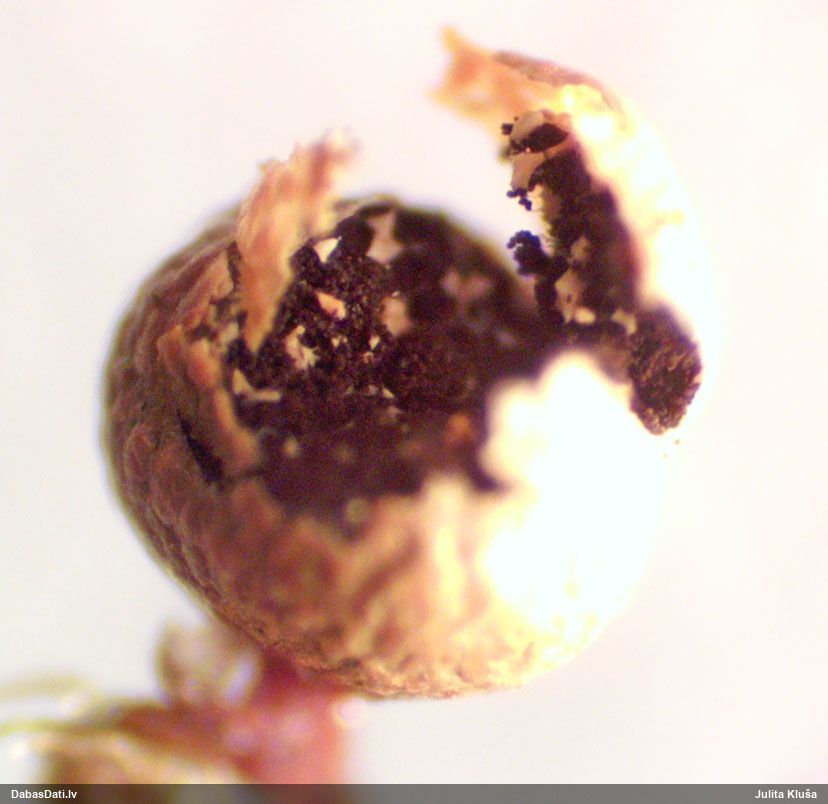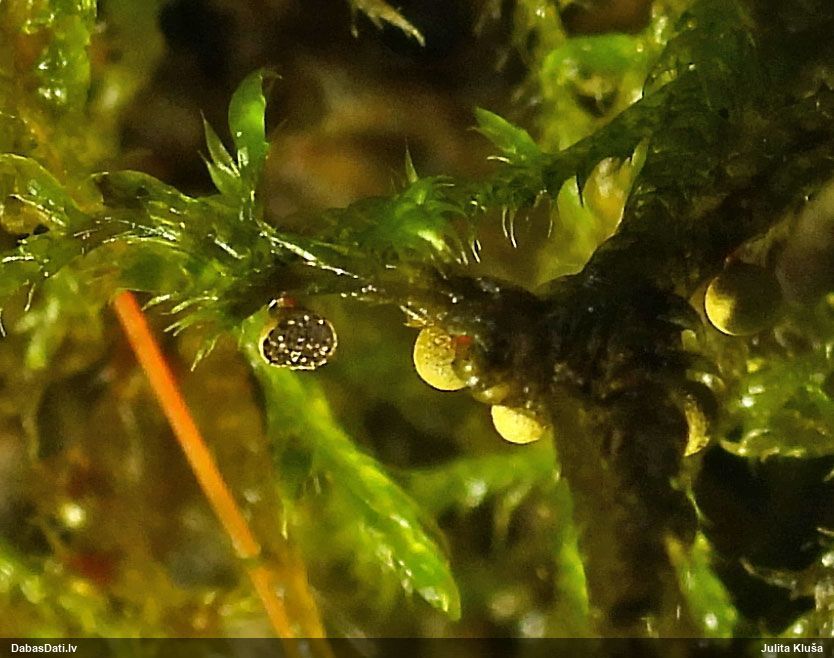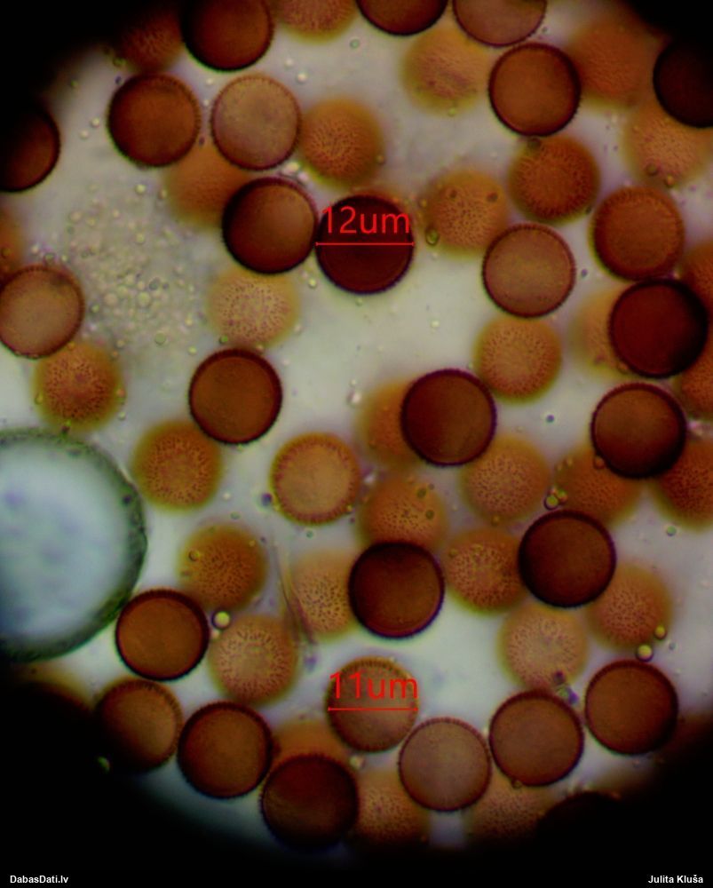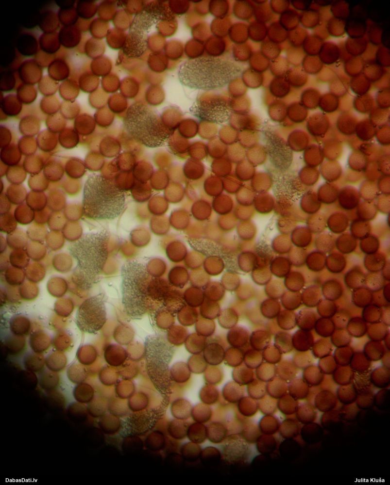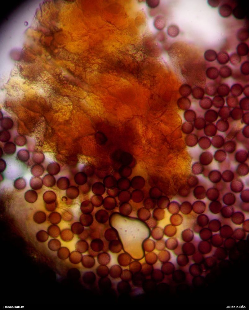Paldies, Raivo! Ar acu gaišumu man arvien sliktāk, bet mikroskops palīdz. Jā, gribēju teikt, ka paraugam, ja vien nav kāda jutīga atradne, kurai drīkst ievākt tikai mazu gabaliņu, vērts ievākt lielāku gabalu, jo gļotsēnēm patīk kompānija. Un mikroskopa mazajos palielinājumos ar sānu papildus apgaismojumu ir vērts rūpīgi "izstaigāt" visu paraugu. Arī ķērpjus un interesantas sīksēnītes tā var atrast, ko dabā nepamanītu. Ar kriksītēm ir dažādi - pirmās es tā arī tikai citu sugu paraugos pamanīju, bet vēlāk redzēju arī dabā kriskīšu plantācijas - ja to ir daudz, tad var pamanīt jau dabā. Uz sūnām gan ir ekstrēms gadījums, dabā droši nepamanītu, arī eksemplāra noņemšana no sūnas nebija pārāk veiksmīga, tāpēc par noteikšanu mazliet šaubos (sporām mazliet cits tonis). Bet pagaidām citas hipotēzes nav (un konkrētā eksemplāra arī vairs ne).