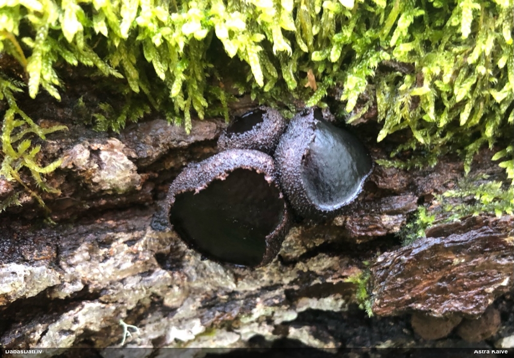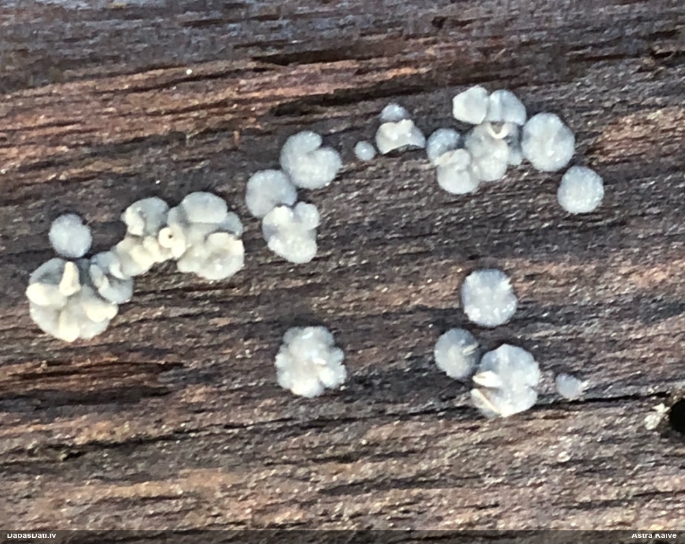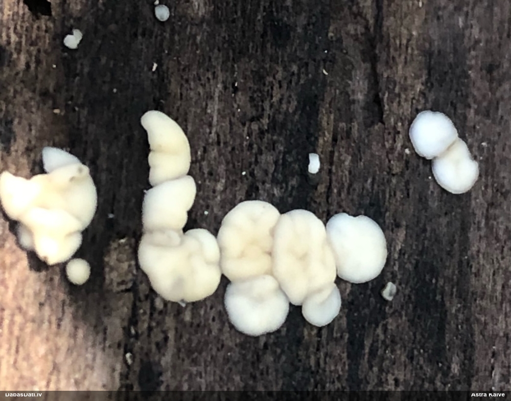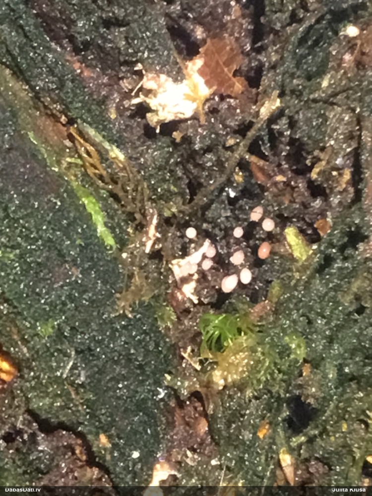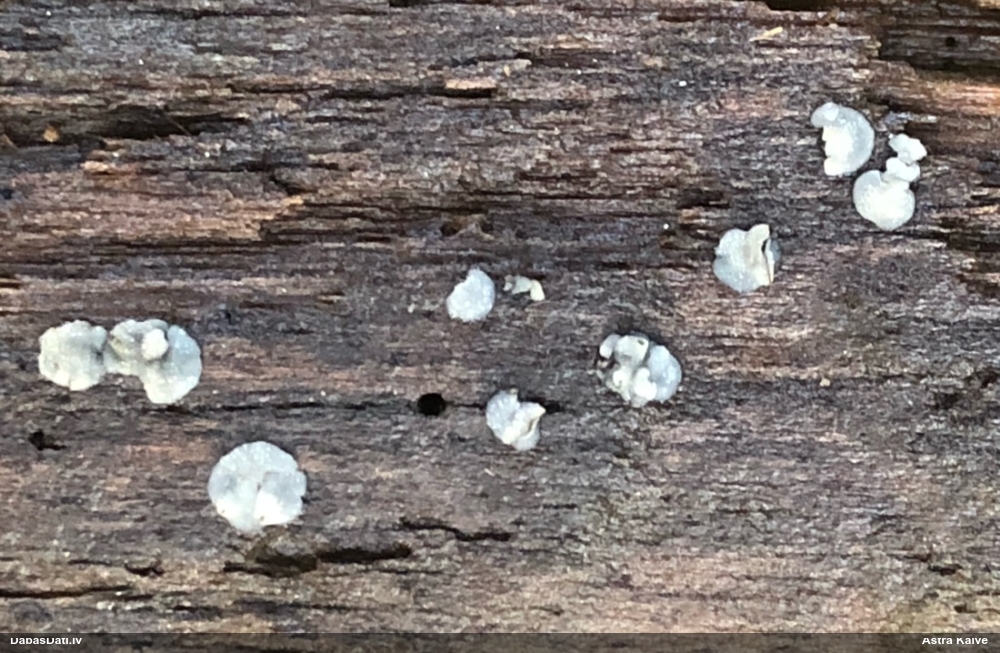 Nevar saprast, uz kā auga - vai tas ir nobirās, vai uz kritalas mizas? Abas hipotēzes ir "pa tēmu", bet man "nepatīk" kopskats, kur skaidri redzams, ka vairāki augļķermeņi ir cieši kopā, bet tas nav raksturīgs ne vienai, ne otrai hipotēzei, kur augļķermeņi tipiski ir nodalīti. Ļoti interesanti, ja ir paraugs, tad kāds tas izskatās tagad, un vispār to vajadzētu mikroskopēt.