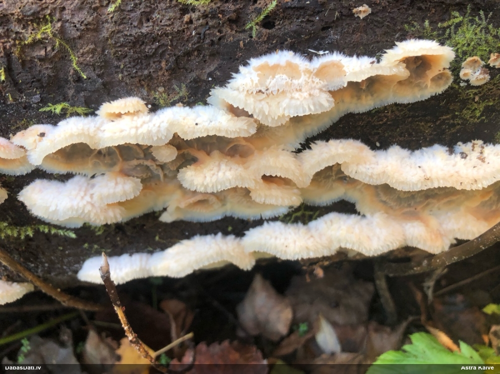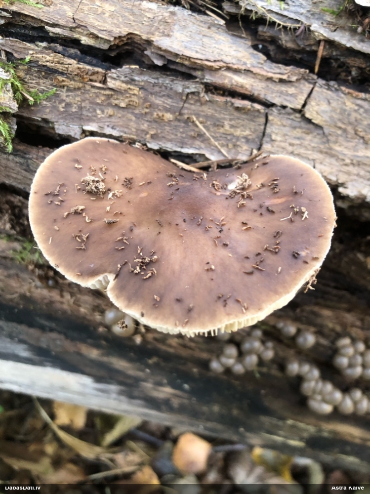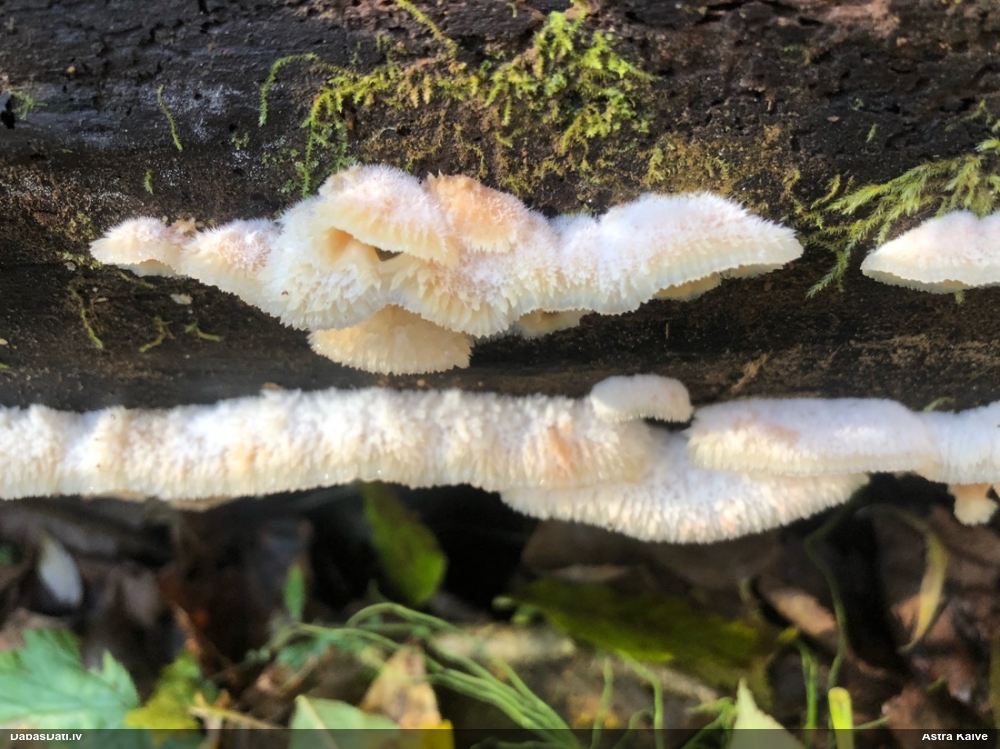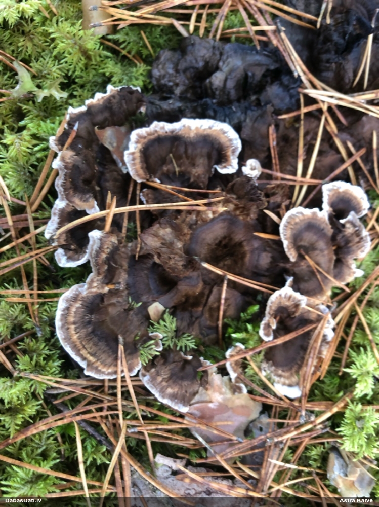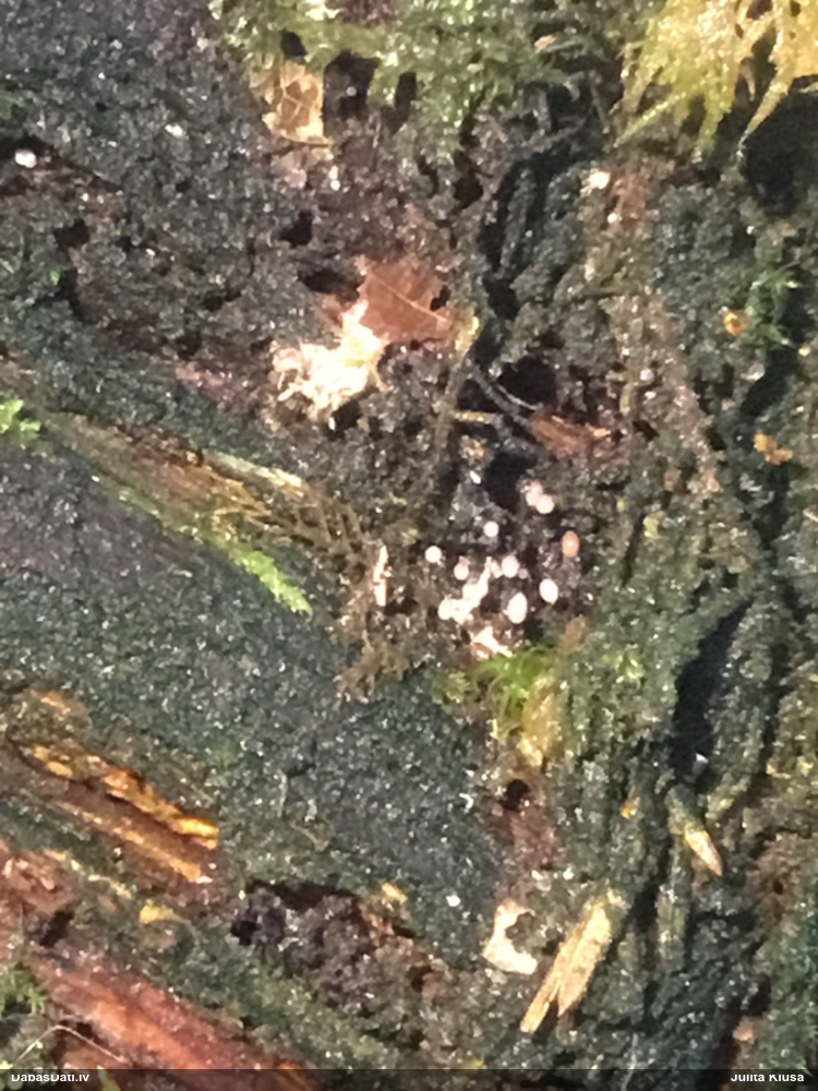 Nevar saprast, uz kā auga - vai tas ir nobirās, vai uz kritalas mizas? Abas hipotēzes ir "pa tēmu", bet man "nepatīk" kopskats, kur skaidri redzams, ka vairāki augļķermeņi ir cieši kopā, bet tas nav raksturīgs ne vienai, ne otrai hipotēzei, kur augļķermeņi tipiski ir nodalīti. Ļoti interesanti, ja ir paraugs, tad kāds tas izskatās tagad, un vispār to vajadzētu mikroskopēt.