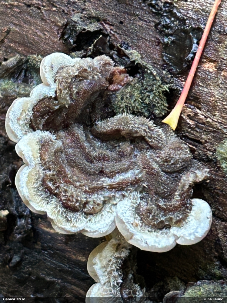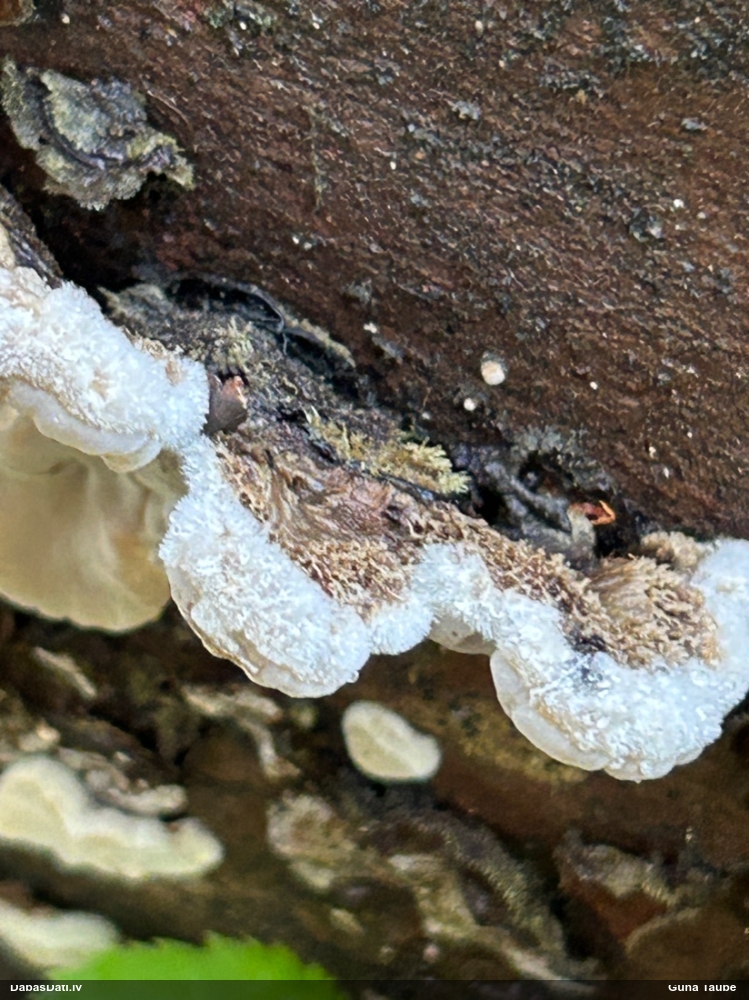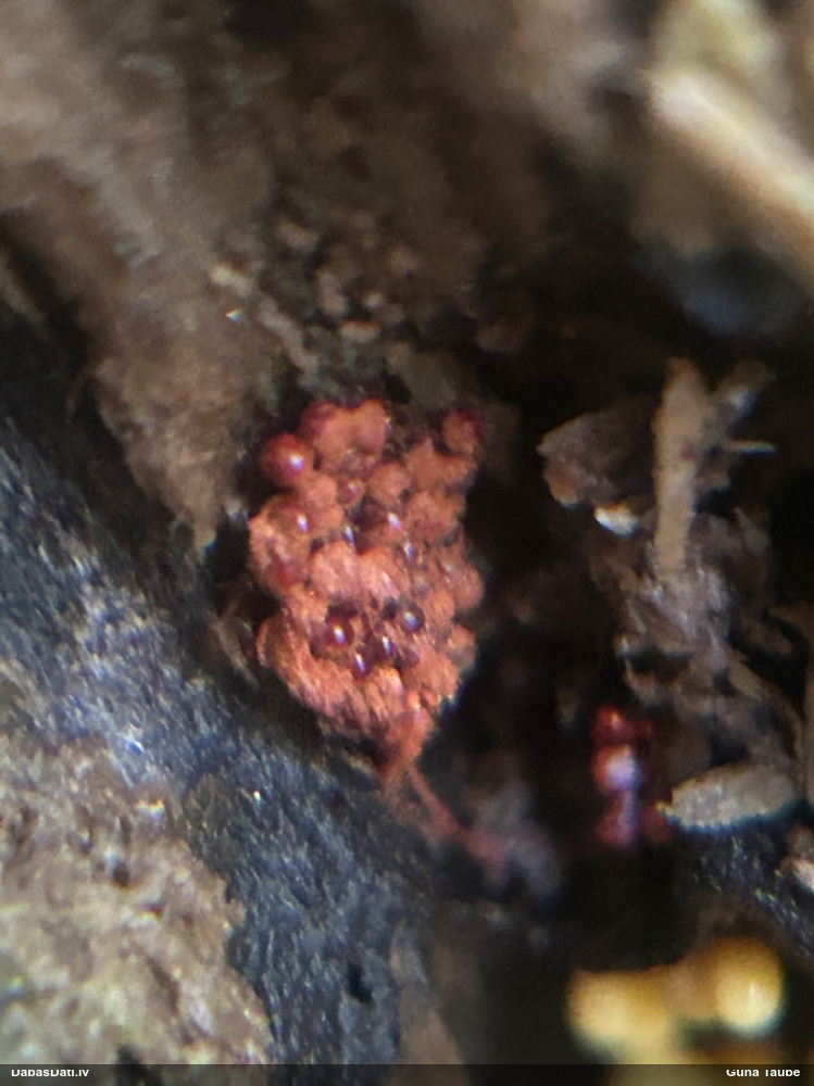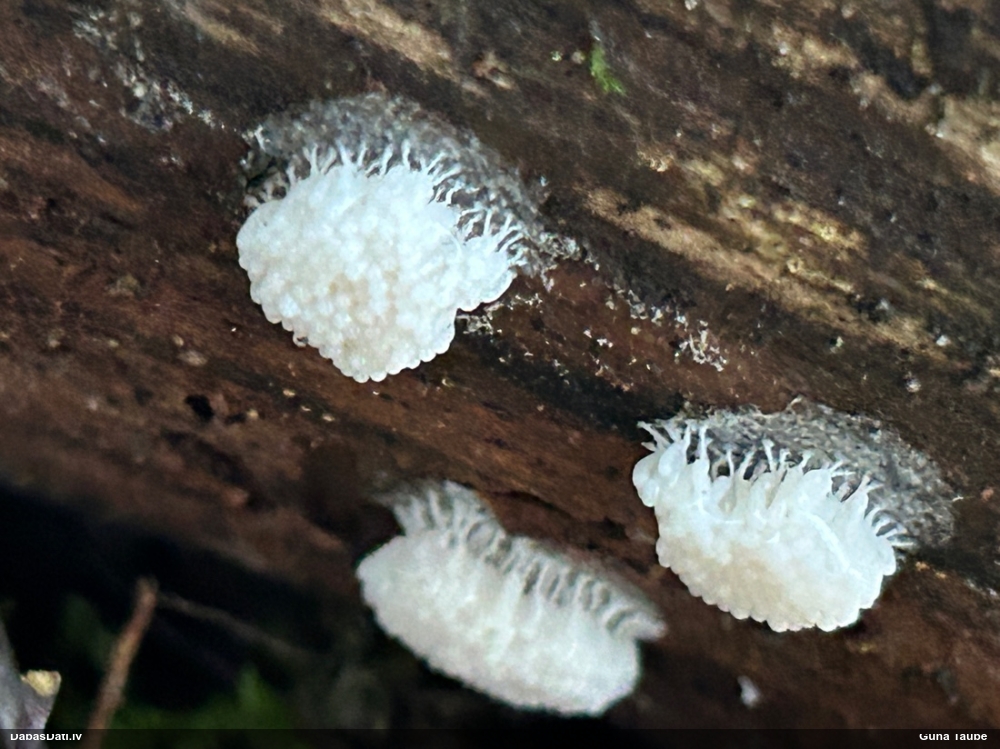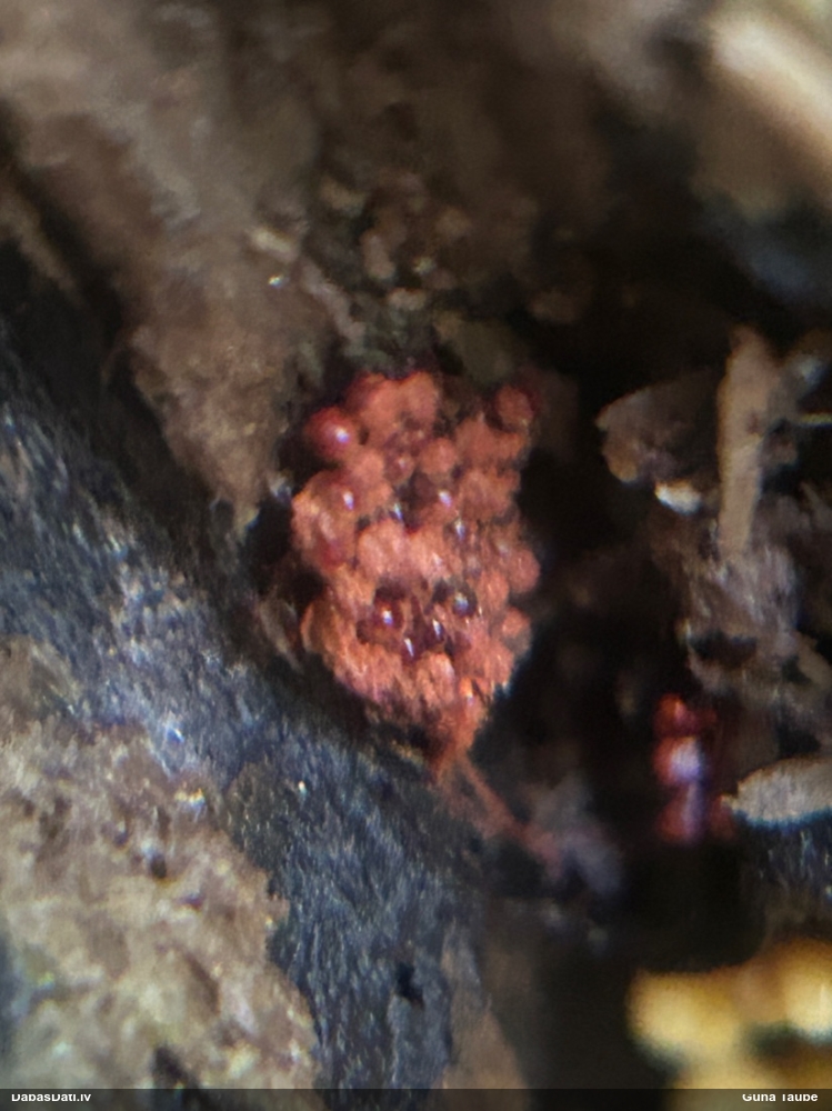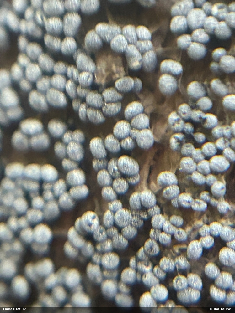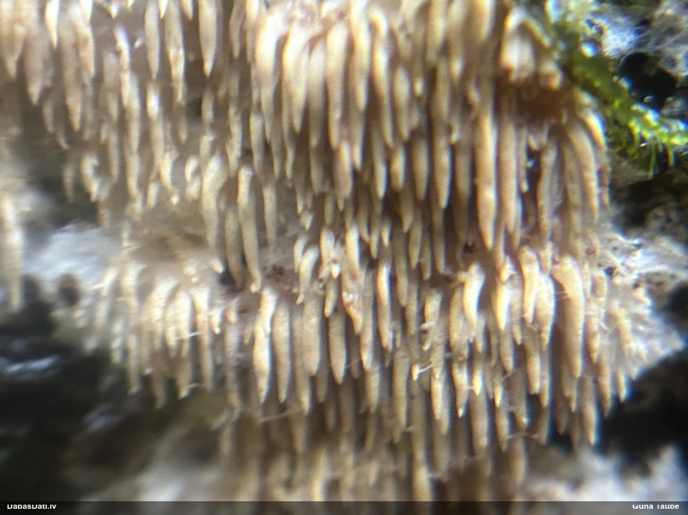 Nevar saprast, uz kā auga - vai tas ir nobirās, vai uz kritalas mizas? Abas hipotēzes ir "pa tēmu", bet man "nepatīk" kopskats, kur skaidri redzams, ka vairāki augļķermeņi ir cieši kopā, bet tas nav raksturīgs ne vienai, ne otrai hipotēzei, kur augļķermeņi tipiski ir nodalīti. Ļoti interesanti, ja ir paraugs, tad kāds tas izskatās tagad, un vispār to vajadzētu mikroskopēt.