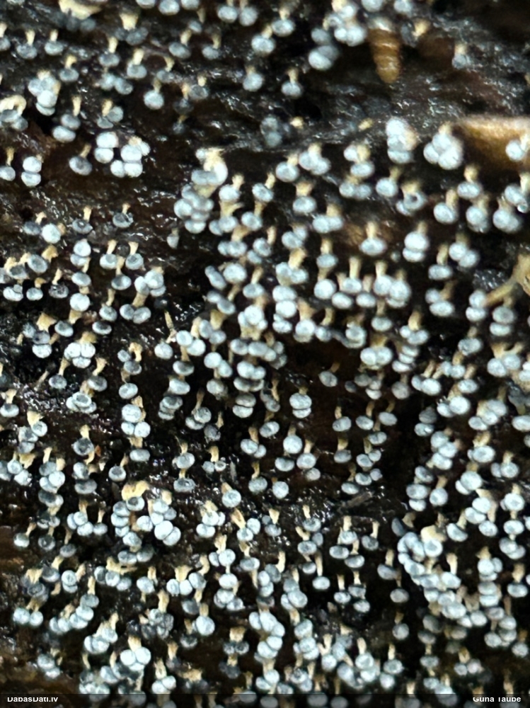 Šobrīd varu iedomāties 2 variantus - melnā plaispika Amaurochaete atra vai parastais gļotpūpēdis Reticularia lycoperdon. Pēc izmēra, augšanas laika un augšanas uz apstrādāta koka atbilst abas.