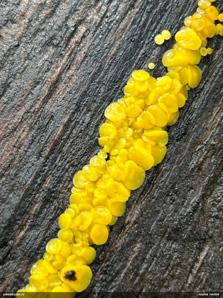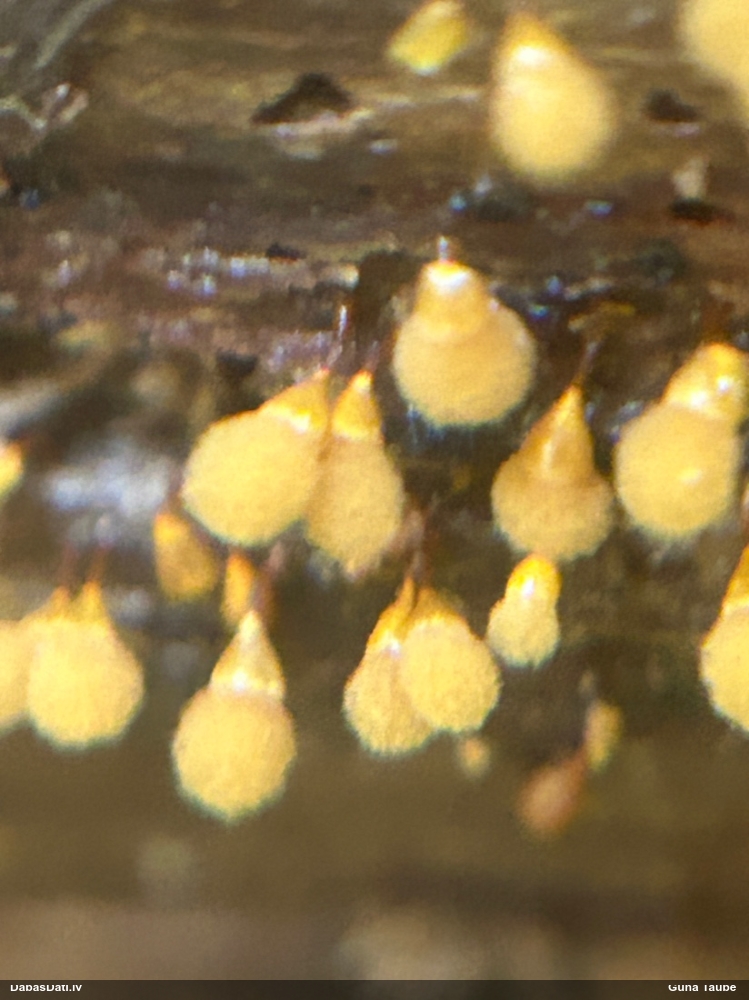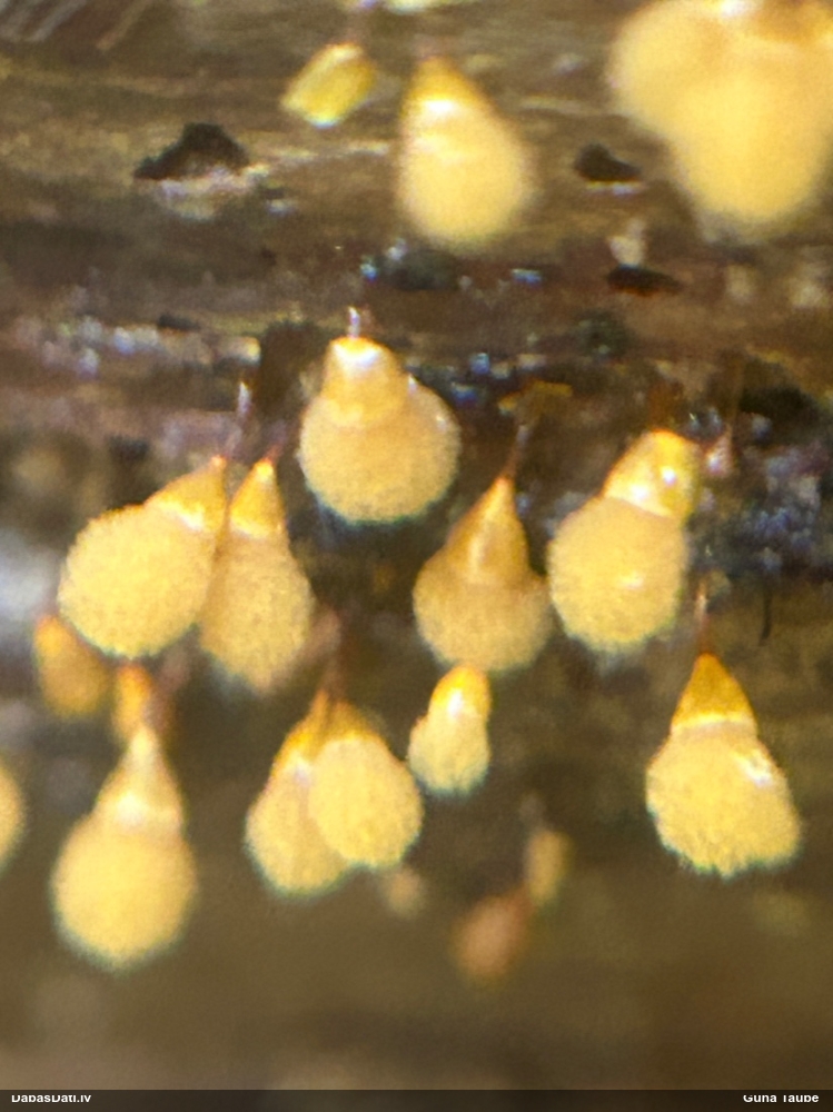 Julitas, šai paņemts paraugs, diezgan izsporojies. Un tai otrai līdzīgajai, kam ieziņots novērojums, arī. Pārliecinājos, ka tiešām egles kritalas. Bet tādu gļotsēņu diezgan daudz, vai uz katras egles kritalas, daudzās vietās stumbram, tagad dzeltenos sporu mākoņus labi redz.