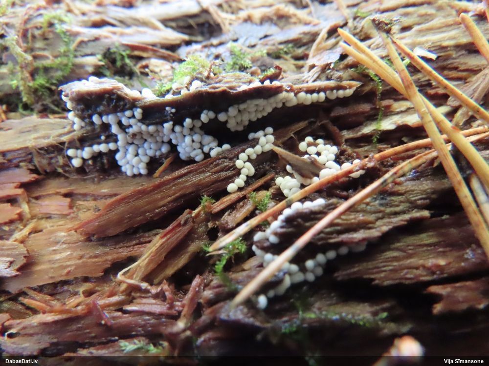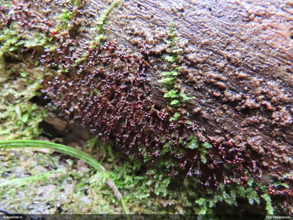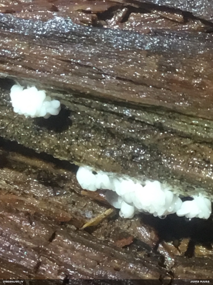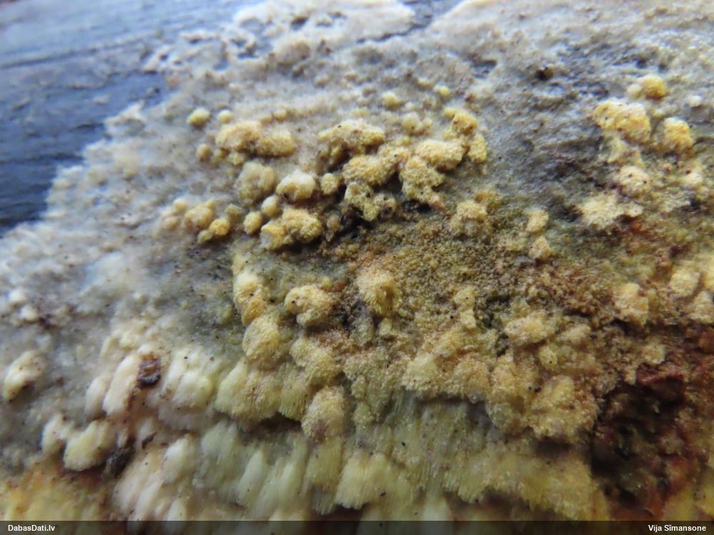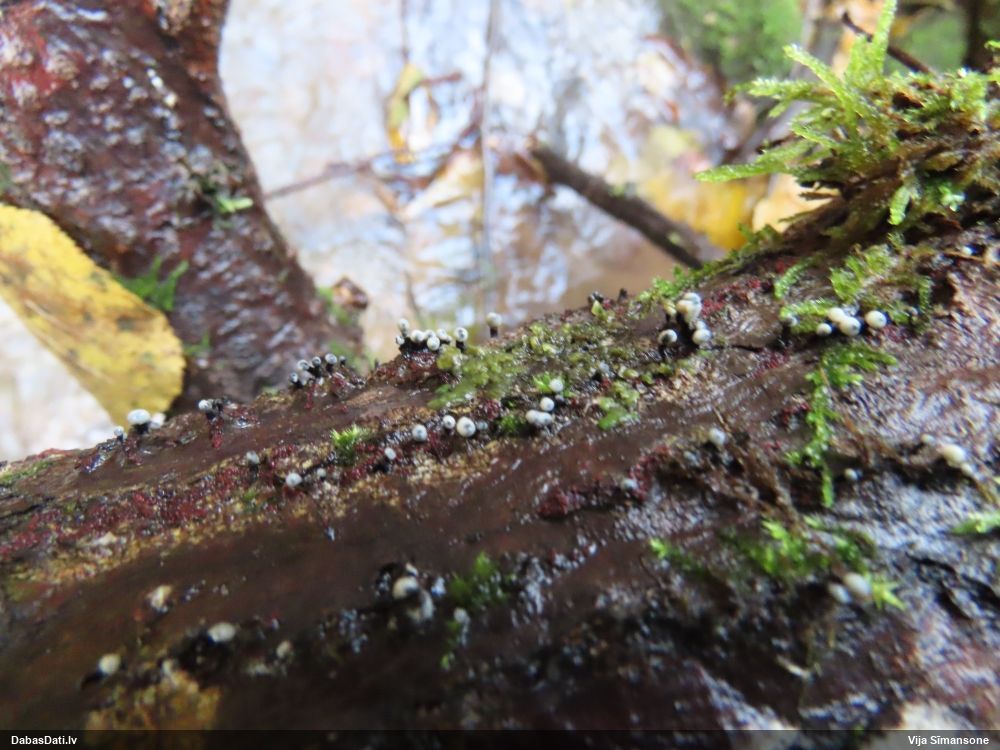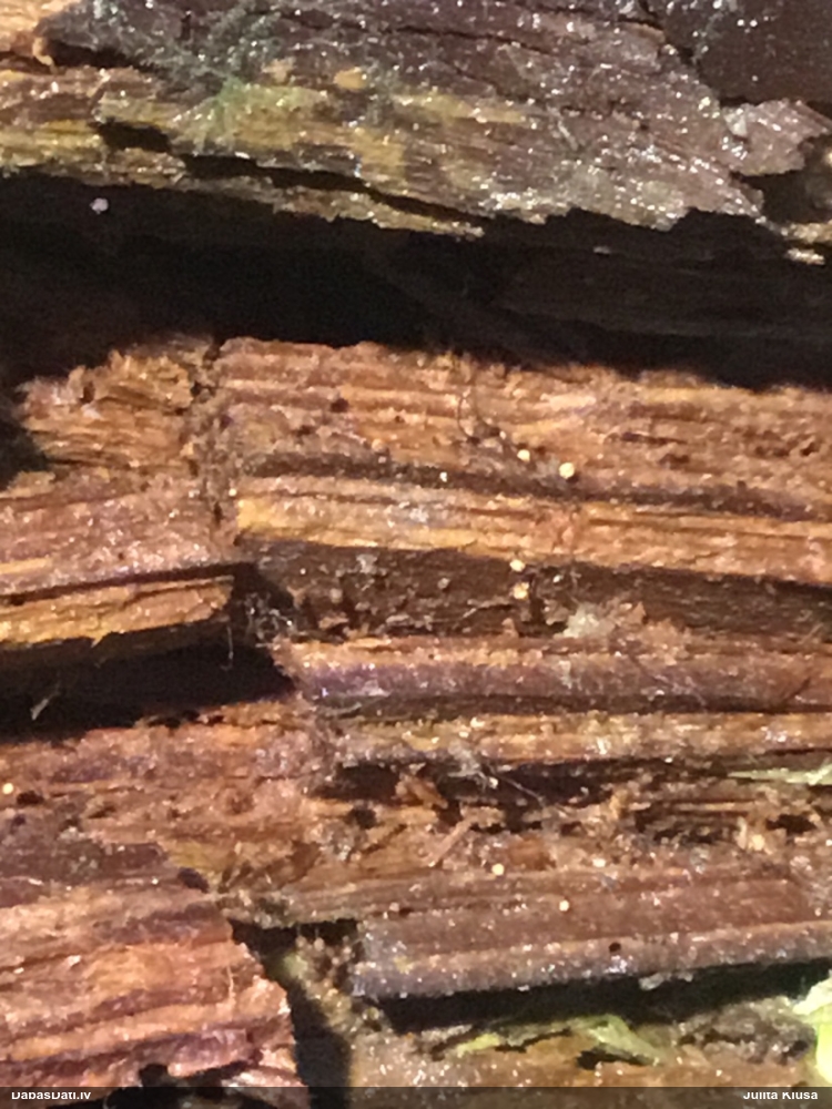 Nevar saprast, uz kā auga - vai tas ir nobirās, vai uz kritalas mizas? Abas hipotēzes ir "pa tēmu", bet man "nepatīk" kopskats, kur skaidri redzams, ka vairāki augļķermeņi ir cieši kopā, bet tas nav raksturīgs ne vienai, ne otrai hipotēzei, kur augļķermeņi tipiski ir nodalīti. Ļoti interesanti, ja ir paraugs, tad kāds tas izskatās tagad, un vispār to vajadzētu mikroskopēt.