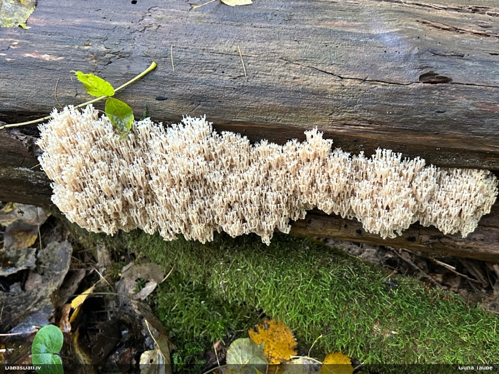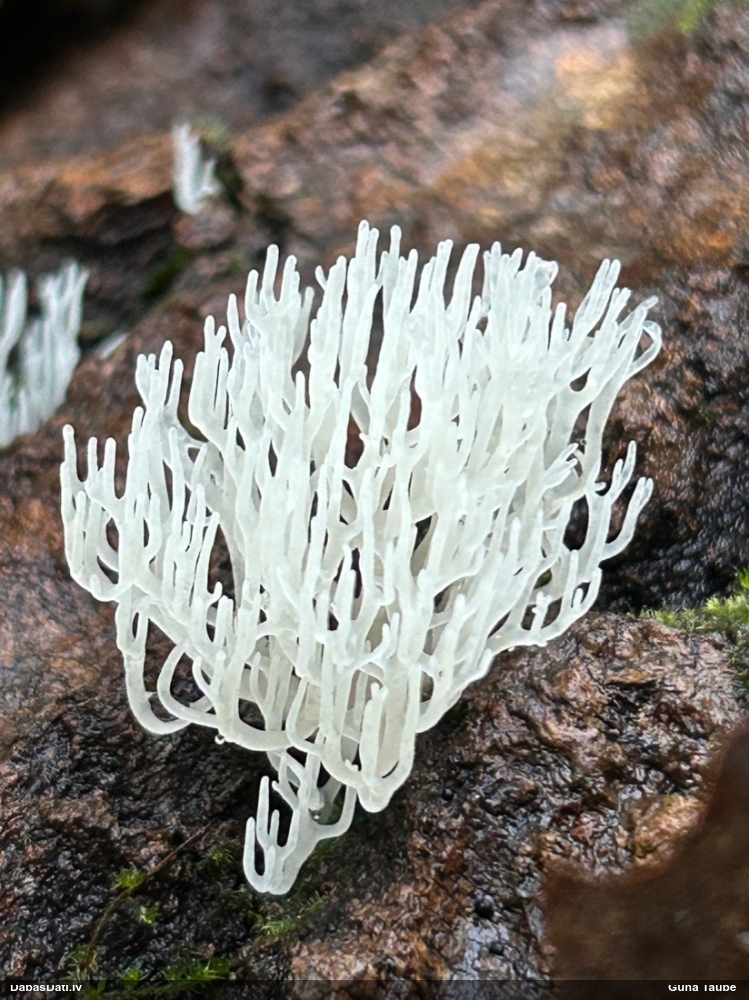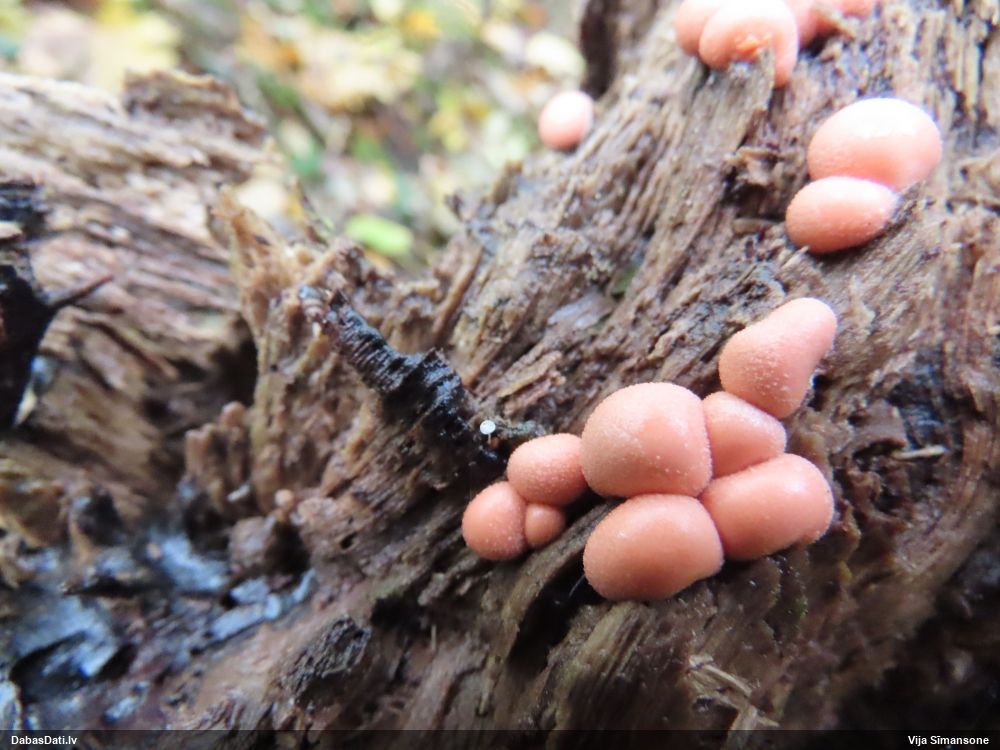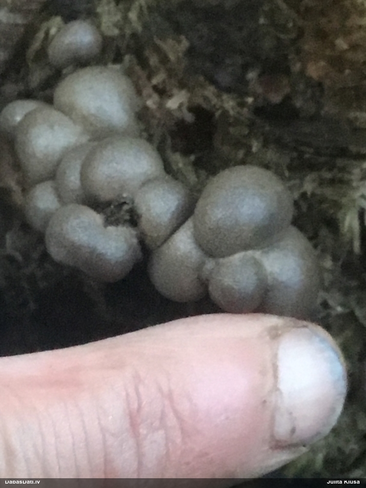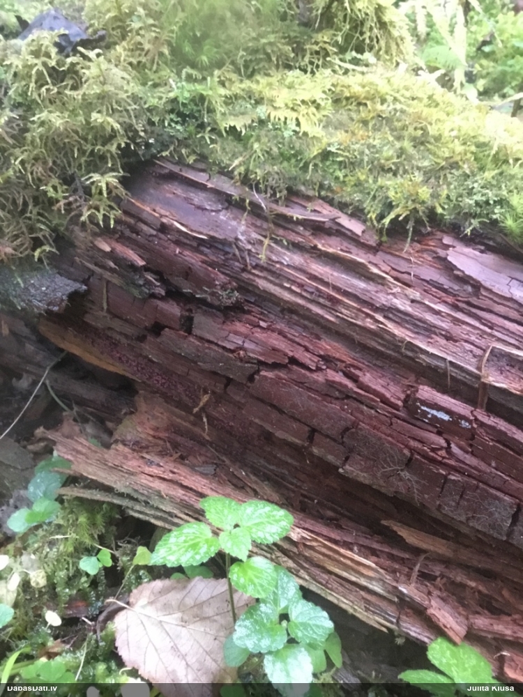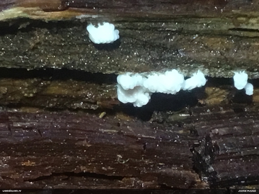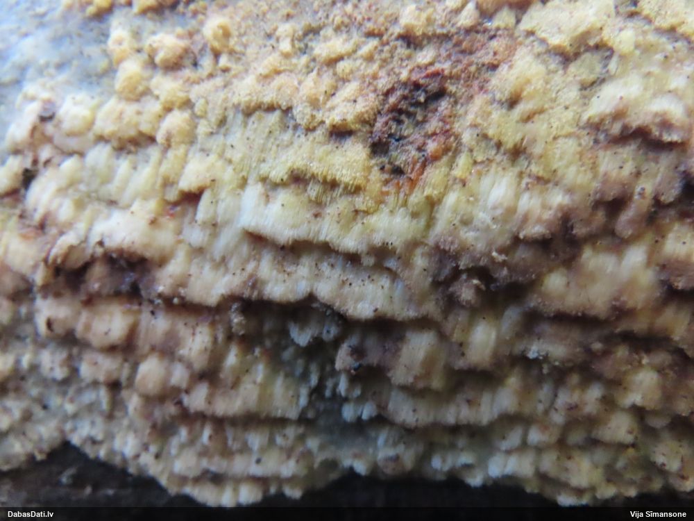 Nevar saprast, uz kā auga - vai tas ir nobirās, vai uz kritalas mizas? Abas hipotēzes ir "pa tēmu", bet man "nepatīk" kopskats, kur skaidri redzams, ka vairāki augļķermeņi ir cieši kopā, bet tas nav raksturīgs ne vienai, ne otrai hipotēzei, kur augļķermeņi tipiski ir nodalīti. Ļoti interesanti, ja ir paraugs, tad kāds tas izskatās tagad, un vispār to vajadzētu mikroskopēt.