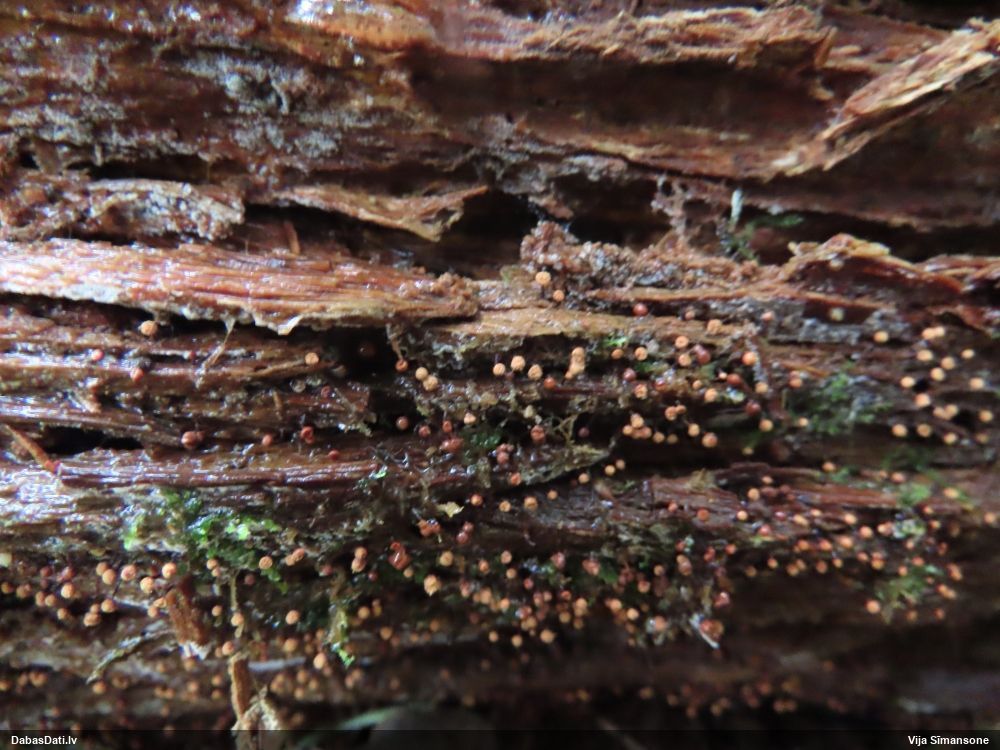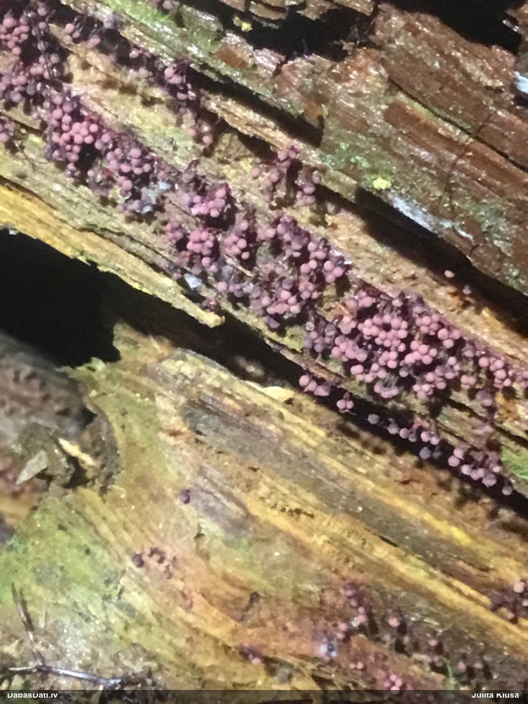 Šobrīd varu iedomāties 2 variantus - melnā plaispika Amaurochaete atra vai parastais gļotpūpēdis Reticularia lycoperdon. Pēc izmēra, augšanas laika un augšanas uz apstrādāta koka atbilst abas.
