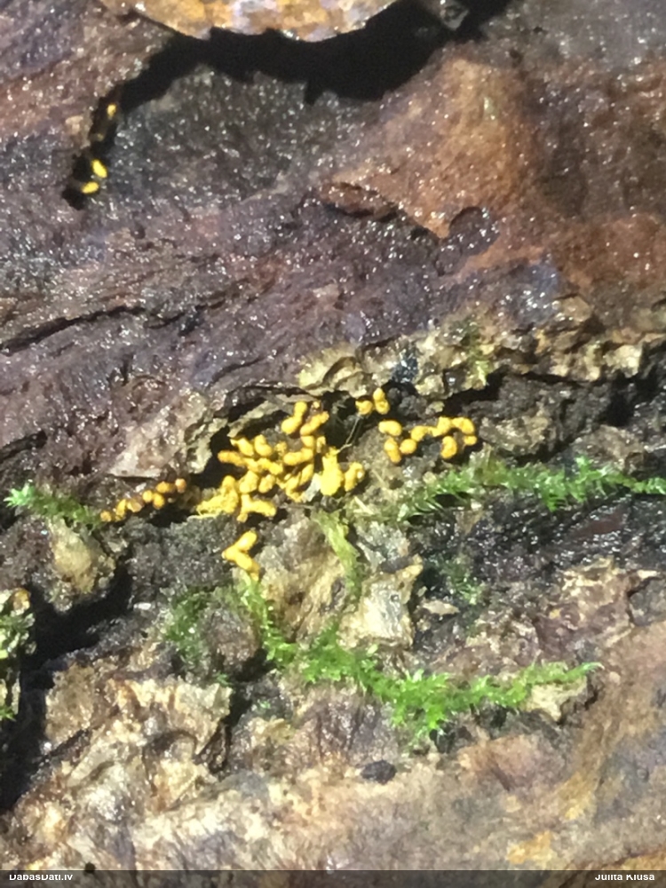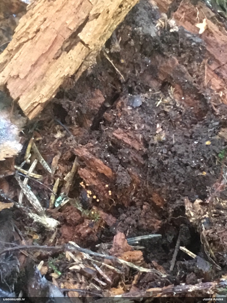 Julitas, šai paņemts paraugs, diezgan izsporojies. Un tai otrai līdzīgajai, kam ieziņots novērojums, arī. Pārliecinājos, ka tiešām egles kritalas. Bet tādu gļotsēņu diezgan daudz, vai uz katras egles kritalas, daudzās vietās stumbram, tagad dzeltenos sporu mākoņus labi redz.