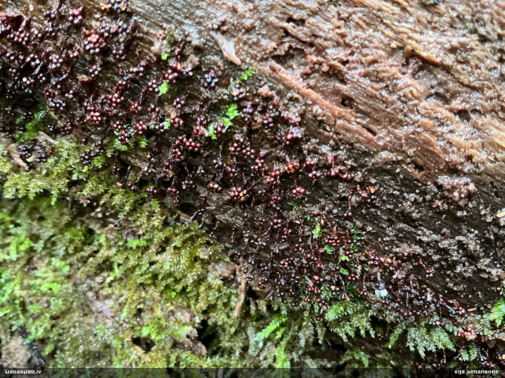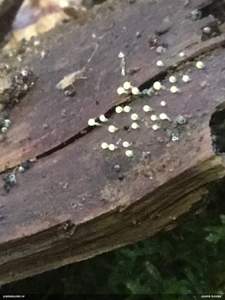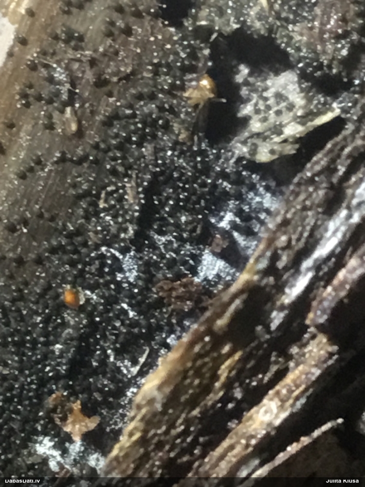 Šobrīd varu iedomāties 2 variantus - melnā plaispika Amaurochaete atra vai parastais gļotpūpēdis Reticularia lycoperdon. Pēc izmēra, augšanas laika un augšanas uz apstrādāta koka atbilst abas.