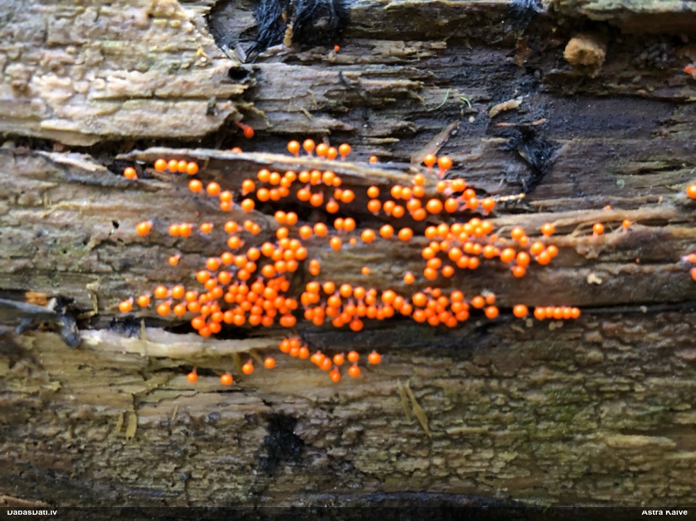 Šobrīd varu iedomāties 2 variantus - melnā plaispika Amaurochaete atra vai parastais gļotpūpēdis Reticularia lycoperdon. Pēc izmēra, augšanas laika un augšanas uz apstrādāta koka atbilst abas.