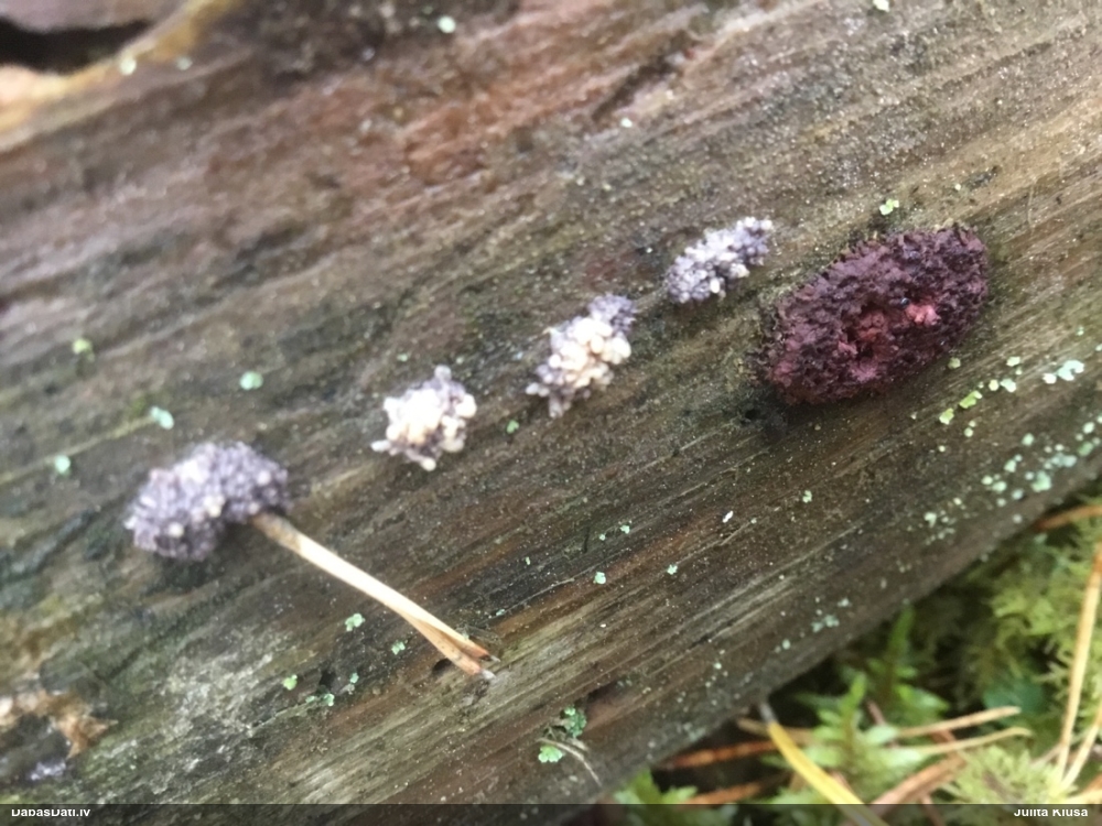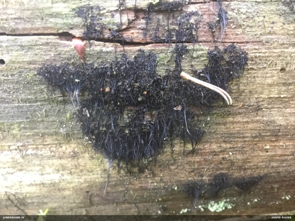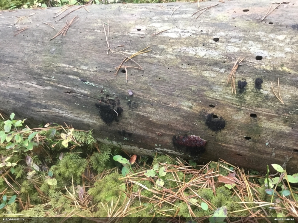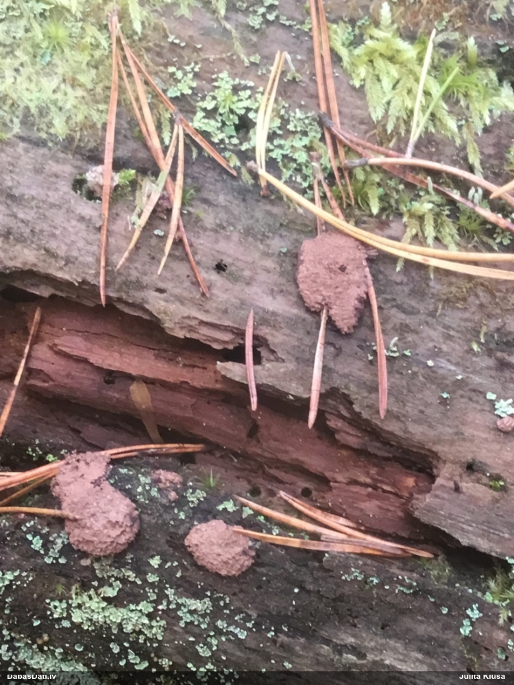 Šobrīd varu iedomāties 2 variantus - melnā plaispika Amaurochaete atra vai parastais gļotpūpēdis Reticularia lycoperdon. Pēc izmēra, augšanas laika un augšanas uz apstrādāta koka atbilst abas.