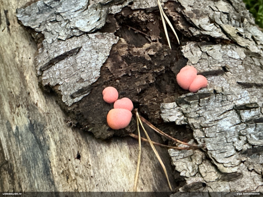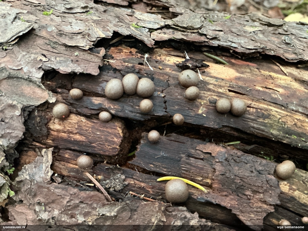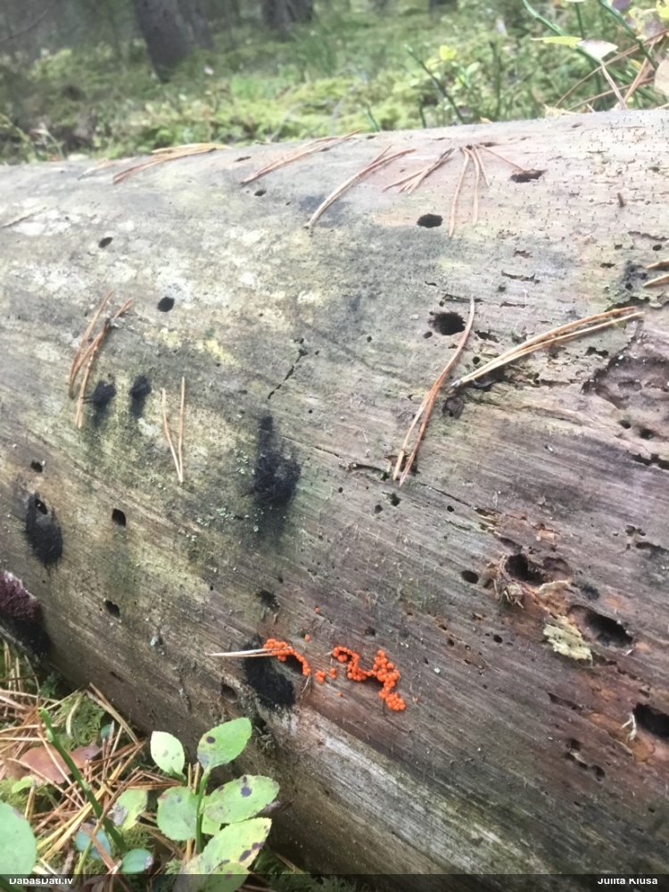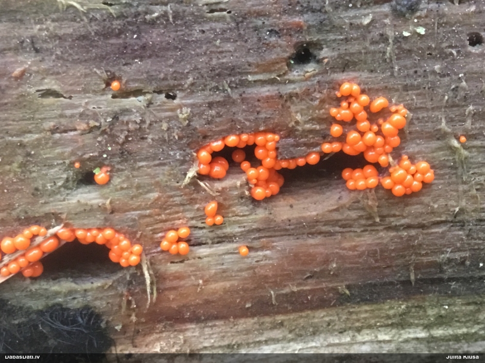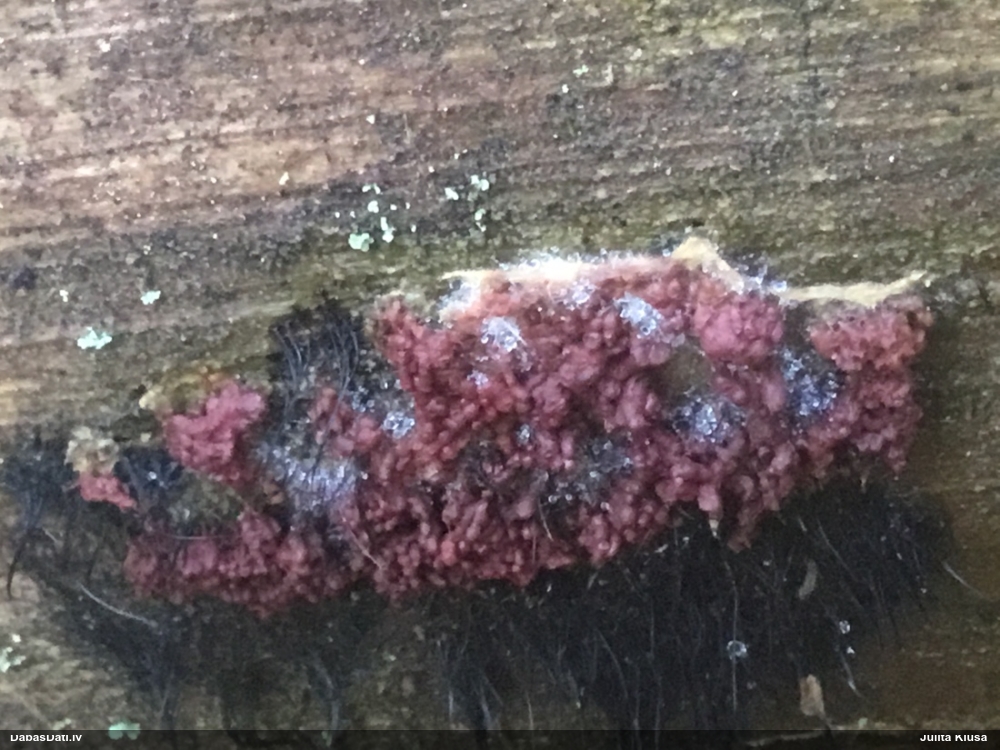 Šobrīd varu iedomāties 2 variantus - melnā plaispika Amaurochaete atra vai parastais gļotpūpēdis Reticularia lycoperdon. Pēc izmēra, augšanas laika un augšanas uz apstrādāta koka atbilst abas.