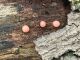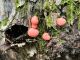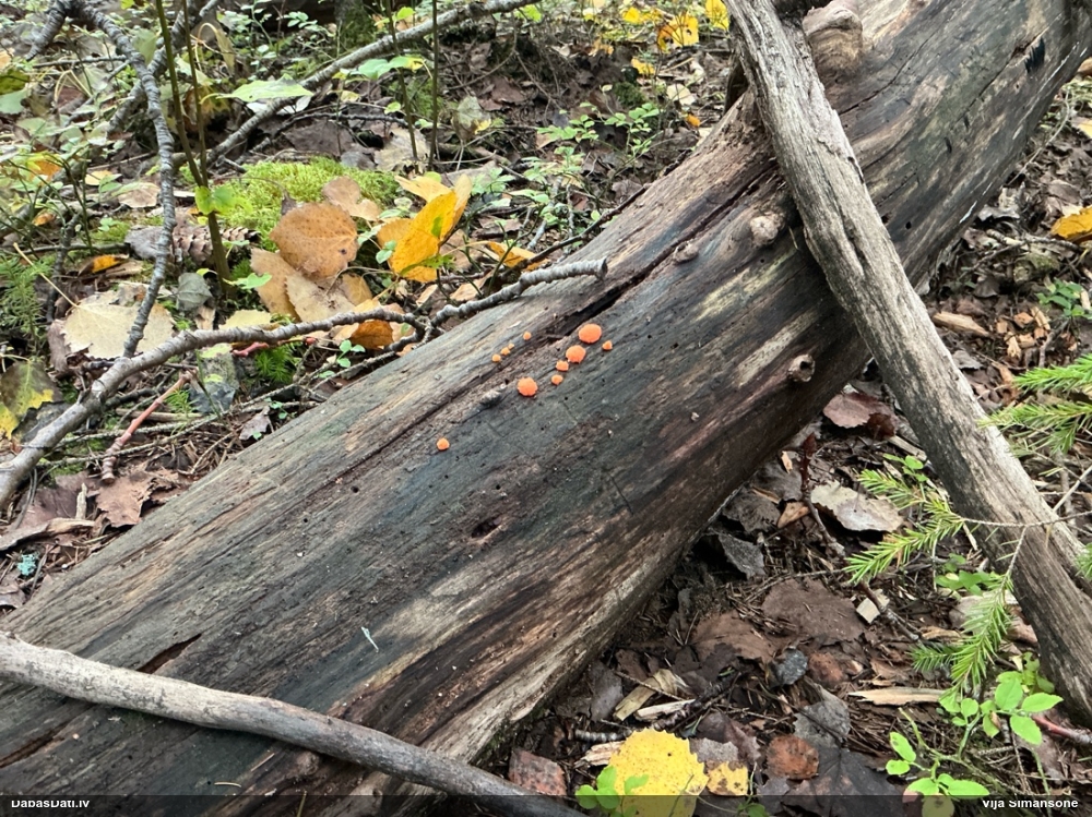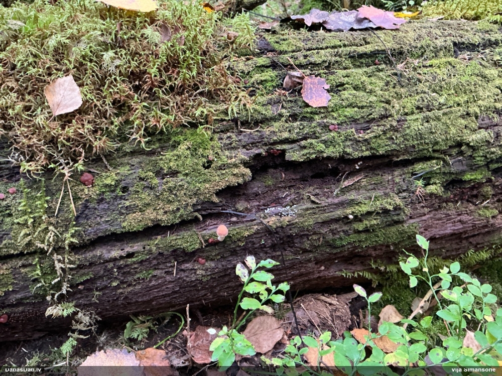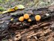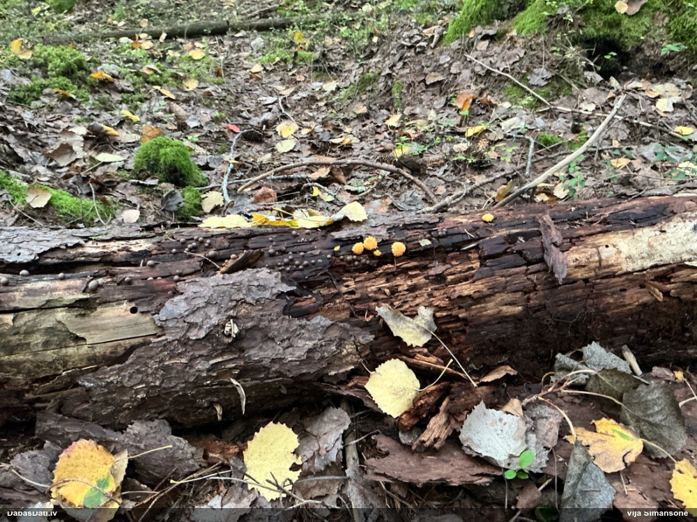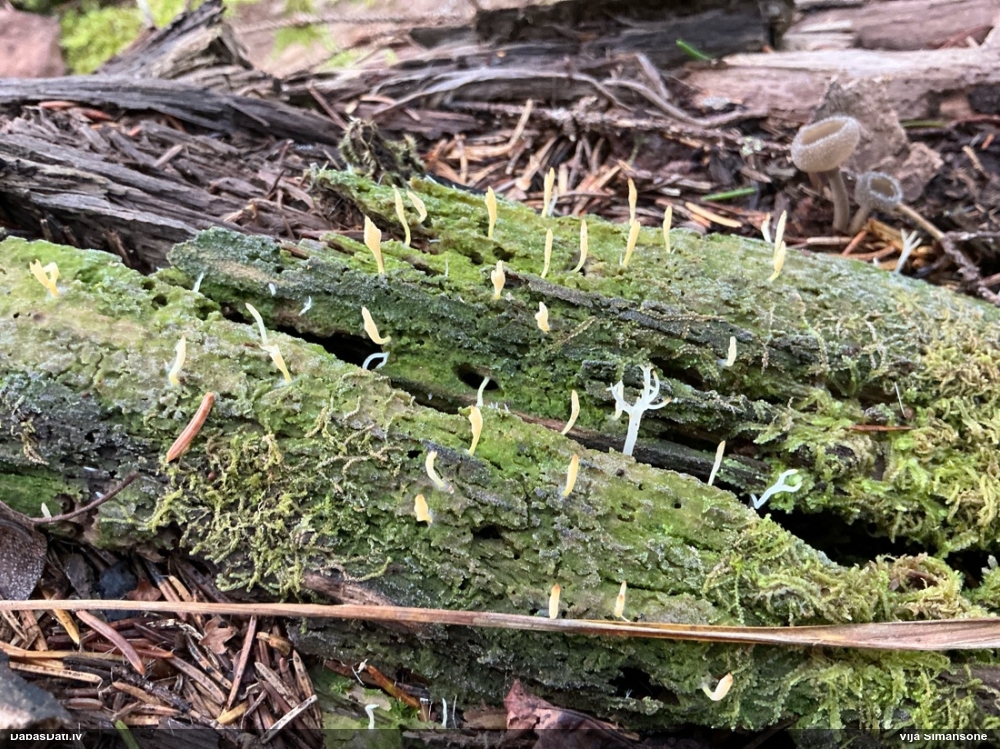 Man pēkšņi radās ideja - vai tur bija nu ļoti mitrs mikroklimats, egle ar melnalksni? Hipotētiski tādas dzeltenas var būt Diachea muscorum. Te bilde ir mazliet līdzīga: https://fr.wikipedia.org/wiki/Fichier:Craterium_muscorum,_Trawscoed,_North_Wales,_Aug_2016_-_Flickr_-_janetgraham84.jpg