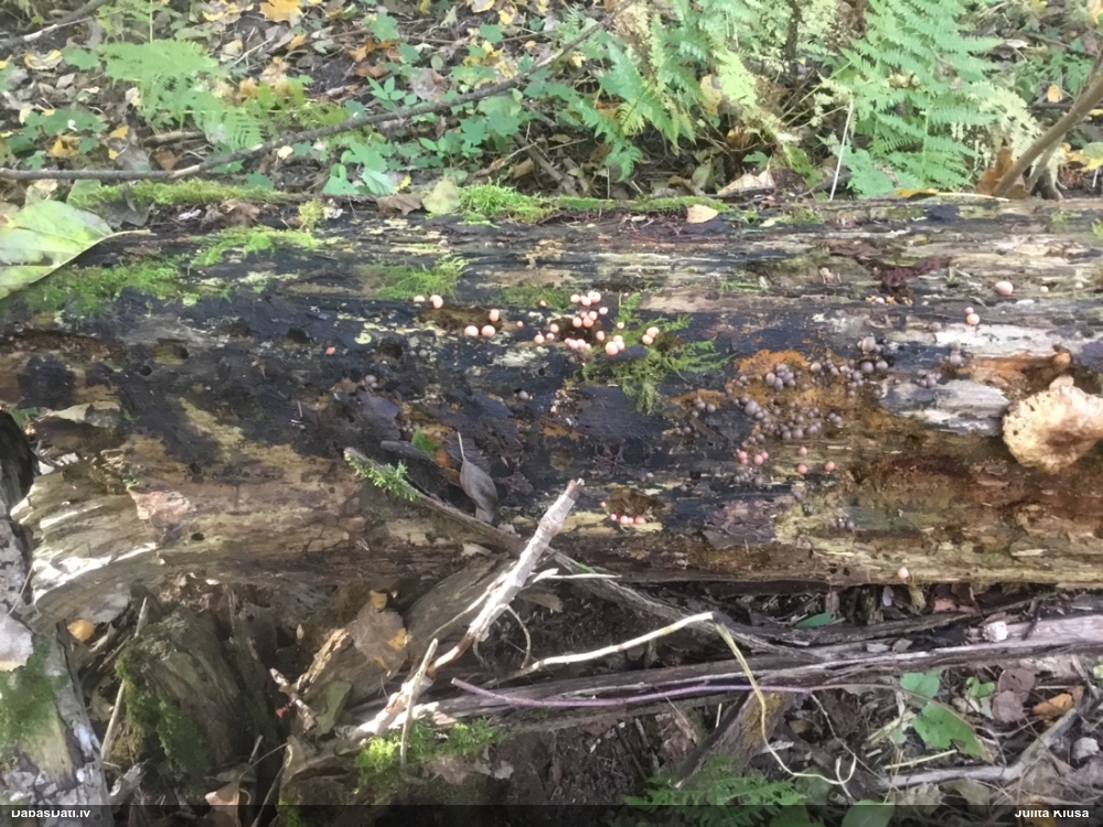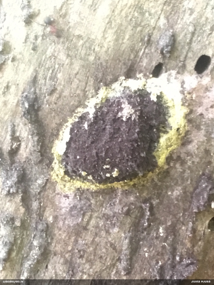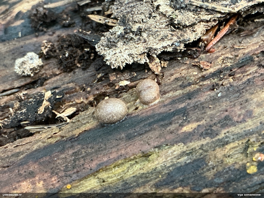 Šobrīd varu iedomāties 2 variantus - melnā plaispika Amaurochaete atra vai parastais gļotpūpēdis Reticularia lycoperdon. Pēc izmēra, augšanas laika un augšanas uz apstrādāta koka atbilst abas.