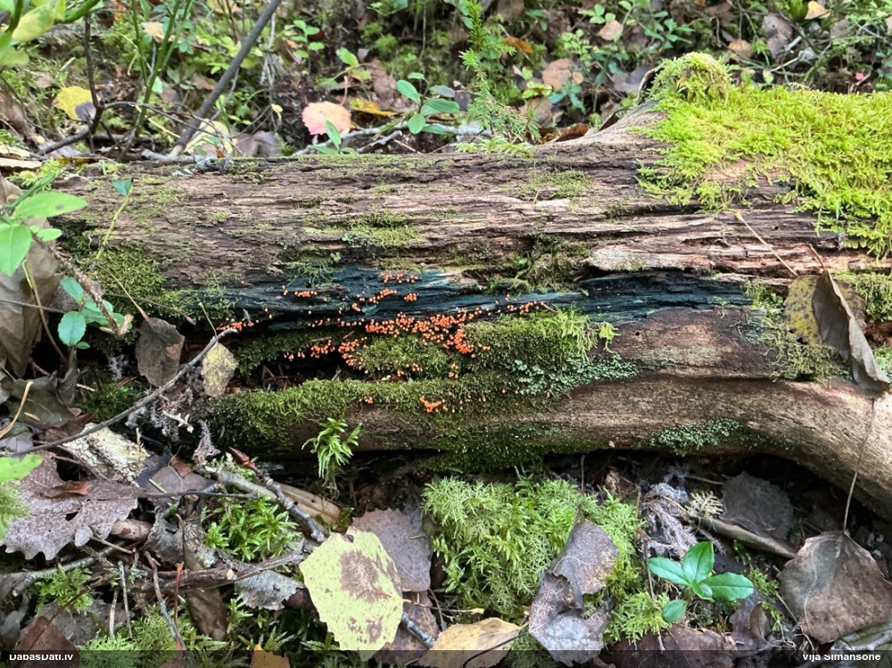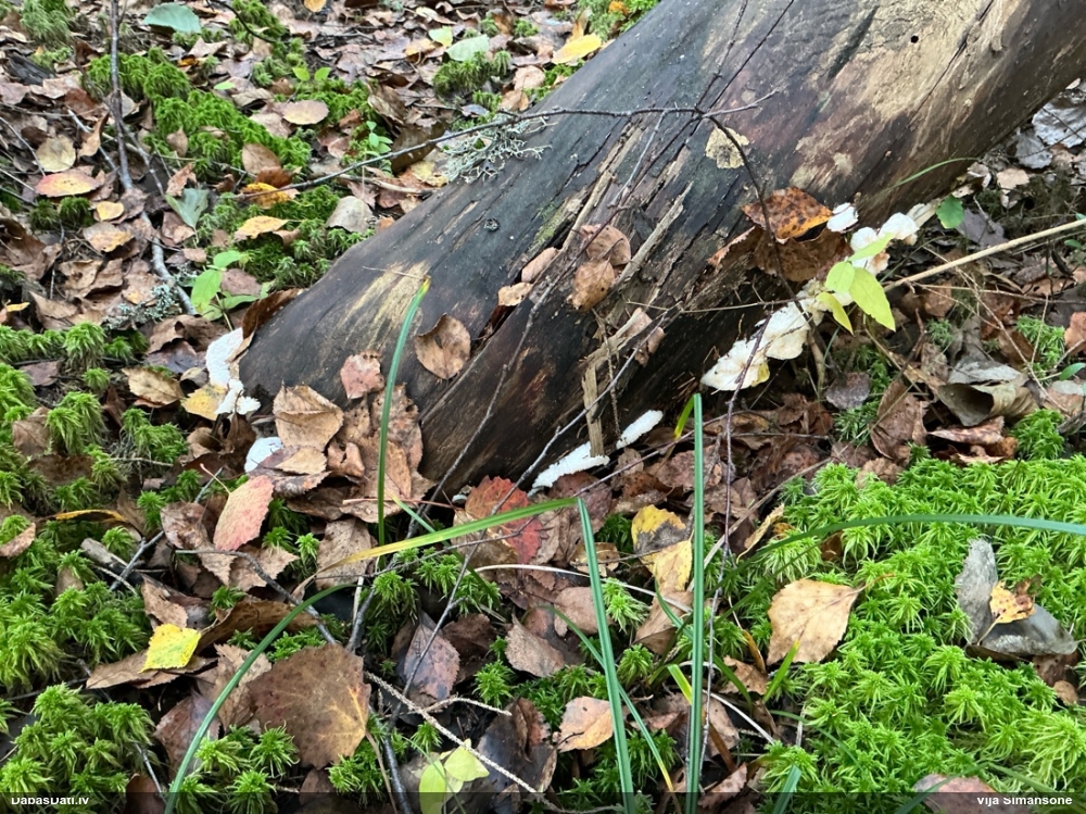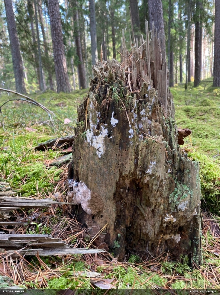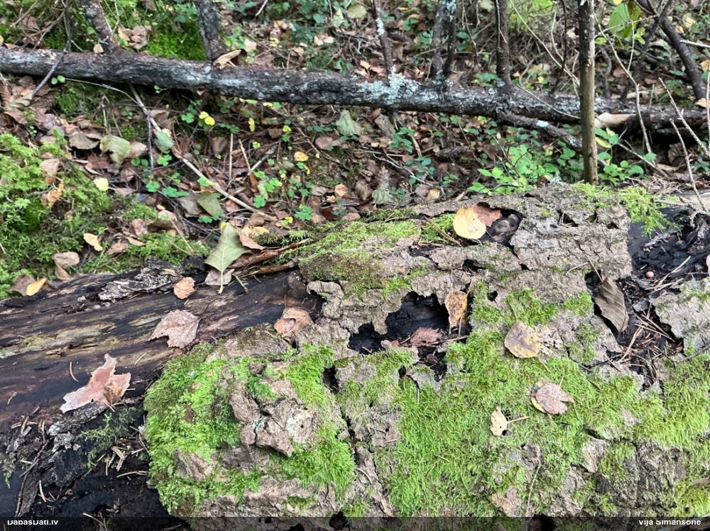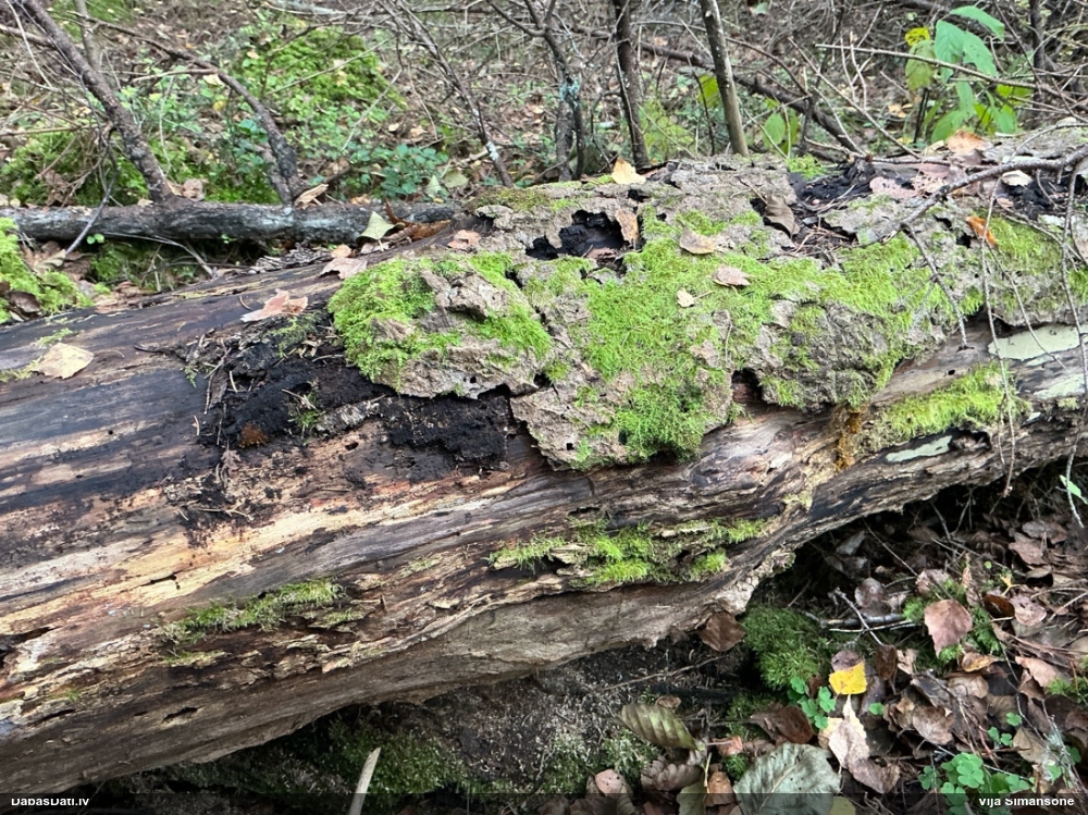 Satrūdējusi kritala mežā, nav dēļi. Iespējams, egle, jauktu koku mežs.