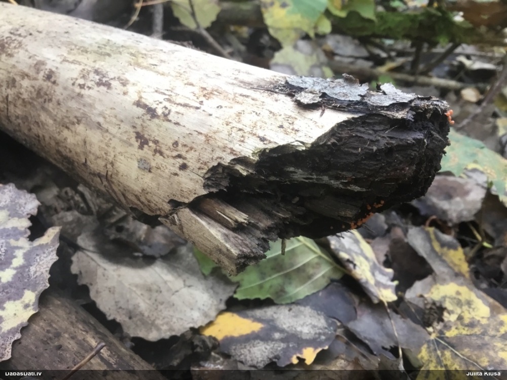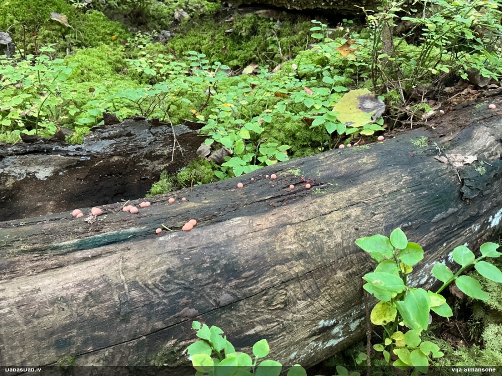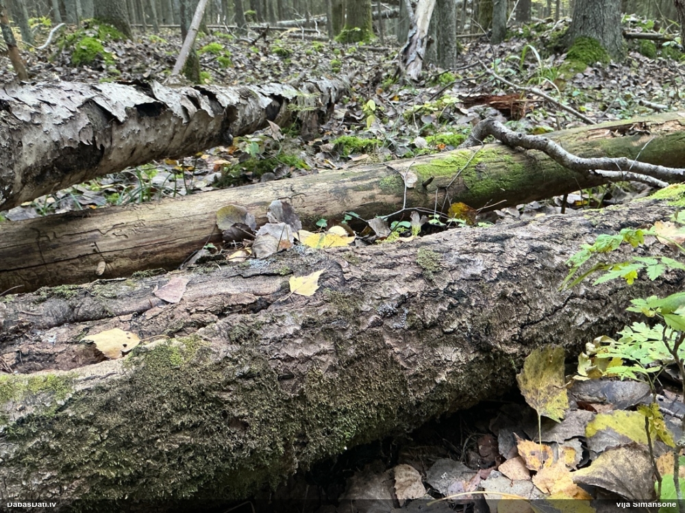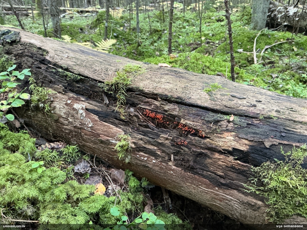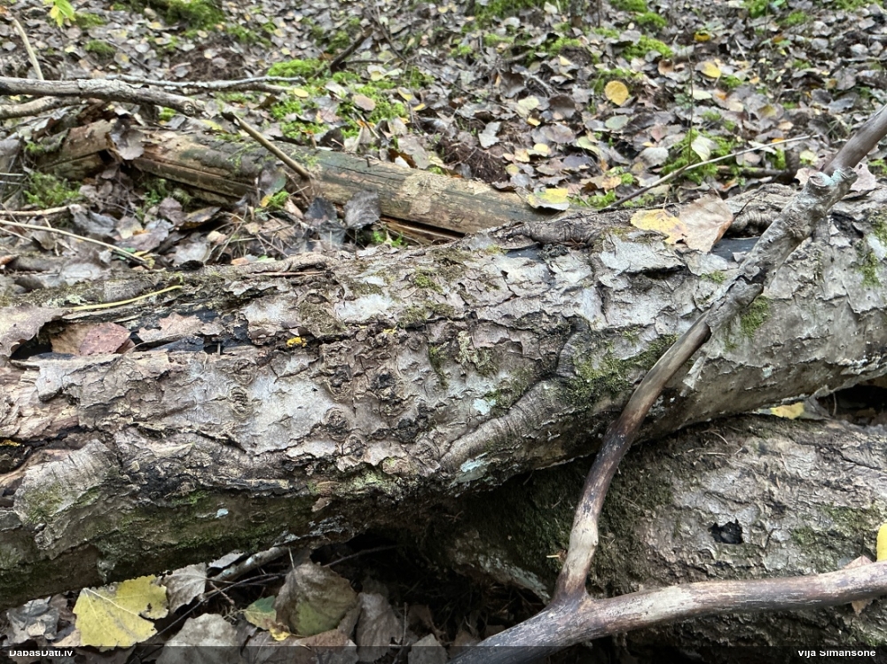 Satrūdējusi kritala mežā, nav dēļi. Iespējams, egle, jauktu koku mežs.
