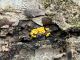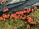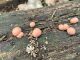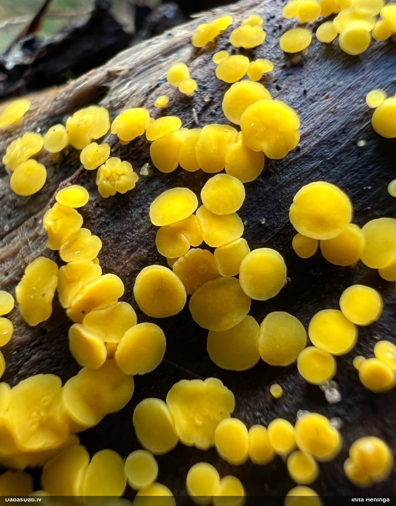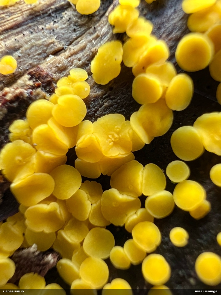 Man pēkšņi radās ideja - vai tur bija nu ļoti mitrs mikroklimats, egle ar melnalksni? Hipotētiski tādas dzeltenas var būt Diachea muscorum. Te bilde ir mazliet līdzīga: https://fr.wikipedia.org/wiki/Fichier:Craterium_muscorum,_Trawscoed,_North_Wales,_Aug_2016_-_Flickr_-_janetgraham84.jpg